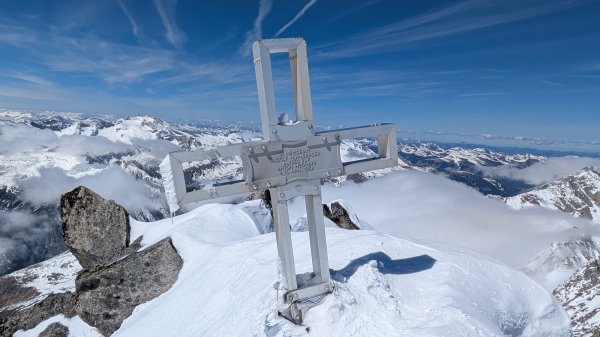 Von dort die Hälfte der Strecke bis zur Materialseilbahn noch zu Fuß, dann geht's mit Ski über die Normalroute bald nach der Materialseilbahn rechts hinauf. Vom Skidepot zum Gipfel neu gespurt, heuer relativ anspruchsvoll an zwei 2er Kletterstellen, jedoch ohne Steigeisen gut machbar, aber aufpassen auf Wächten.