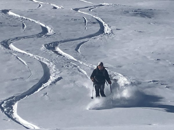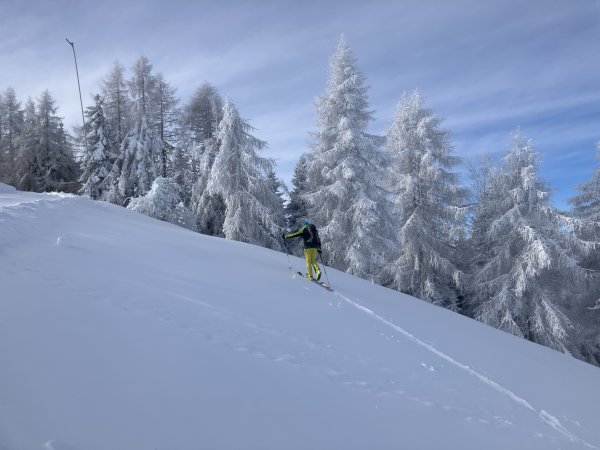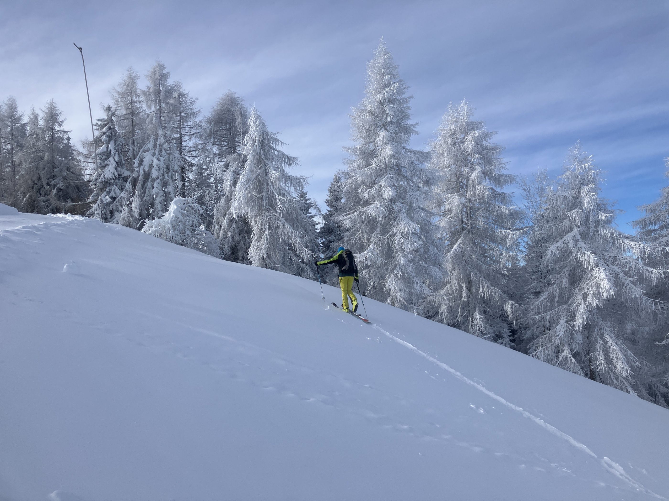 15–20 cm Pulver ohne Unterlage. Die Abfahrt im Gelände war im oberen Teil möglich – allerdings mit Abstrichen. Vor allem am Belag.