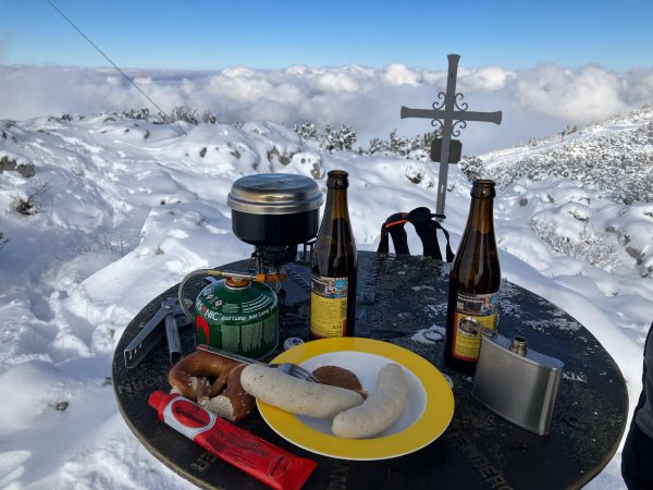 Weiß-Wurscht-Gipfel zum Saisonstart: Mit Weißwurstfrühstück inklusive persönlichem Höhenrekord. Die höchstgelegene Weißwurst meiner bisherigen Skitourenkarriere – auf 1.869 Metern. I bin ja gespannt, wer das diese Saison überbietet! ;-)