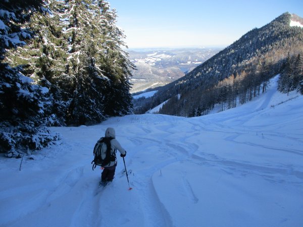 Die Parkgebühr beträgt 4 Euro. Heute ein kühler Start bei - 1o Grad. - Aufstieg über die Mehlsackalm - aber Achtung auf der Straße zur Mehlsackalm gibt es bei Waldarbeiten ein befristetes Forstliches Sperrgebiet! Abfahrt über die Stubneralm. Bei der Abfahrt ist wegen fehlender Unterlage auch bei einer Schneehöhe von teilweise ca.30- 40cm eine