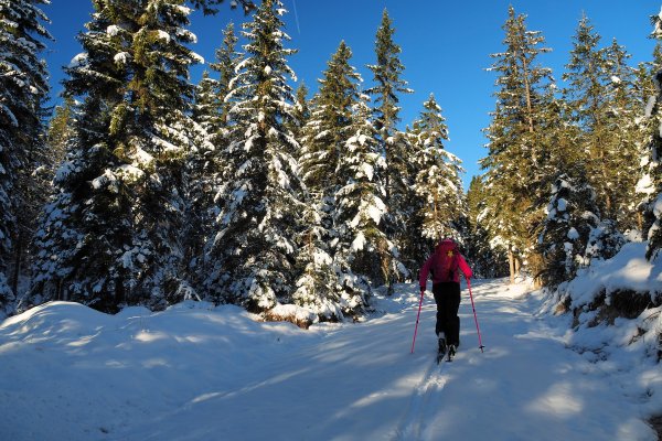 Vom Gscheid weg in Richtung Krumbach ausreichend Schnee und angenehm kalt; nach oben hin rasch wärmer und in besonnten Bereichen wenig, und immer weniger Schnee...