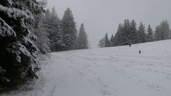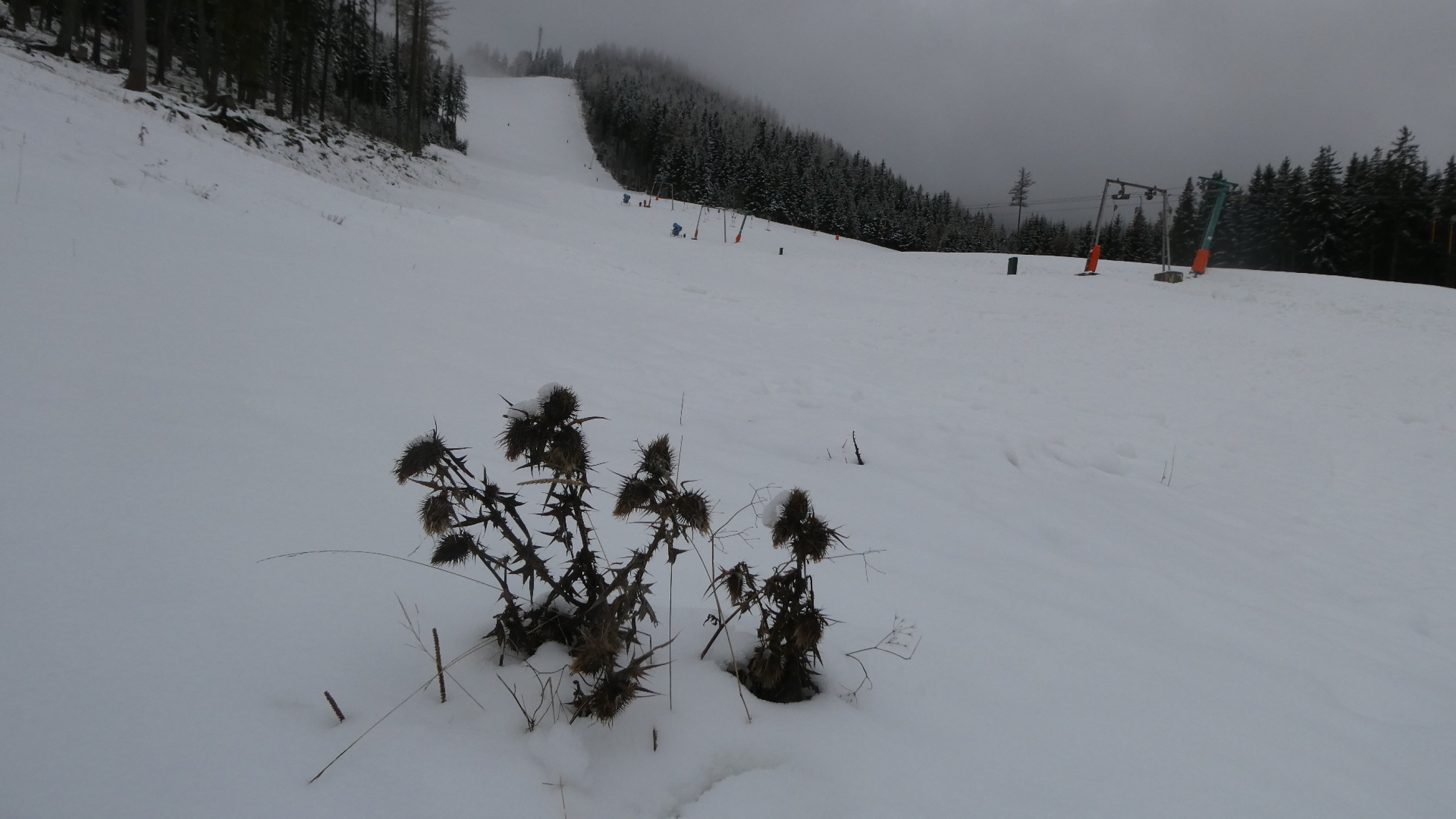 Auf der Teichalm hat es etwa 2 cm nassen Schnee geschneit. Mit "Gras-Ski" kann man vom Teichalmsee bis zur Bergstation aufsteigen und abfahren.