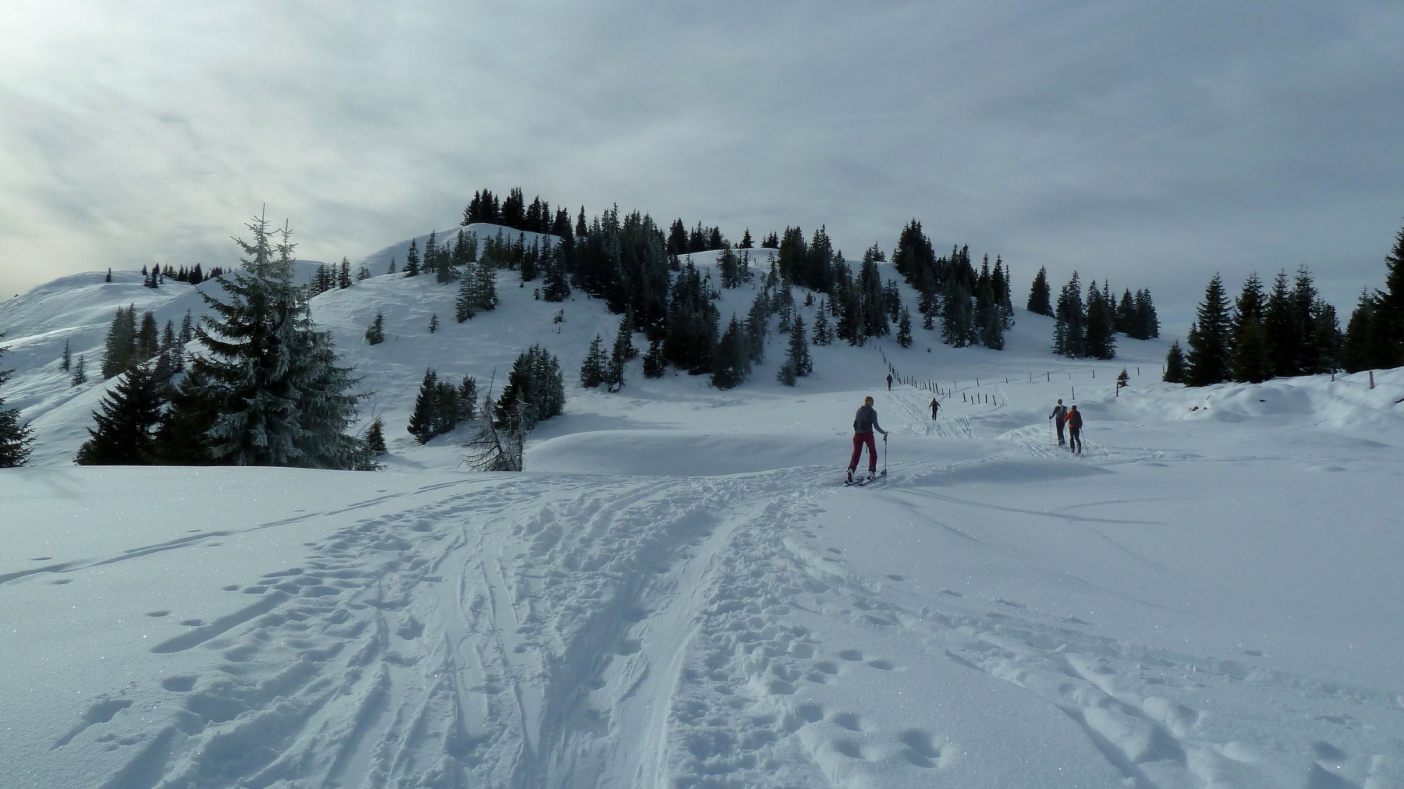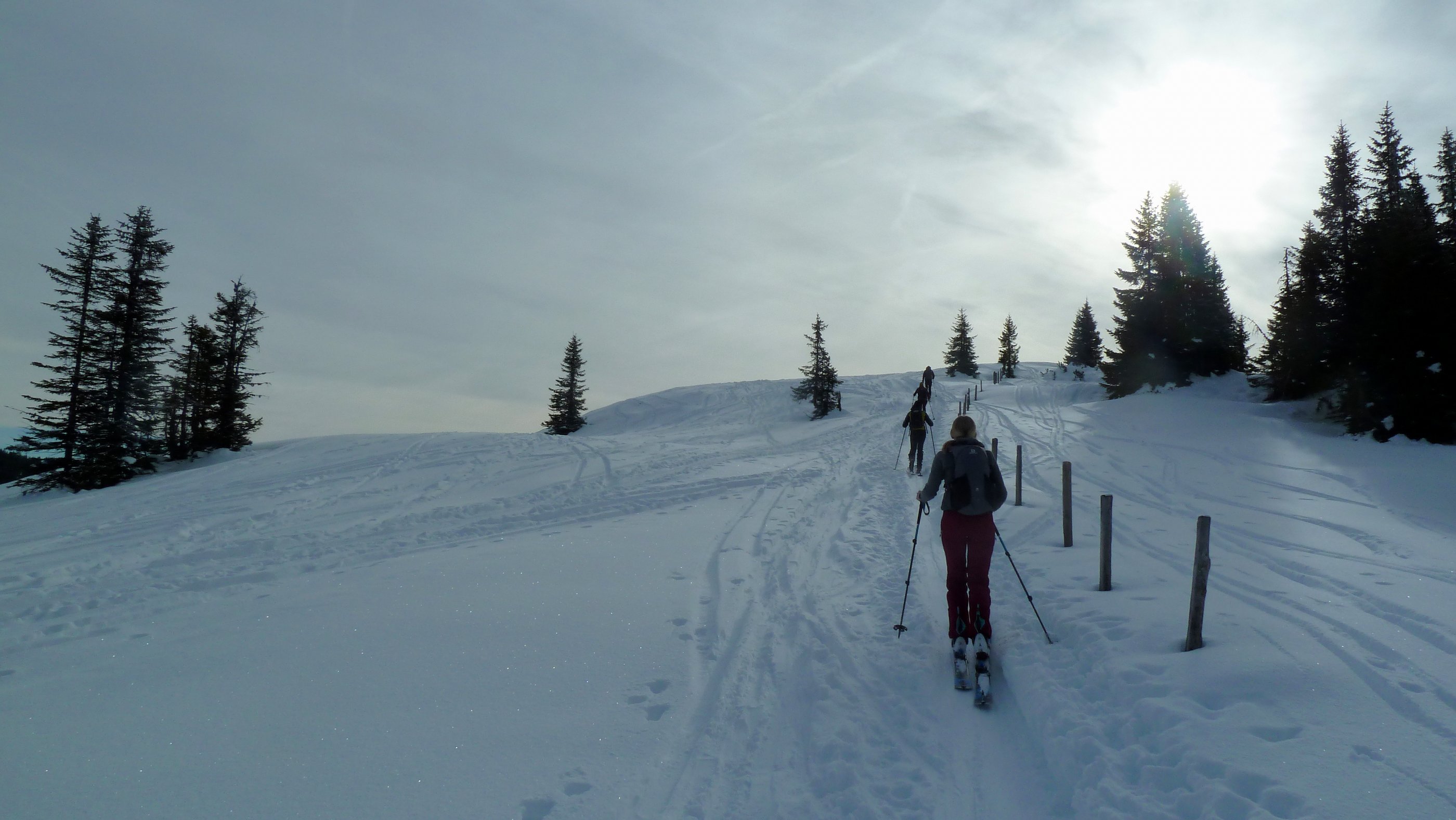 Nach der kurzen Abfahrt vom Parkplatz biegen wir gleich rechts ab in den vielbegangenen Aufstieg durch den Auwald. Vom gestrigen Schneefall ist nicht viel zu bemerken, aber auch im unteren Teil im dichten Wald ist die Schneelage ausreichend, weiter oben im lichten Wald für einen Aufstieg fast üppig. Auch zum Kollmansegg und weiter zum Ahornstein begleitet uns winterliches Ambiente.