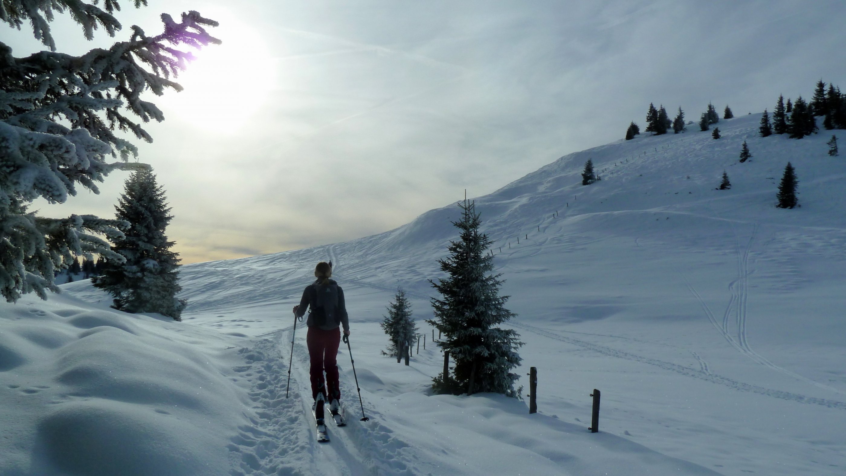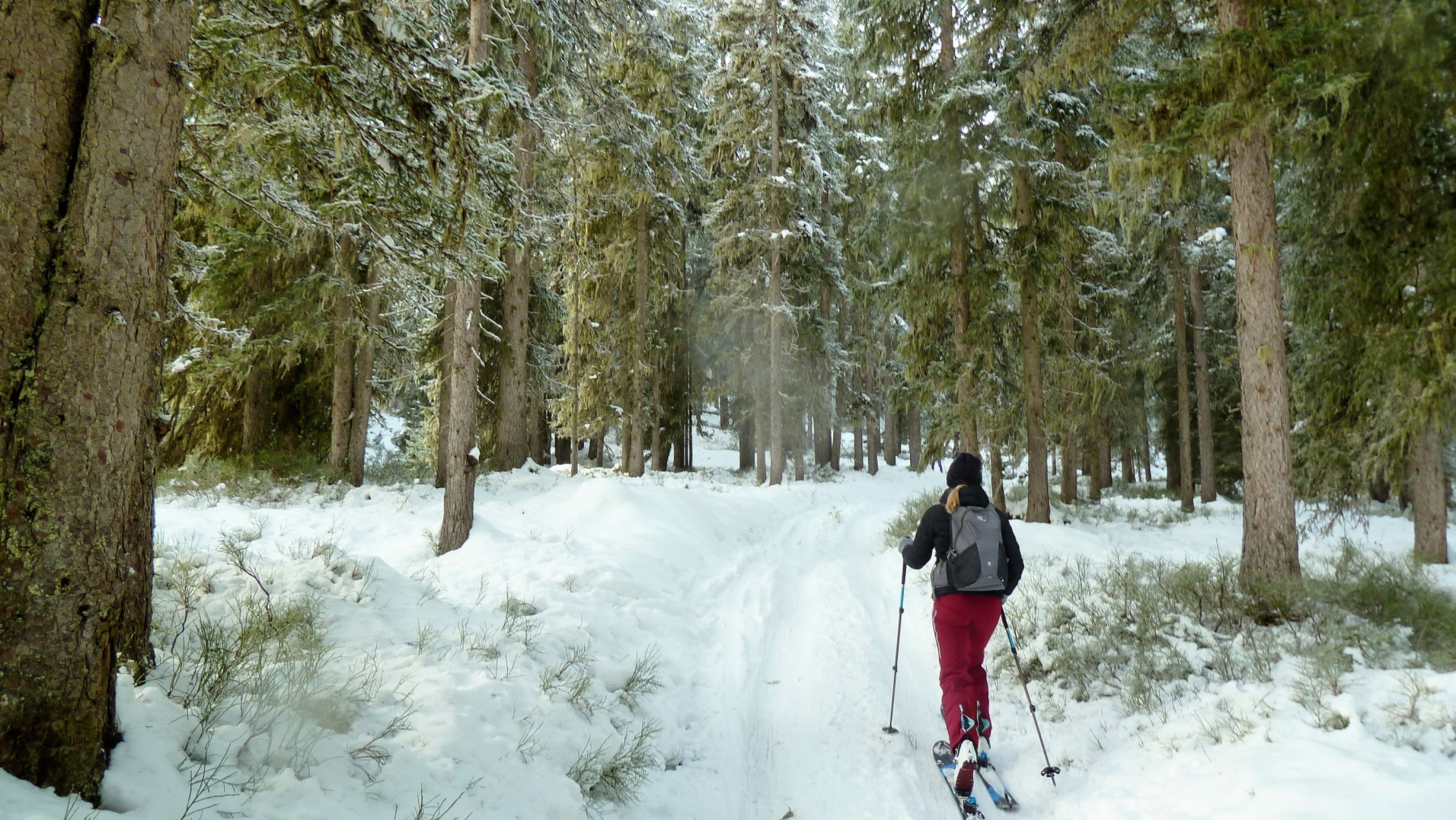 Die Schneelage ist mager, für den Aufstieg aber gut ausreichend, die drei Zentimeter Neuschnee von gestern bescheren in der Sonne ein hübsches Glitzern, für die nächsten Tauwettertage aber keine ausreichende Unterlage. Die sonnenhangseitige Abfahrt bis zur Piste war noch gut möglich, aber das wird in den nächsten Tagen Geschichte sein. Die Forststraße von unterhalb der Tiergartenalm zum Ausgangspunkt glänzt stellenweise bereits mit Straßenschotter.