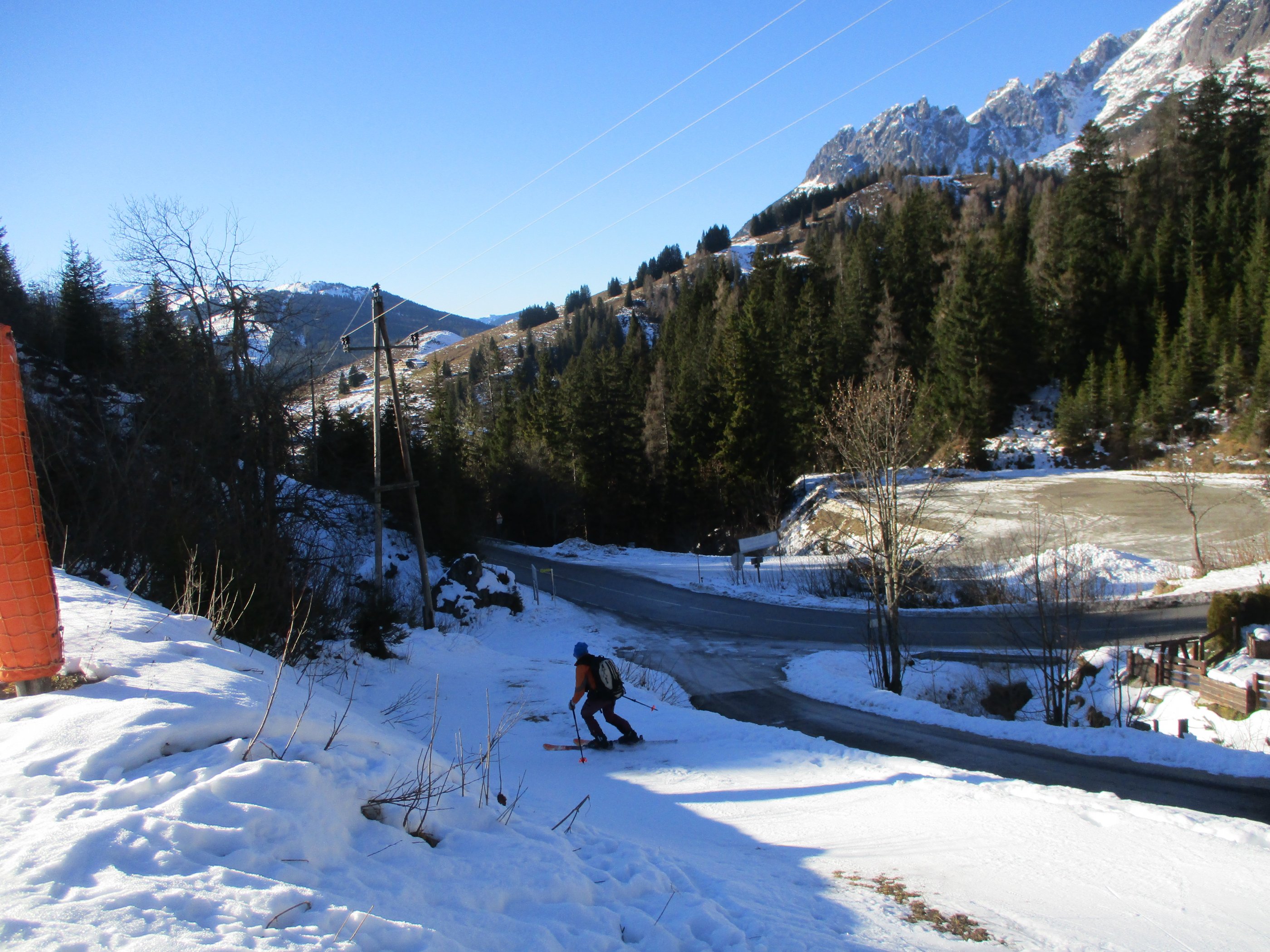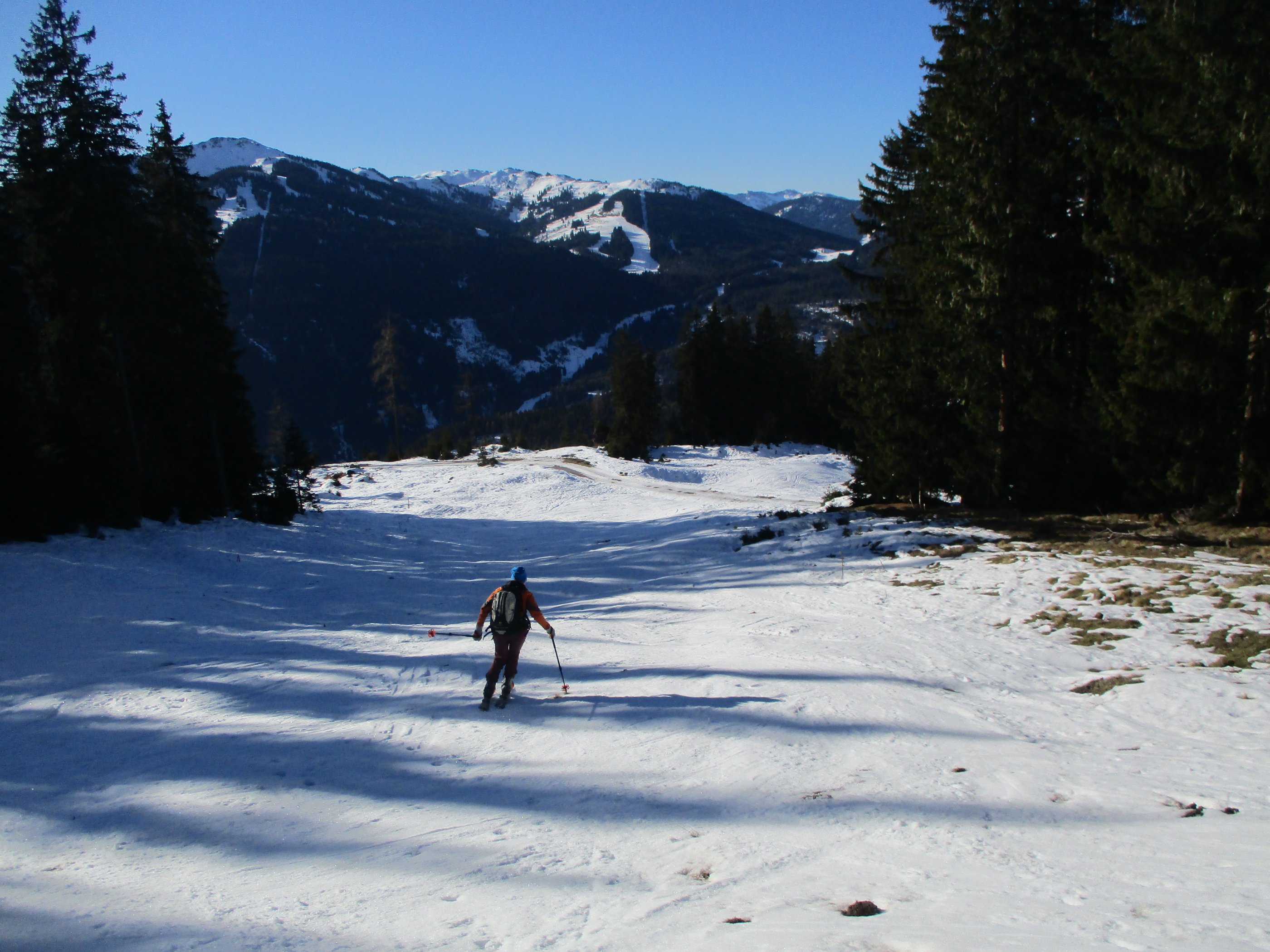 Schneedecke bei der Abfahrt um 13 Uhr in der Sonne teilweise leicht aufgefirnt ,im Schatten bleibts hart und damit leider auch die alten Spuren