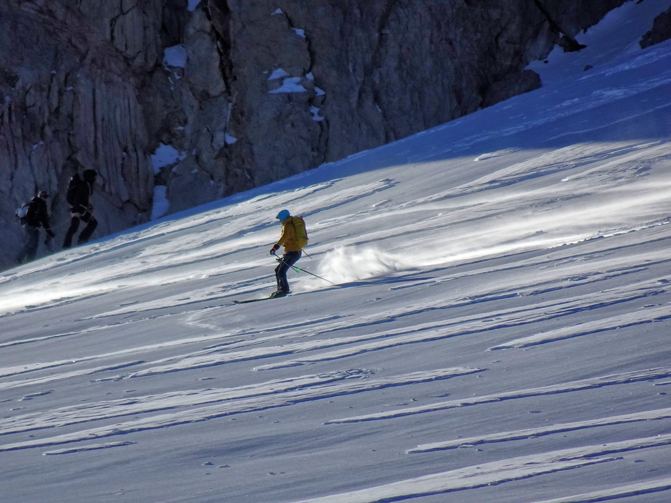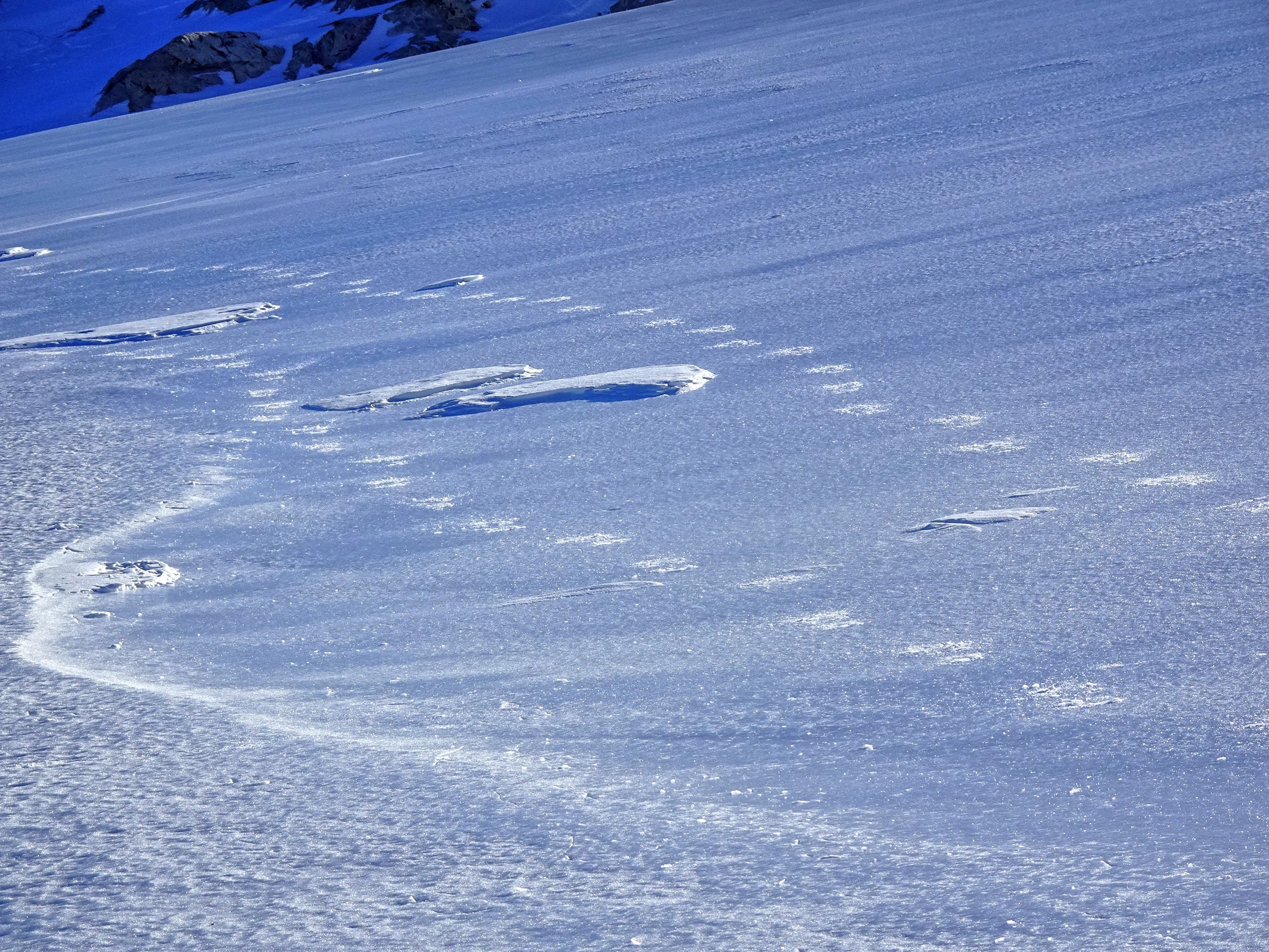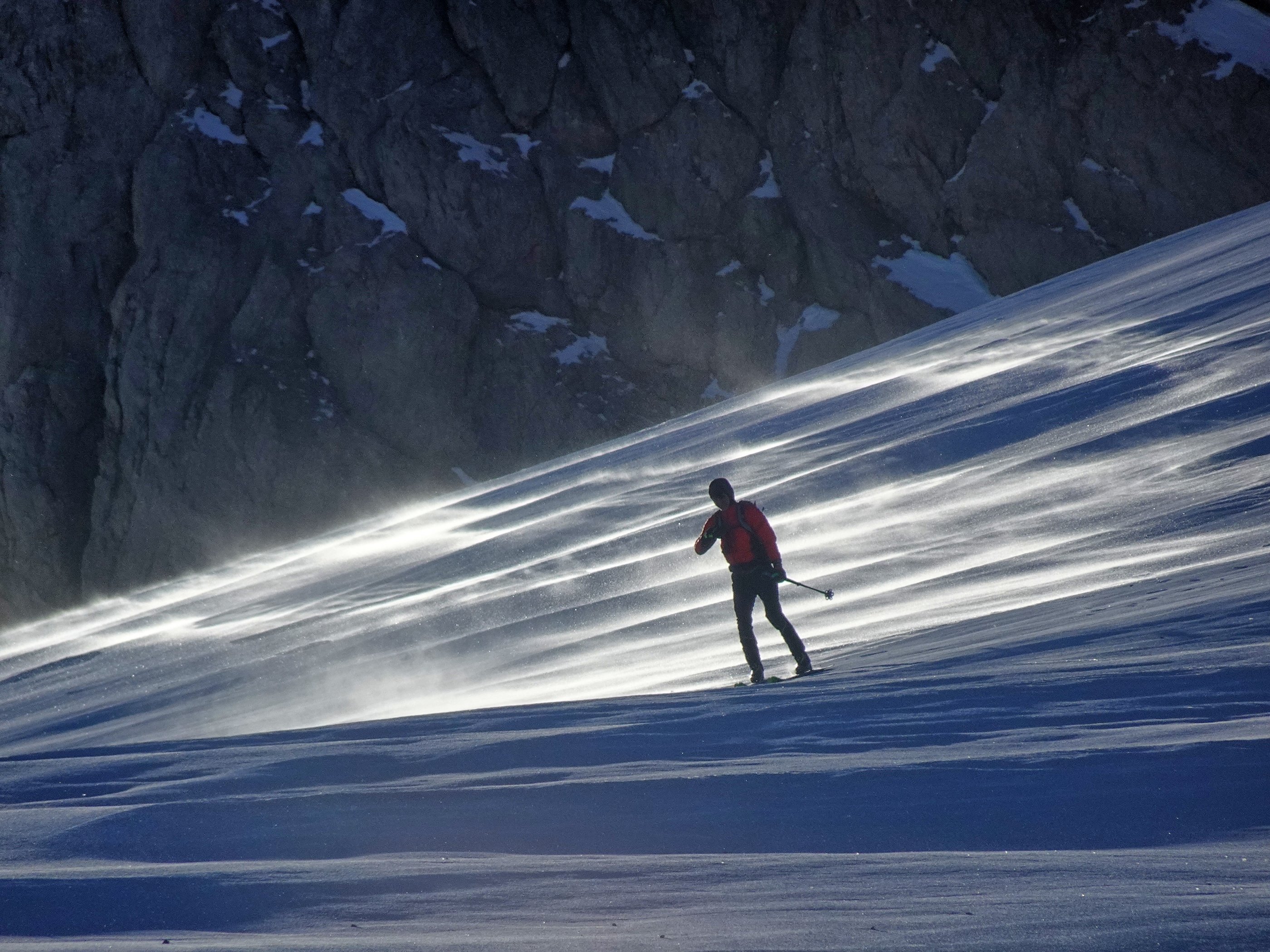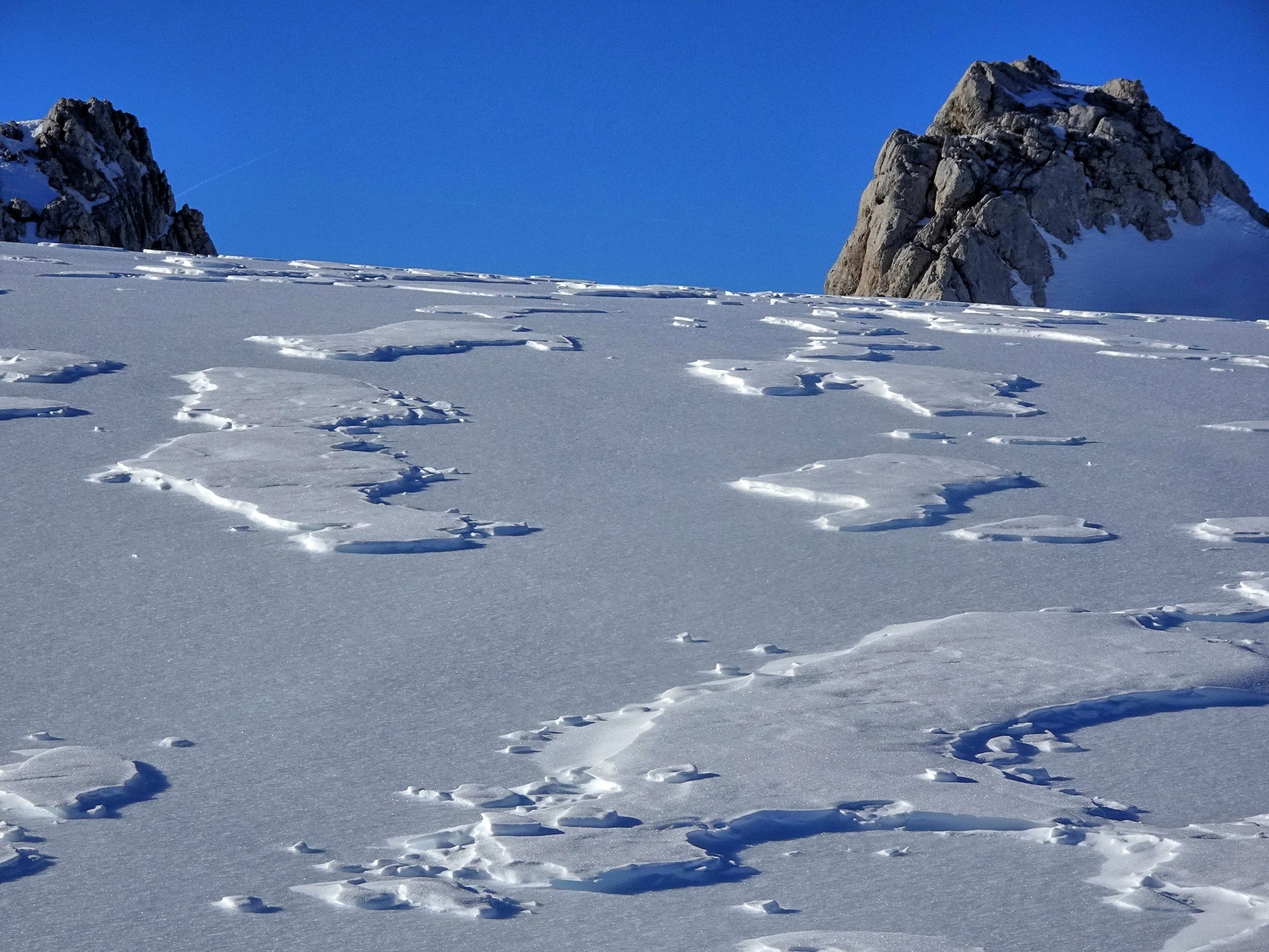 harter bis teils eisiger Harschdeckel, Abfahrt vor allem im steilen schattigen Gelände mit Absturzgefahr verbunden