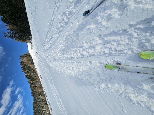 10-15 cm lockerer Schnee. Ein wenig eisige Altlasten wenn man sucht.