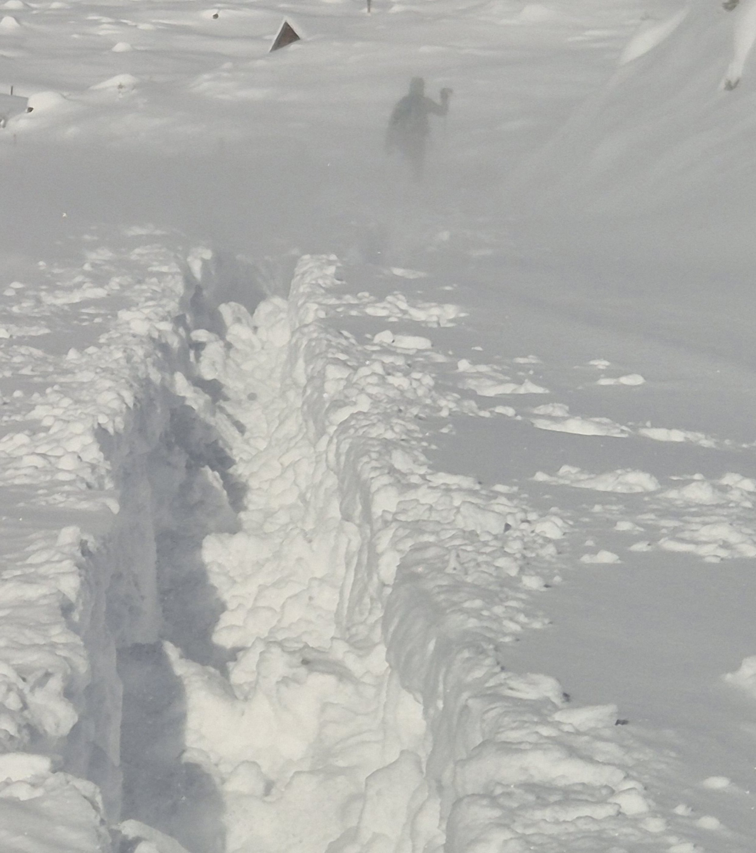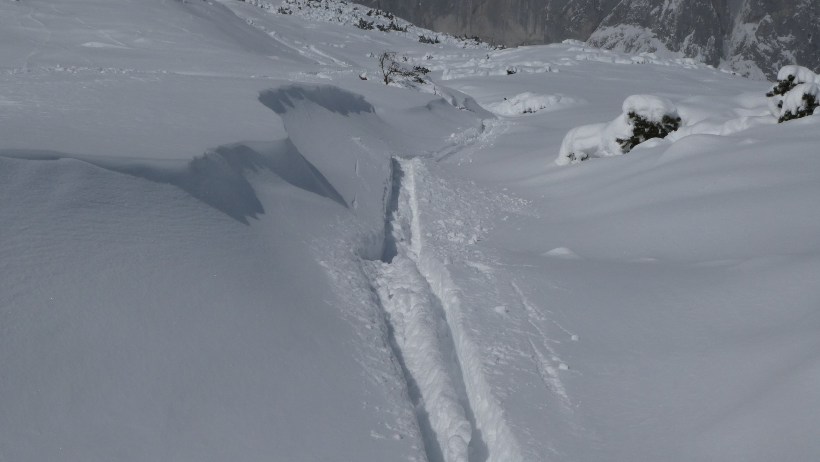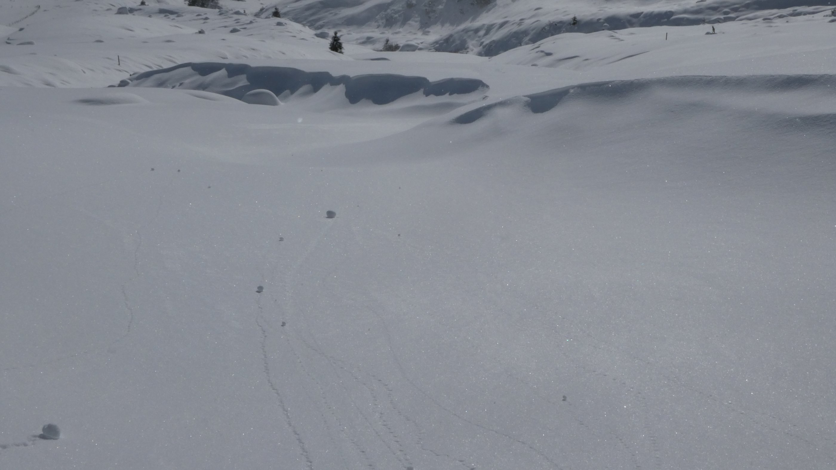 Gebundener von Wind und Sonne behandelter Schnee, tief zum Spuren; Fahren konnte man wo es steiler war oder in der Aufstiegsspur