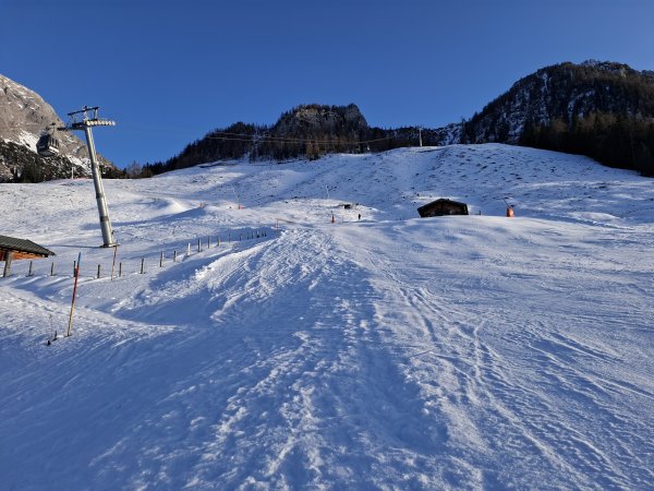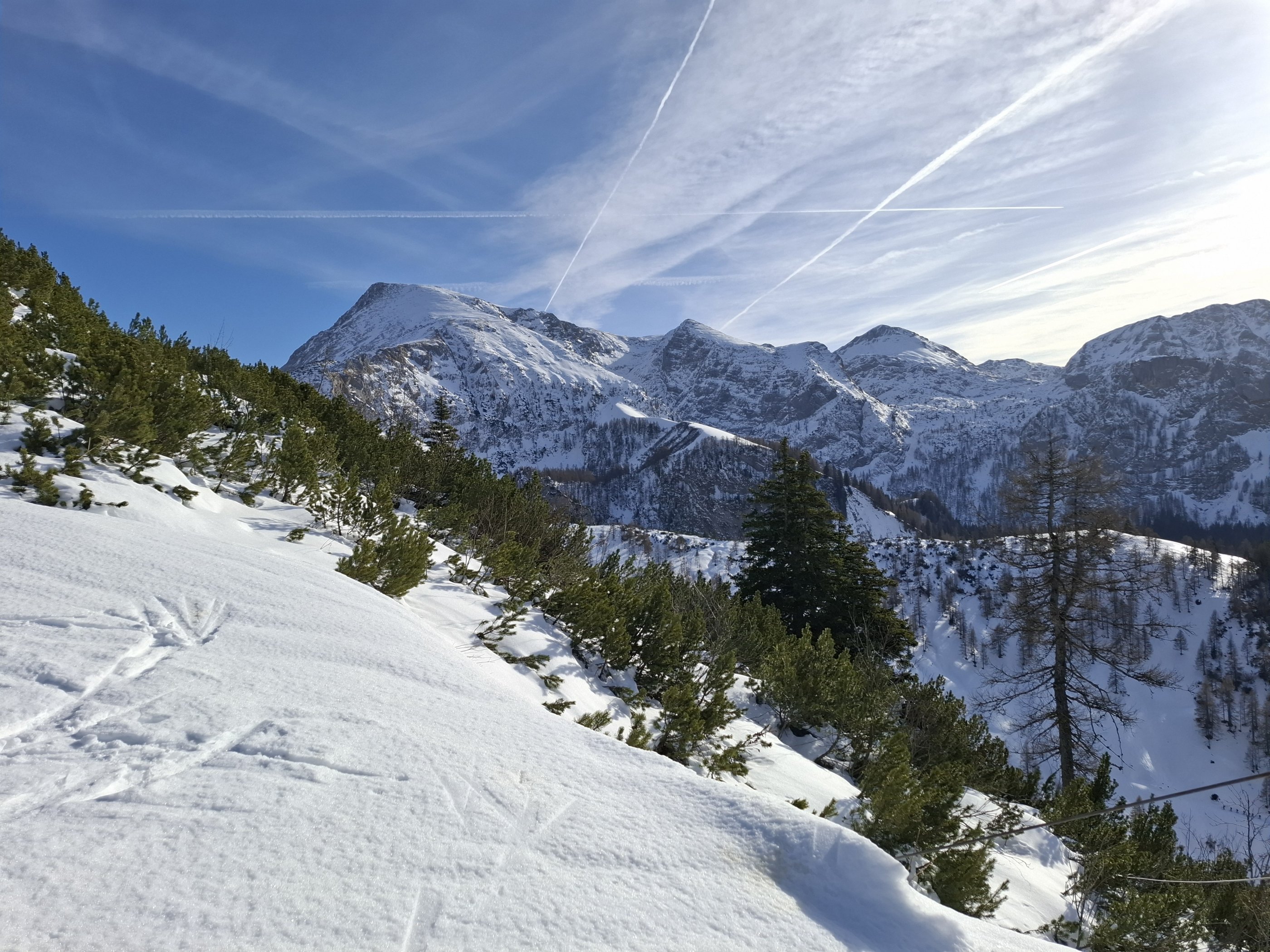 Vom Parkplatz Hinterbrand um 10:30 Uhr schon +3°C muß man die Ski bis zum beginn der Jennerwiesen tragen. Ziehweg hat viele apere Stellen und Blankeispassagen die man am Rand aber gut gehen kann. Aufstieg überJennerwiese Mitterkaseralm zum Stahlhaus. Für Aufstieg und Abfahrt reicht die Schneelage. Alles gut eingefahren Weg zur Mitterkaseralm sehr gut. Wetter sonnig und warm kein Wind gute Fernsicht