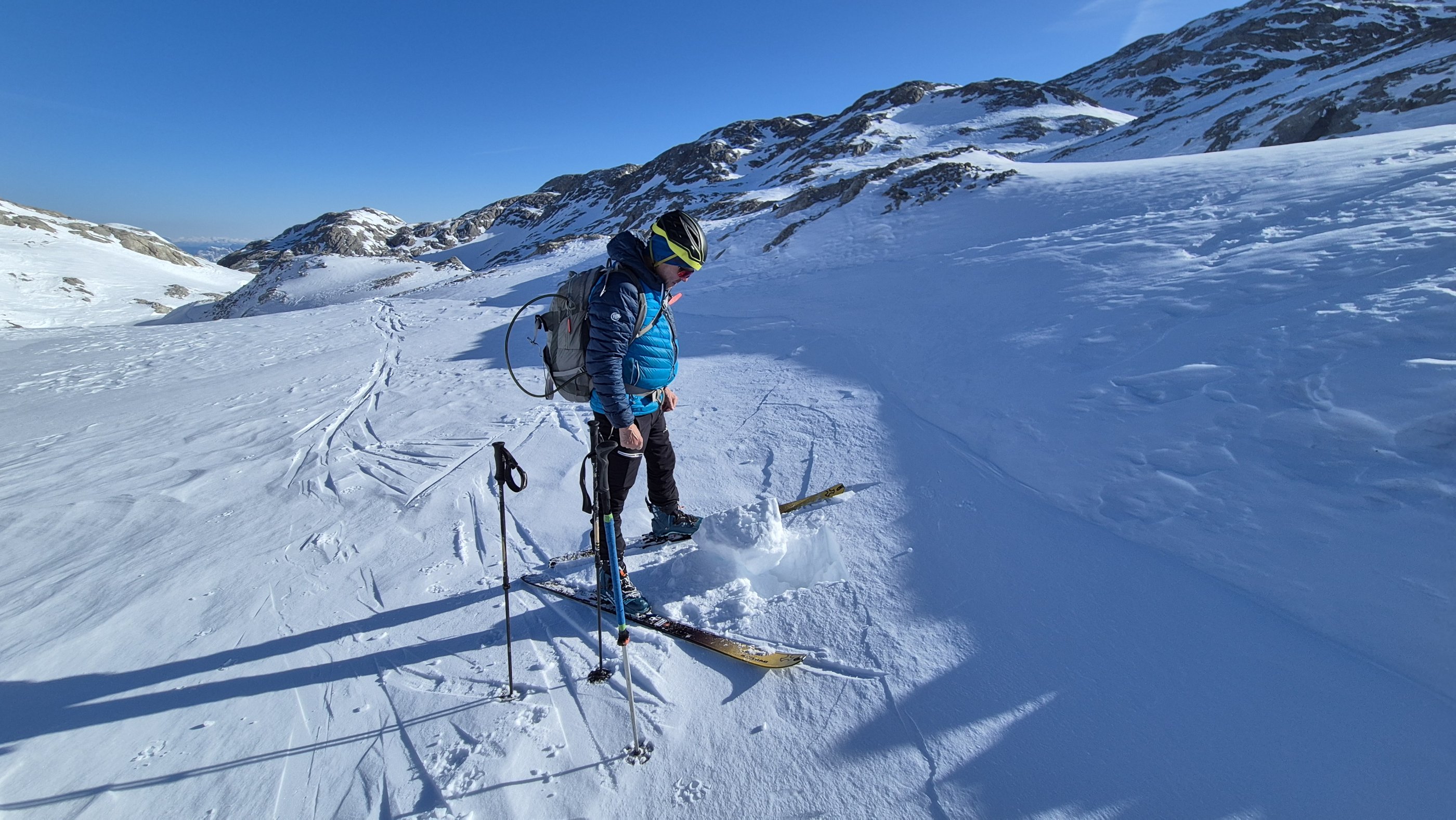 Die 2 x Wummgeräusche in flachen Mulden wurden in die Planung der weiteren Spuranlage mit einbezogen. Der im Hüttenhang gemachte ECT Test zeigte für diesen Bereich keine Gefahr; siehe Foto. Wegen der unterschiedlichen Schneeoberflächen der aperen oder nur knapp bedeckten Stellen hatte ich etwas Respekt vor der Abfahrt. Das Hinunterfahren ging aber wirklich gut, bis zur Torsäule hat der Harschdeckel getragen. Bis Mitte Ochsenriedl wars unterschiedlich, dann folgte schöner Pulfer. Die Querung von der Kasastatt hinaus war gut eingefahren. Foto 2 und 8 stammen von Roman.