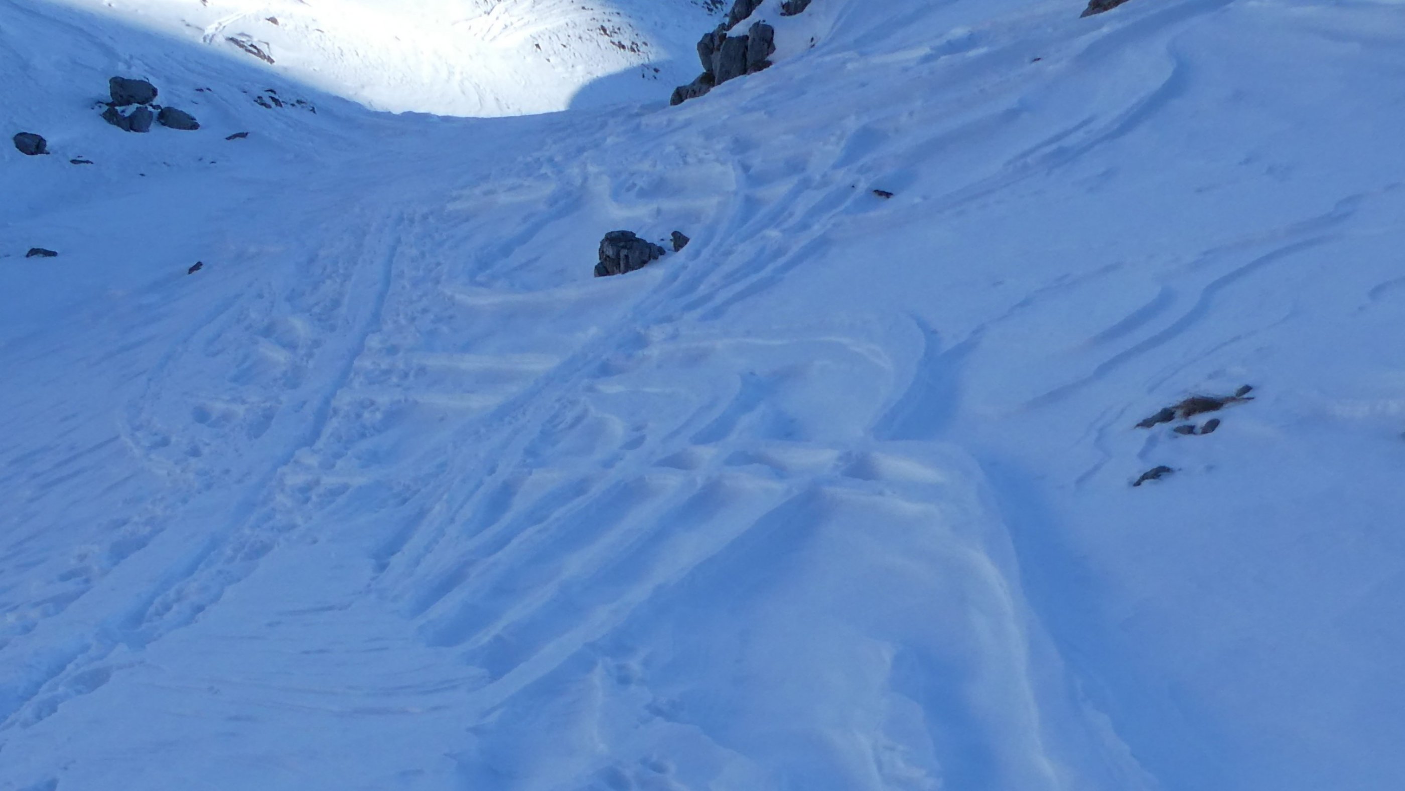 Der Wind hatte die letzten Tage ordentlich gearbeitet: abgeblasen, eingeblasen und die Schneedecke an vielen Stellen verdichtet. Er hat Spuren und auch Schwimmschnee freigelegt.