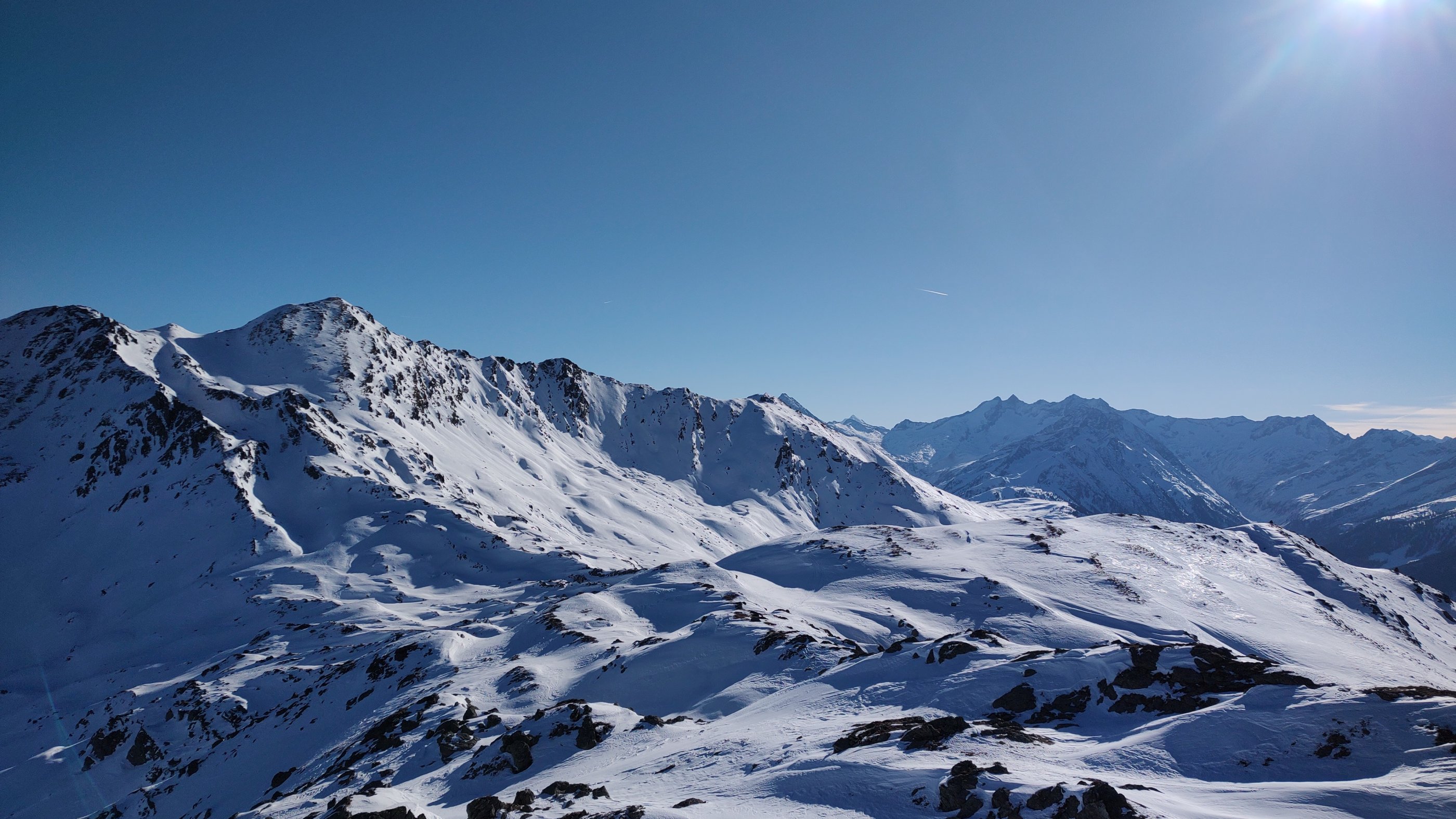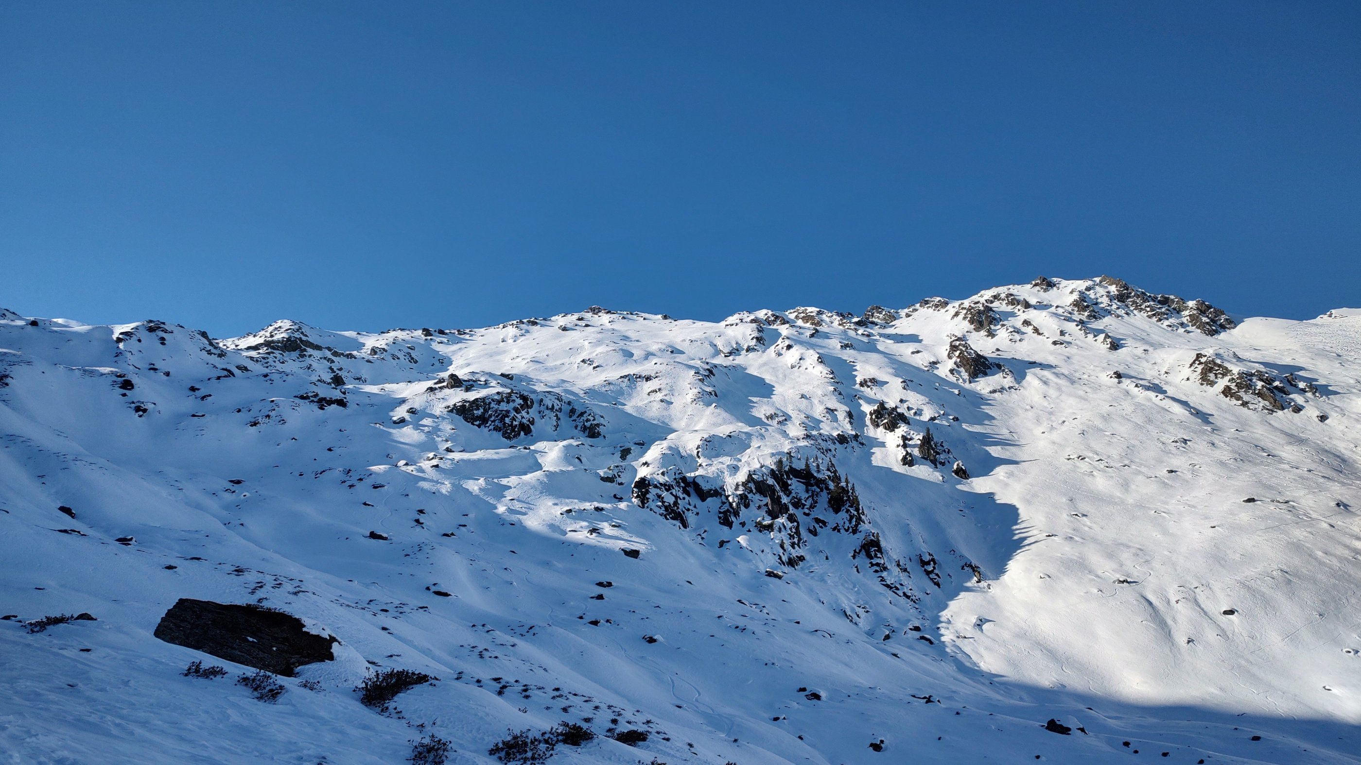 Extrem wenig Schnee im Langen Grund (Kelchsau). Die meisten Touren sind nicht sinnvoll möglich. Südseiten unten schneefrei, Nordseiten ausgeblasen, am ehesten gehen ostseitige Hänge und Mulden. Schöne Schwünge vom Kamm zwischen Pallscharte und Pallspitze hinab in den Talboden möglich. Trotzdem jederzeit Steinkontakt zu fürchten. Unten raus hilft die gut ausgefahrene Spur bzw. der Almweg, sodass man mit nur einmal kurz Absteigen im Wald zurück zum Parkplatz kommt.