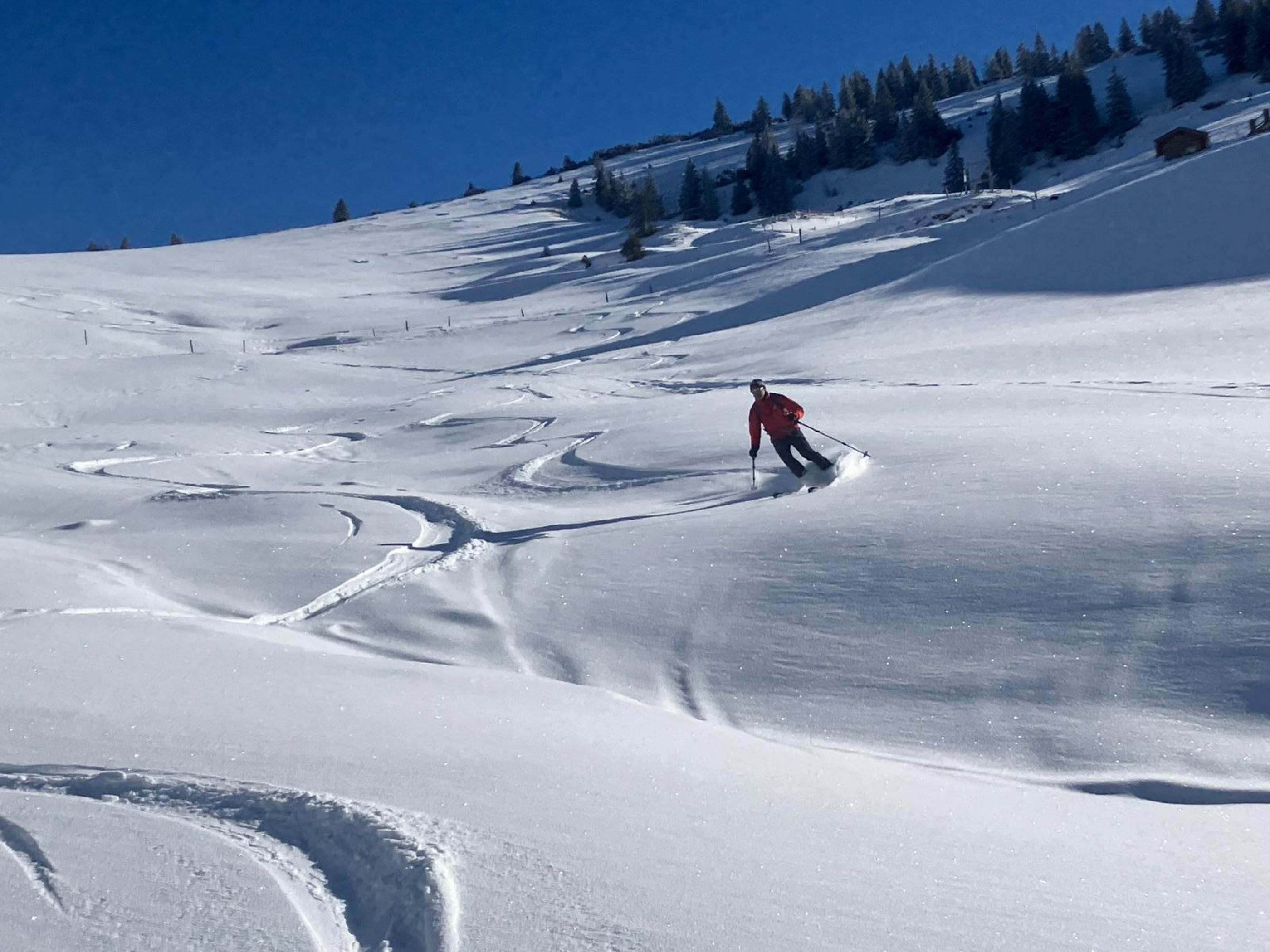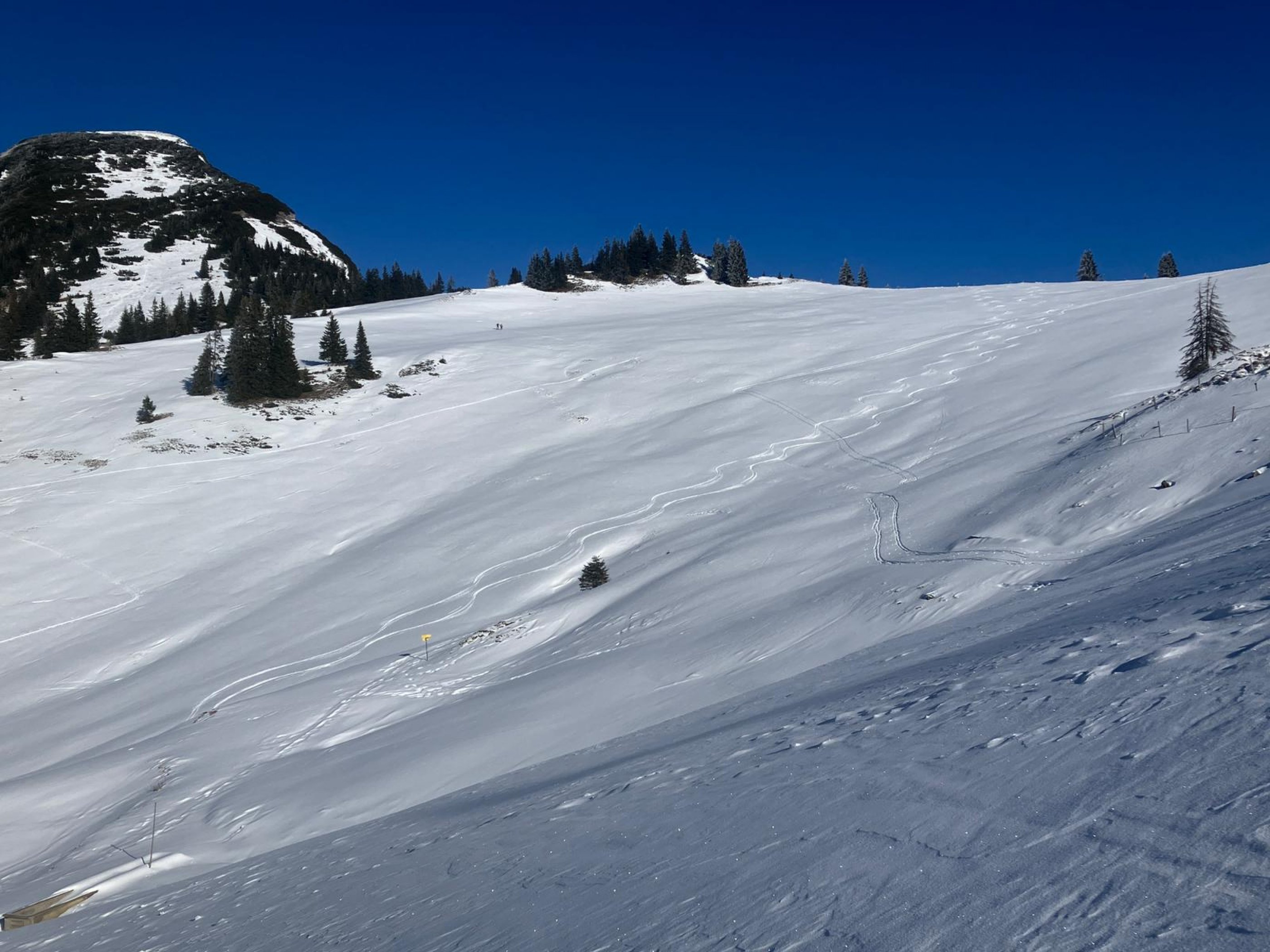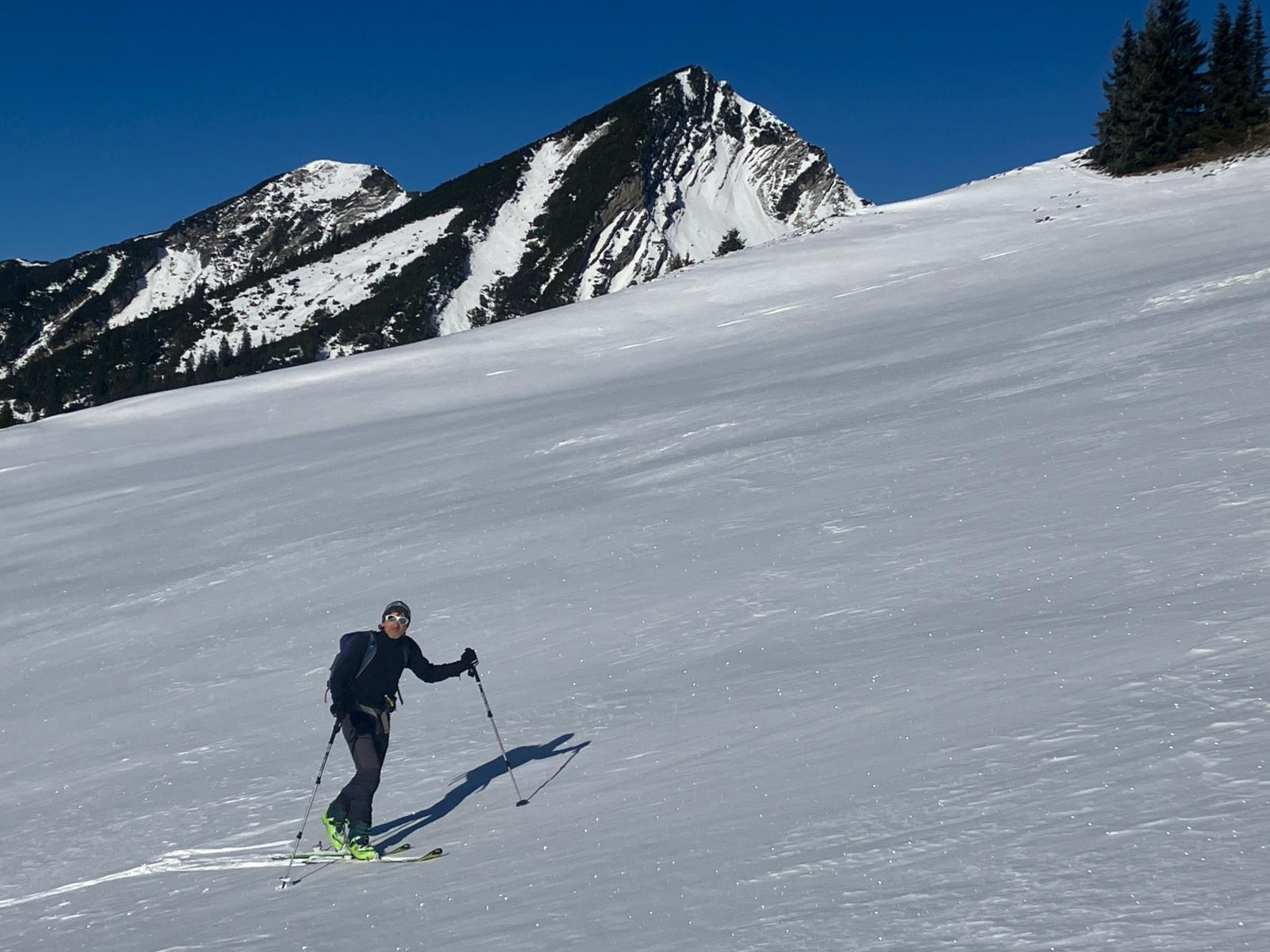 Wir sind über die Gschwendteralm rauf und runter und haben dazwischen ein paar schöne Abfahrten gemacht. Die Überlegung war, eventuell auch ins Rosskar und zur Hölzlalm abzufahren, das hat aber nicht wirklich lohnend ausgeschaut. Am besten war der Hang unterm Peitingköpfl.
