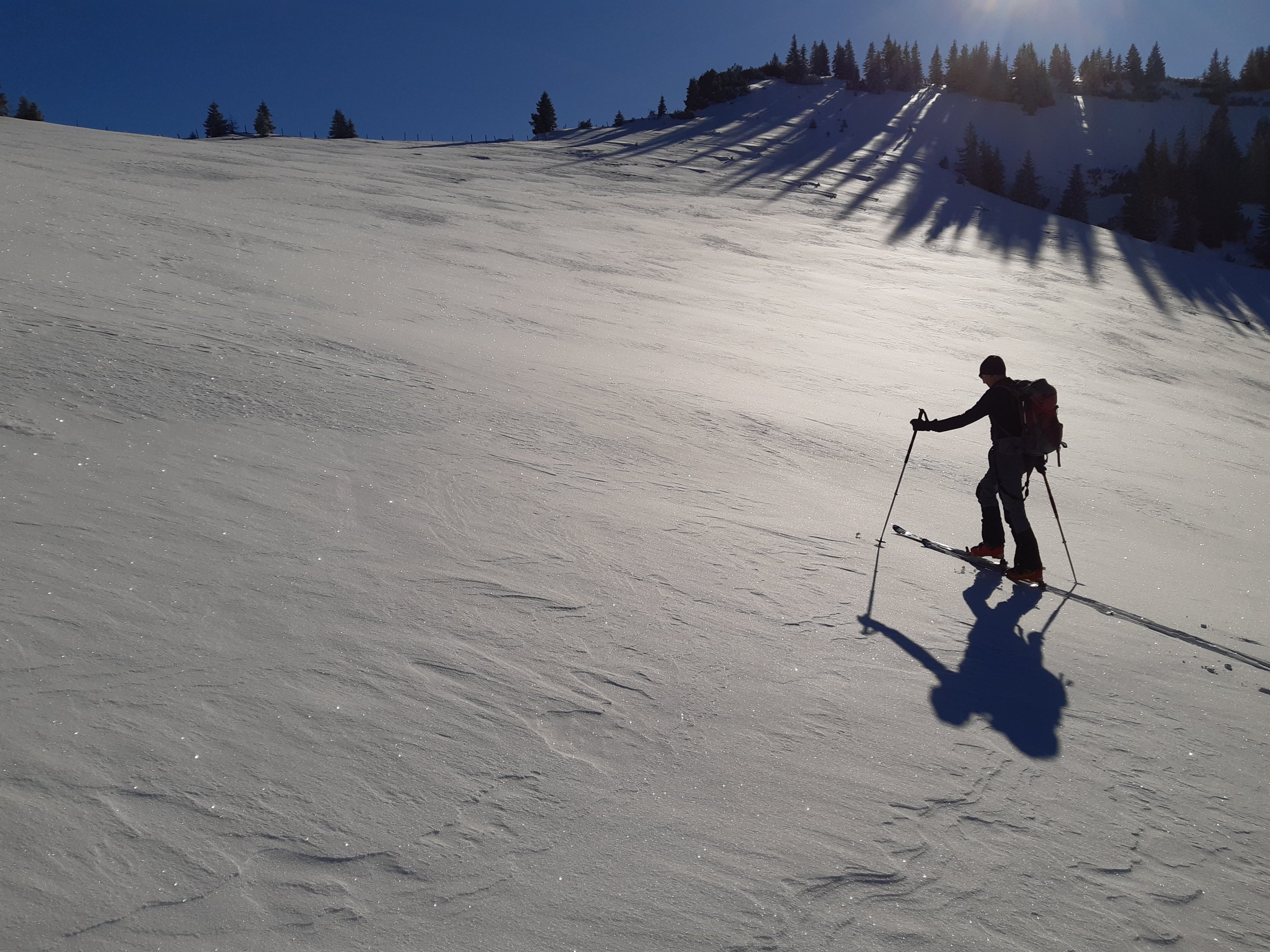 Wie im Lagebericht stand, überwog die Absturz- und Verletzungsgefahr die Verschüttungsgefahr. Bei einer Tragepassage im Wald bei der Abfahrt hat's mir zweimal auf Eisplatten unterm Schnee die Haxen weggehaut.