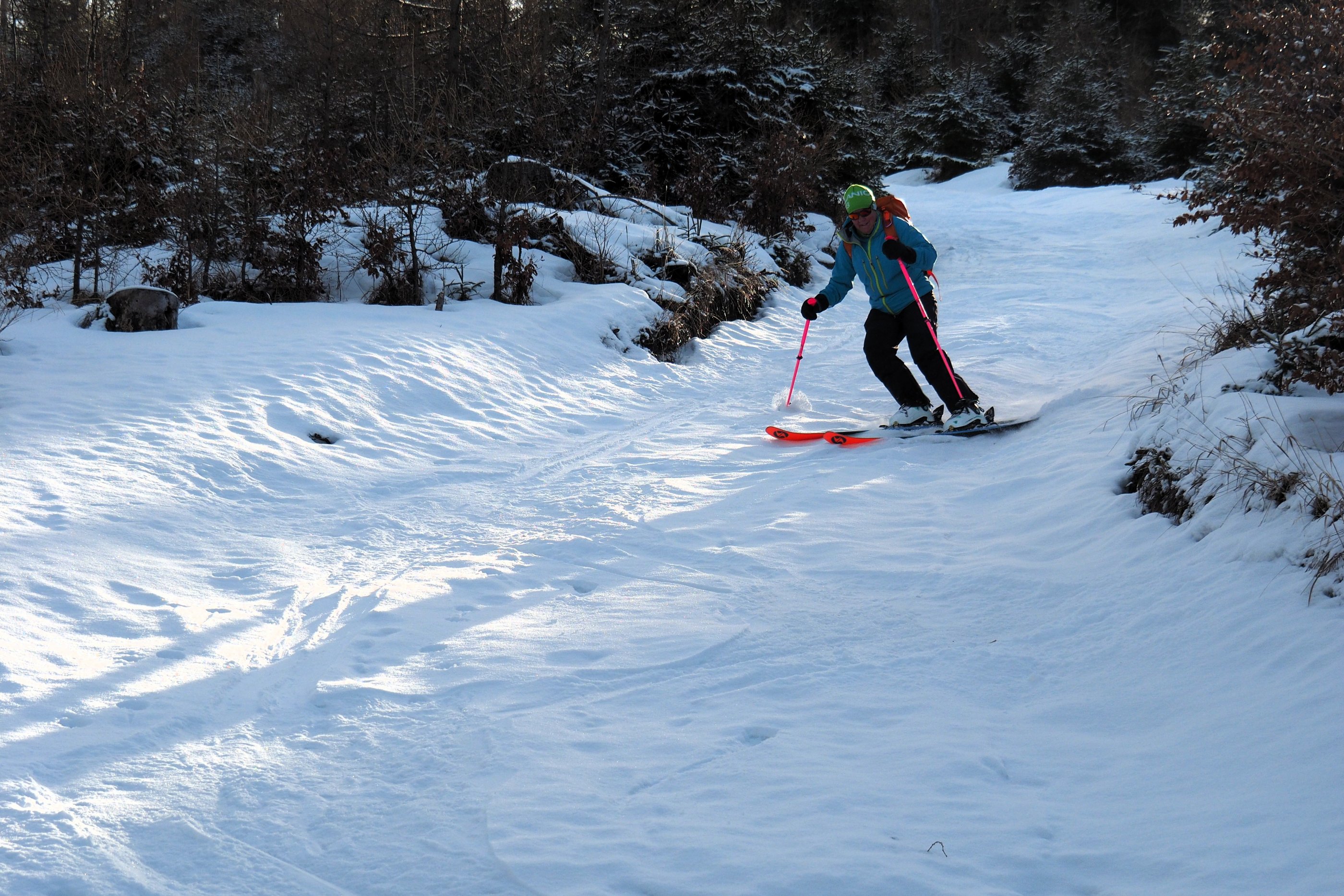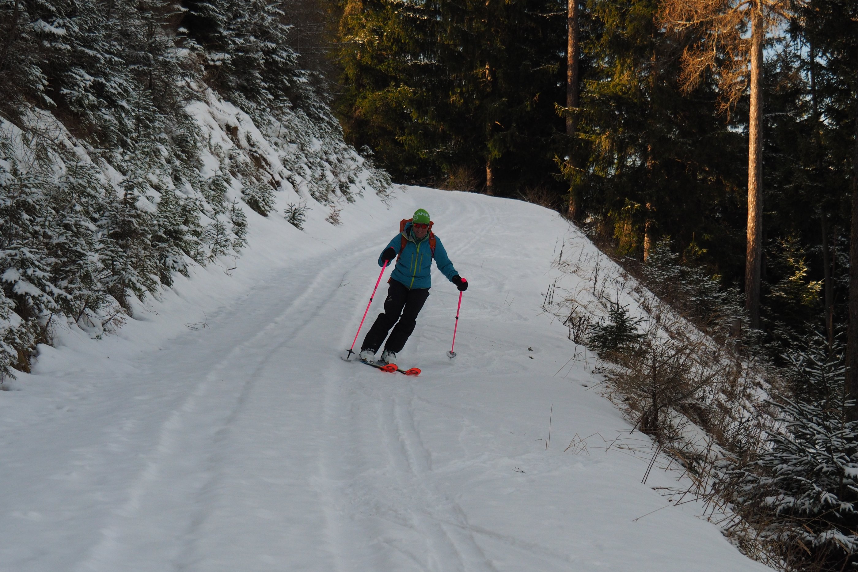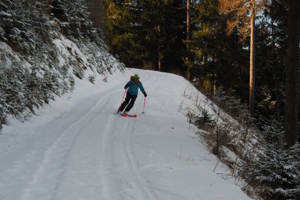 Durch den Bärengraben über die Hoamhöh... Sehr dürftige Schneelage, aber machbar. Forststraße gut geh- aber nur mehr eingeschränkt fahrbar. Der Hochwaldrücken mit Umsicht recht brauchbar, die folgenden freien Lagen bis zu den Latschen hin OK.