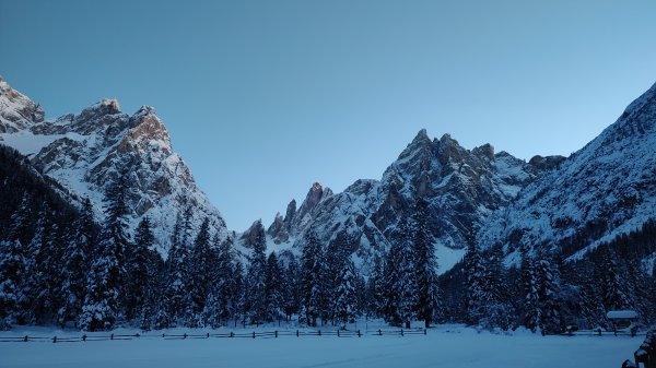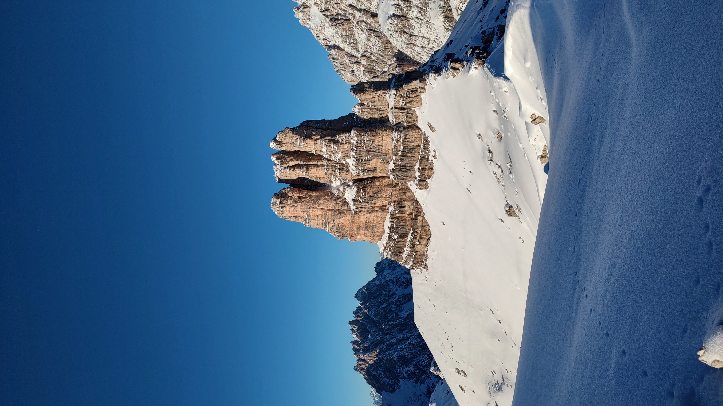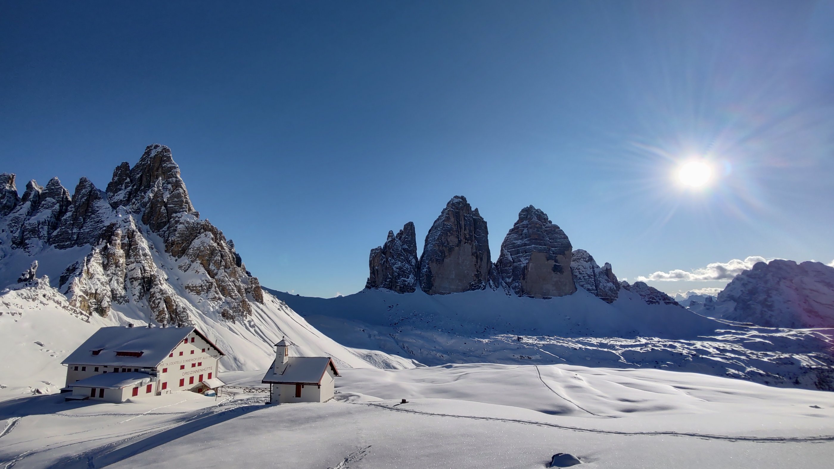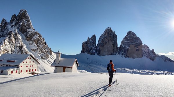 Herrliche Dolomitenskitour in grandioser Landschaft und bei strahlendem Winterwetter. Vom Fischleintal hinauf zur Dreizinnenhütte und auf den Hüttengipfel.