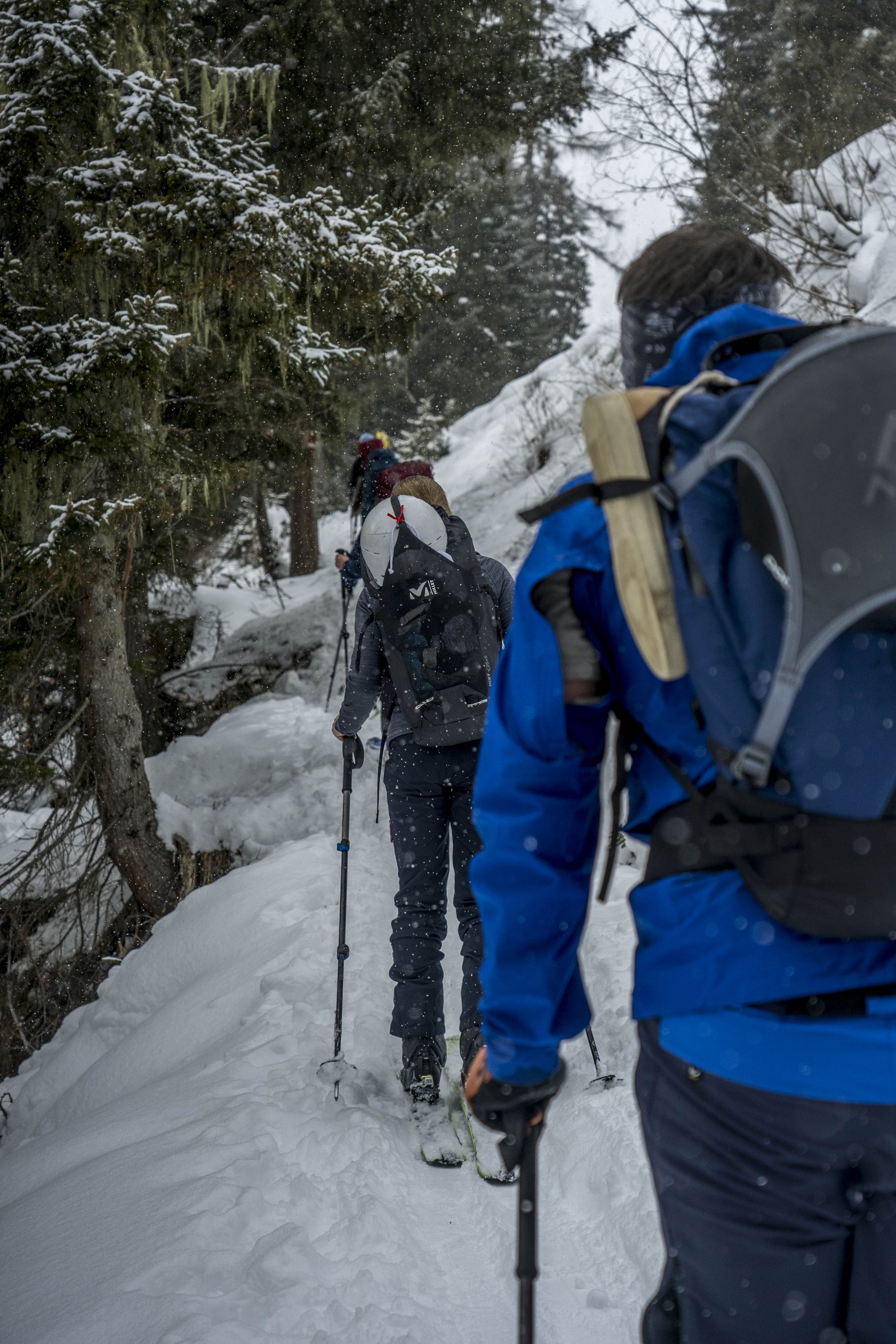 Im Tal regnete es zunächst aber zwei Fichten bieten genug Schutz zum umziehen, beim Aufstieg ging der Niederschlag ab ca. 1.300 m jedoch in Schnee über. Es schneite den restlichen Tag über immer wieder. Auf den Wegen war der Aufstieg gut machbar und auch die Abfahrt war möglich, abseits der Wege lag bis ca. 1.500 m allerdings nur sehr wenig Schnee. An den Südhängen zeigt sich die Lage teils bis in die Gipfelregionen sehr mager.