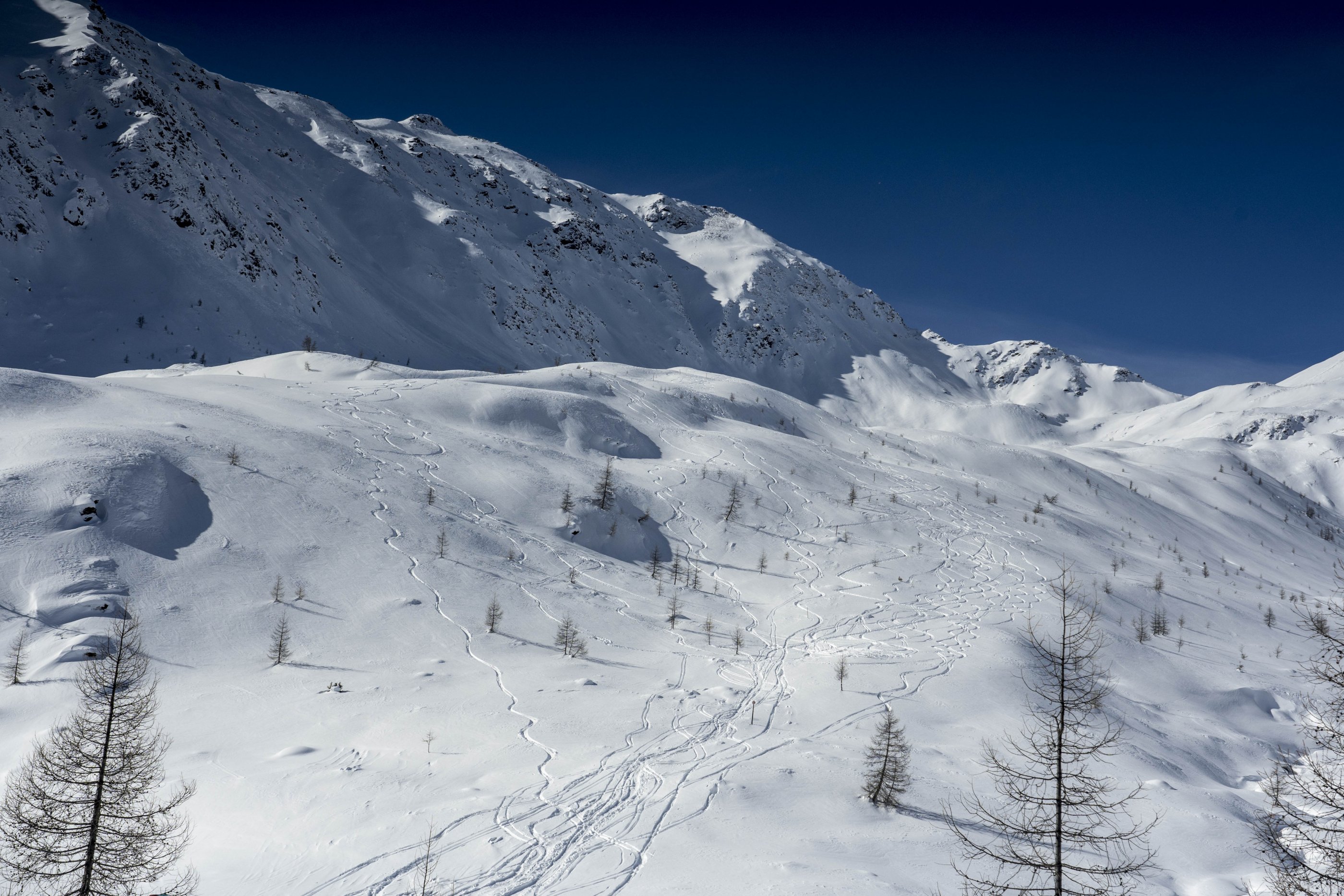Am Sonntag herrschte zwar blauer Himmel und Sonnenschein, aber auch kräftiger Föhn. Wir stiegen Richtung der flacheren Melenböden auf. Die Spuren der Tourengeher vom Vortag waren im unteren Bereich zugeschneit und weiter oben vom Wind verfrachtet bzw. verdeckt. Der Weg von den hinteren Melenböden zur Sadnigscharte war massiv mit Triebschnee beladen. In den Hängen des Sadnig-Rückens waren viele Lawinenablagerungen zu sehen, wobei bei weitem noch nicht alles entladen war. Diese Route war daher keine Option für uns.