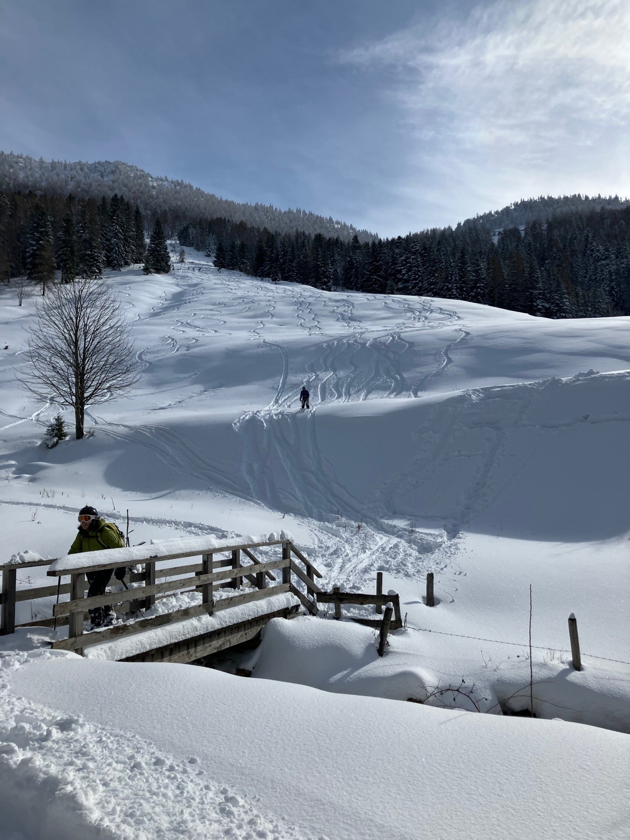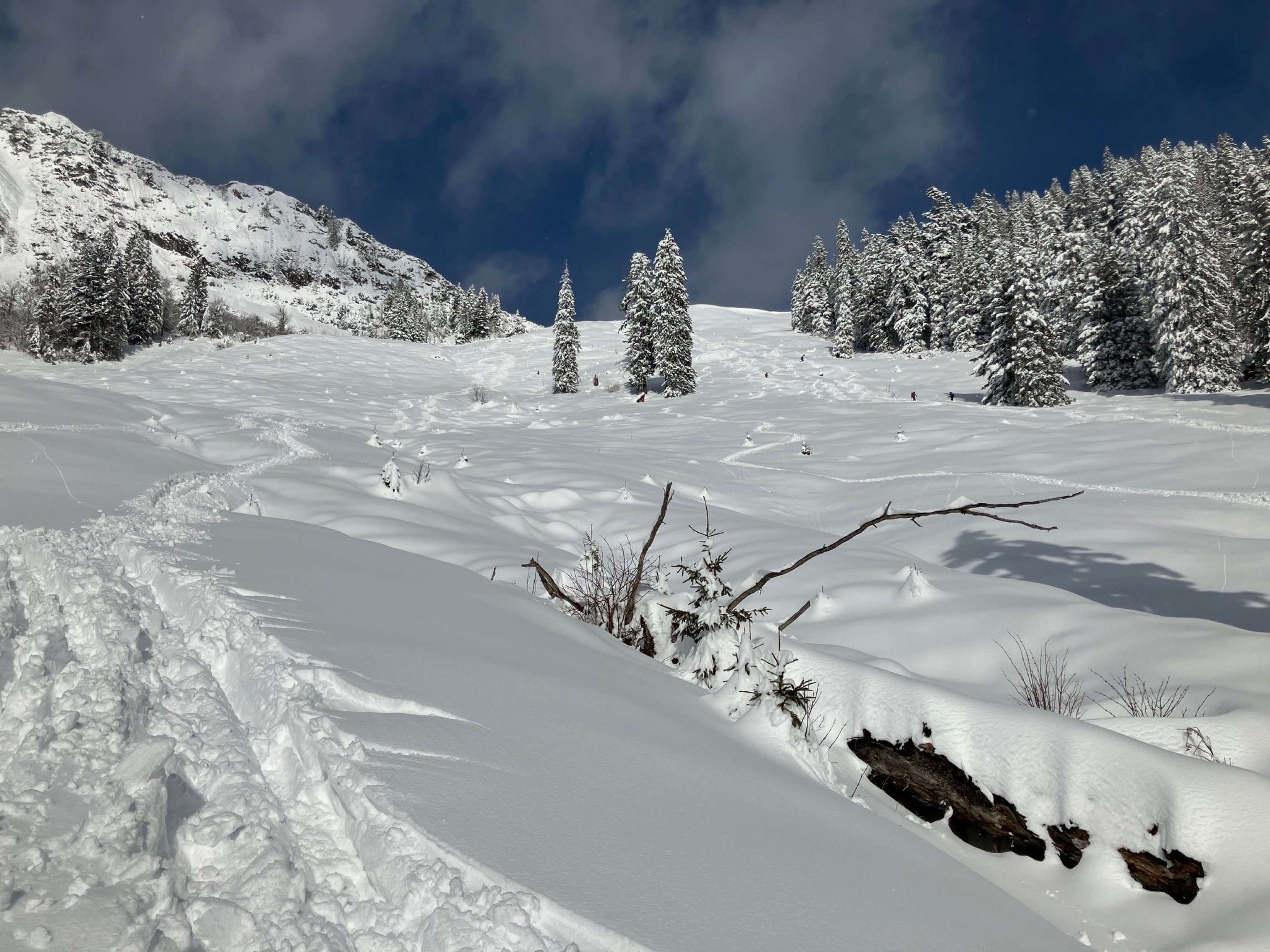 Aus den Steilflanken des Bosrucks donnerte der Neuschnee gut hör- und sehbar Richtung Süden hinunter. Ansonsten waren keinerlei Gefahrenstellen auszumachen. Stufe 1 unterhalb Waldgrenze passte trotz viel Neuschnee.