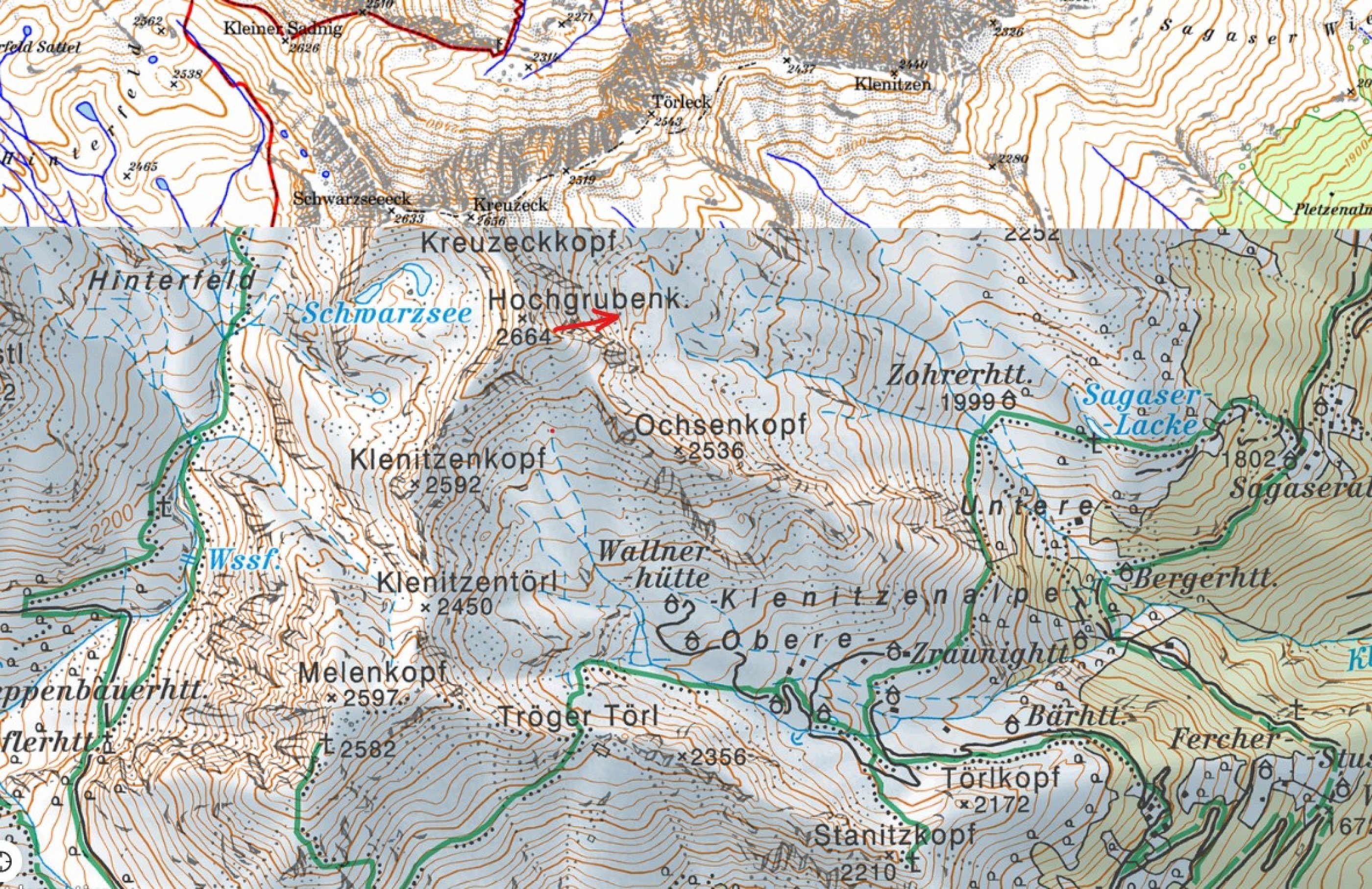 meiner Frau wurde am 18.2.2026 vom Skidepot kurz unter dem Gipfel des Hochgrubenkopfs in der Sadniggruppe ein Ski in eine nach Ost/Nordost abfallende Steilrinne geweht. Er fuhr oder stürzte diese bis außer Sichtweite hinab in Richtung des Karbodens oberhalb der Zorerhütte zwischen Törleck/Hochgrubenkopf/Ochsenkopf. Auf Grund der Steilheit in Verbindung mit LWS3 war der Ski für uns unerreichbar.
