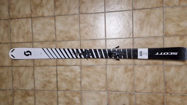 Es handelt sich um einen weiß-schwarzen Ski der Marke Scott.