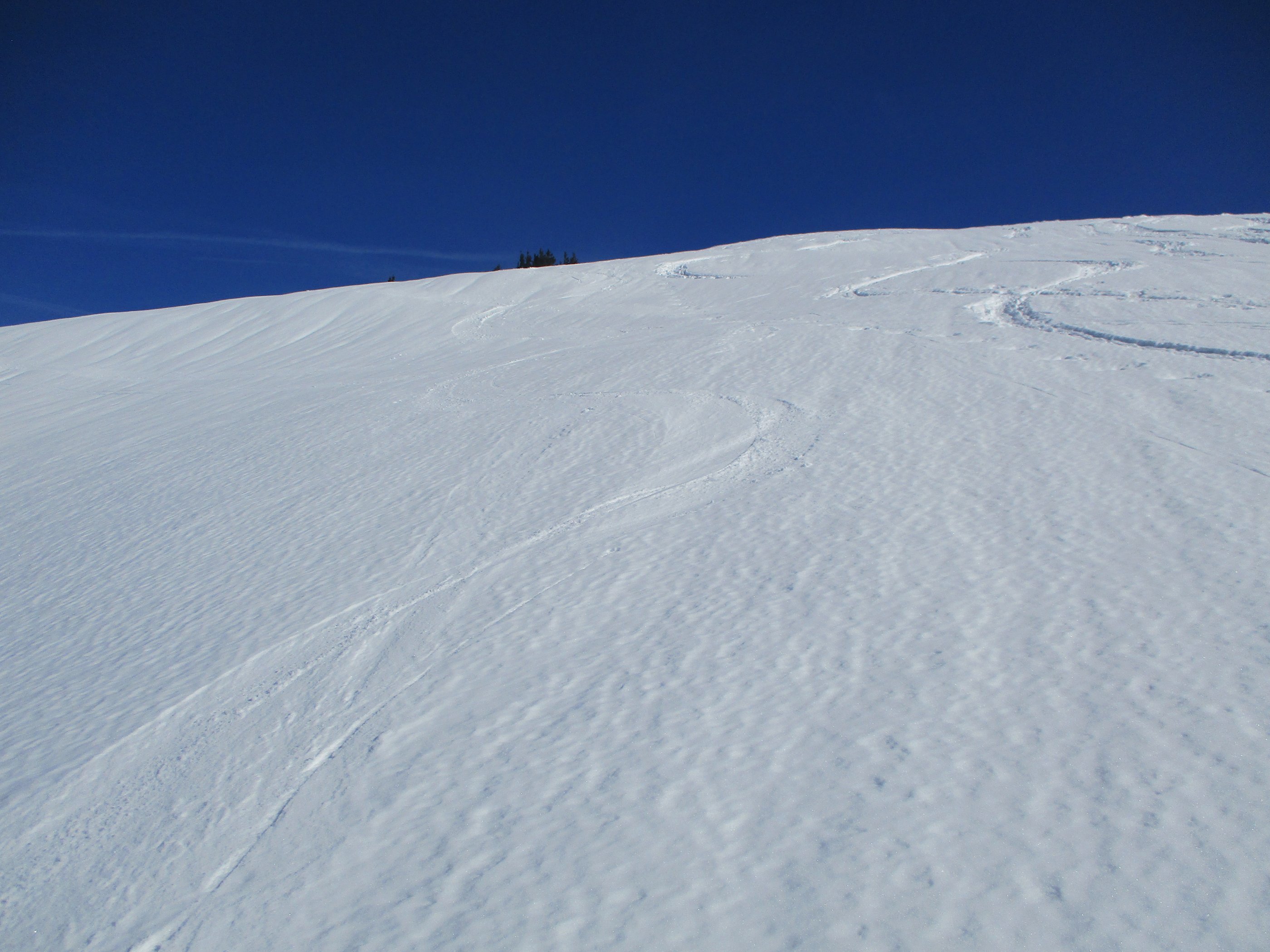 Am Vormittag noch tragfähiger Harschdeckel ,teilweise schon leicht aufgefirnt.