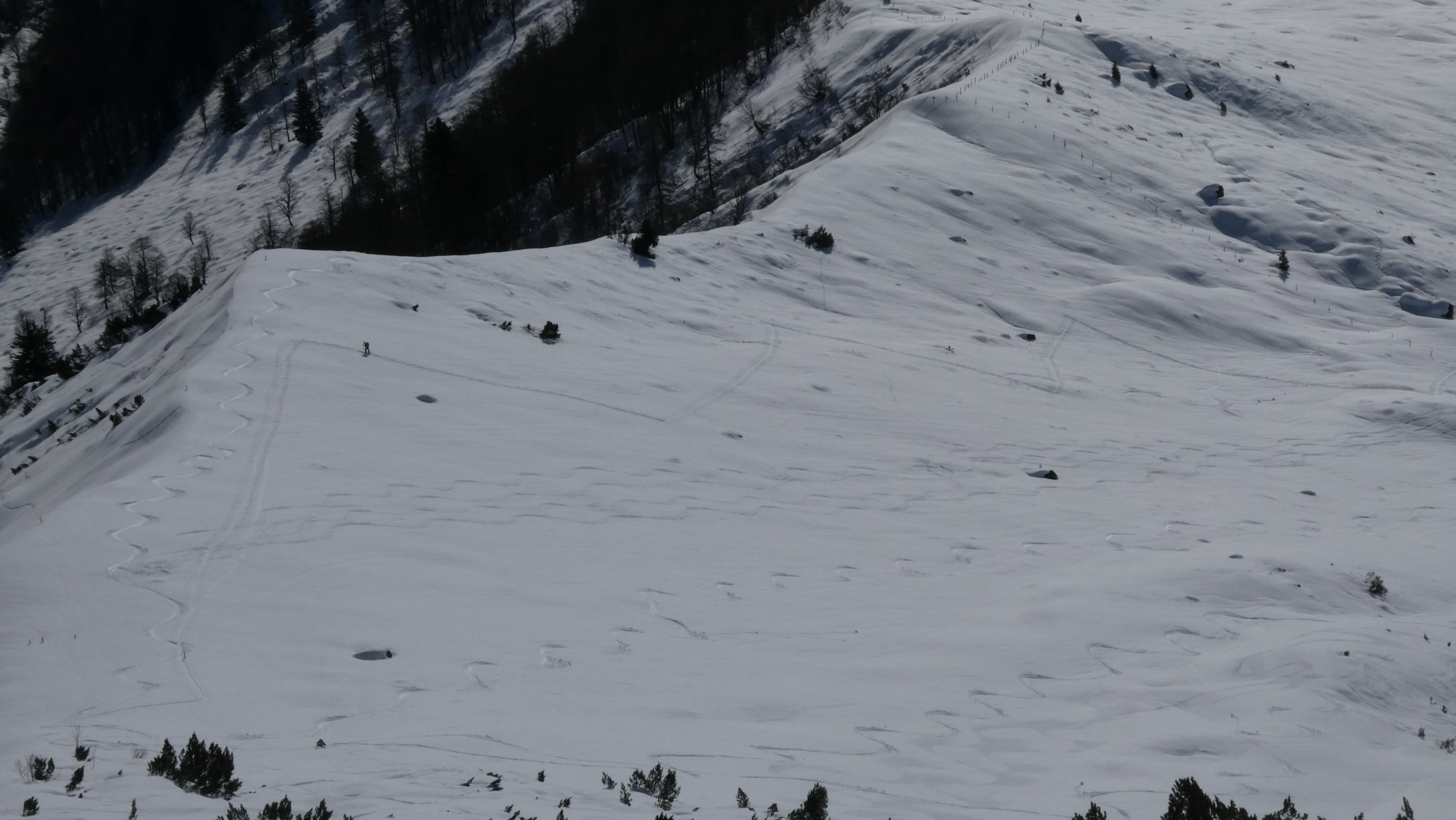Klare Nacht. es hat gut abgestrahlt und sonnseitig war der Schnee auch schon umgewandelt. Vom Seitendrahthag sieht man gut zu den Ausläufern der Lawine aus der Schrammbachscharte hinunter. Abfahrt 9 Uhr hat genau gepasst-