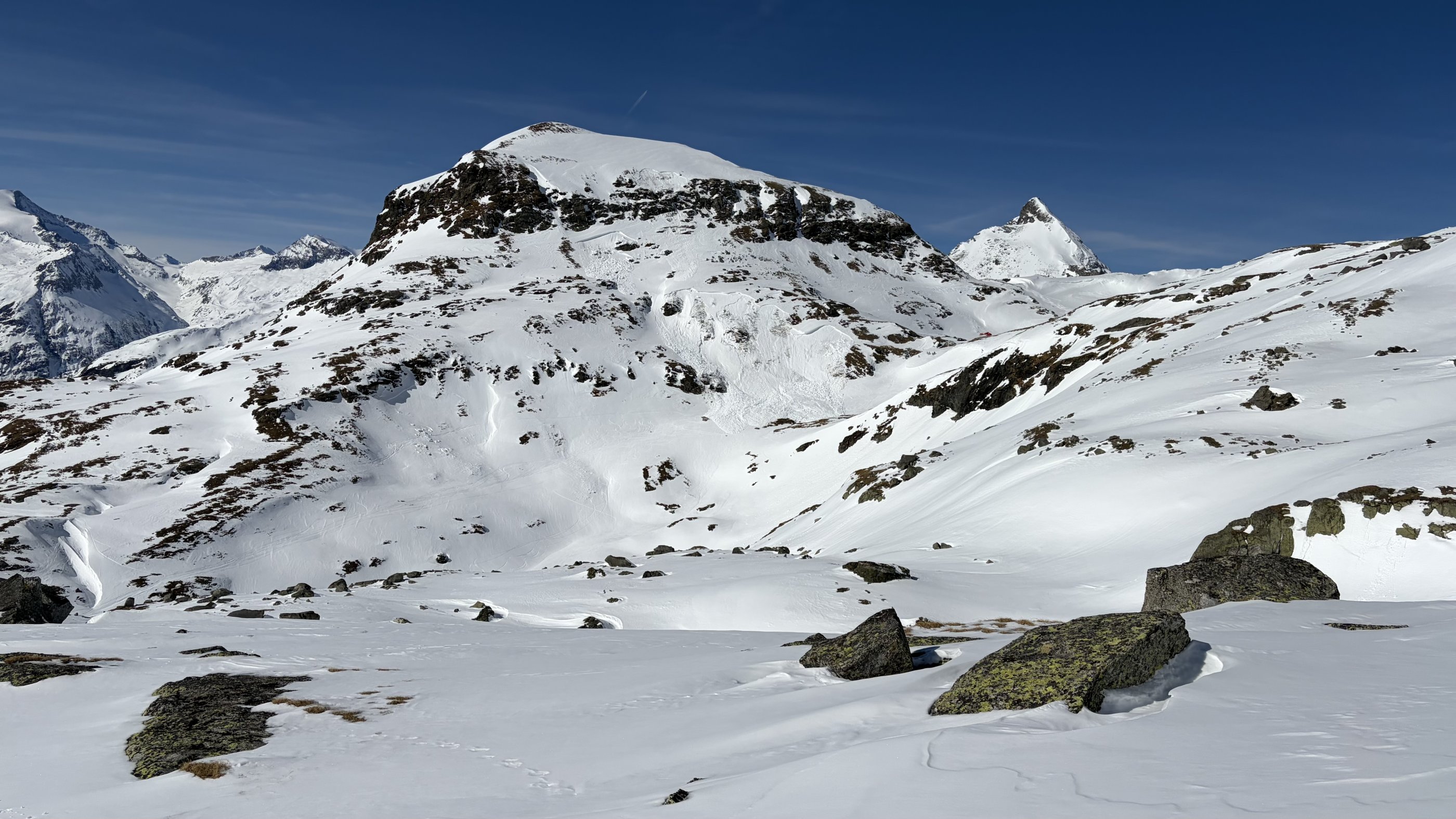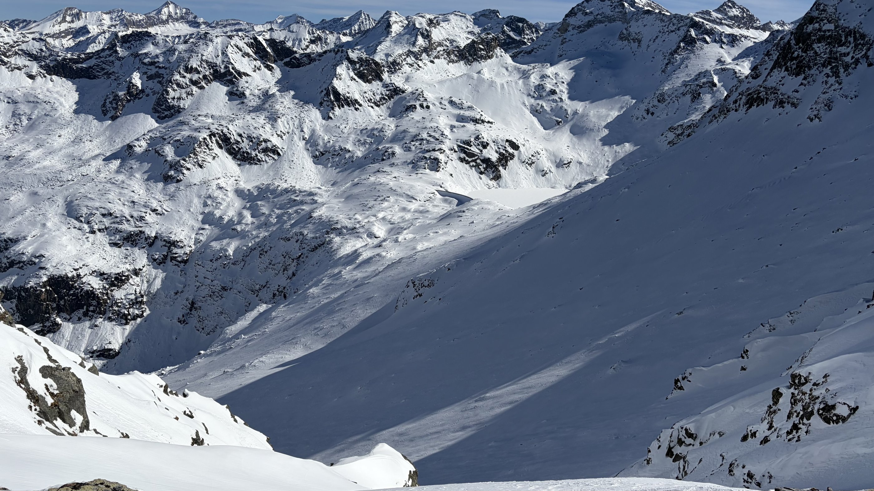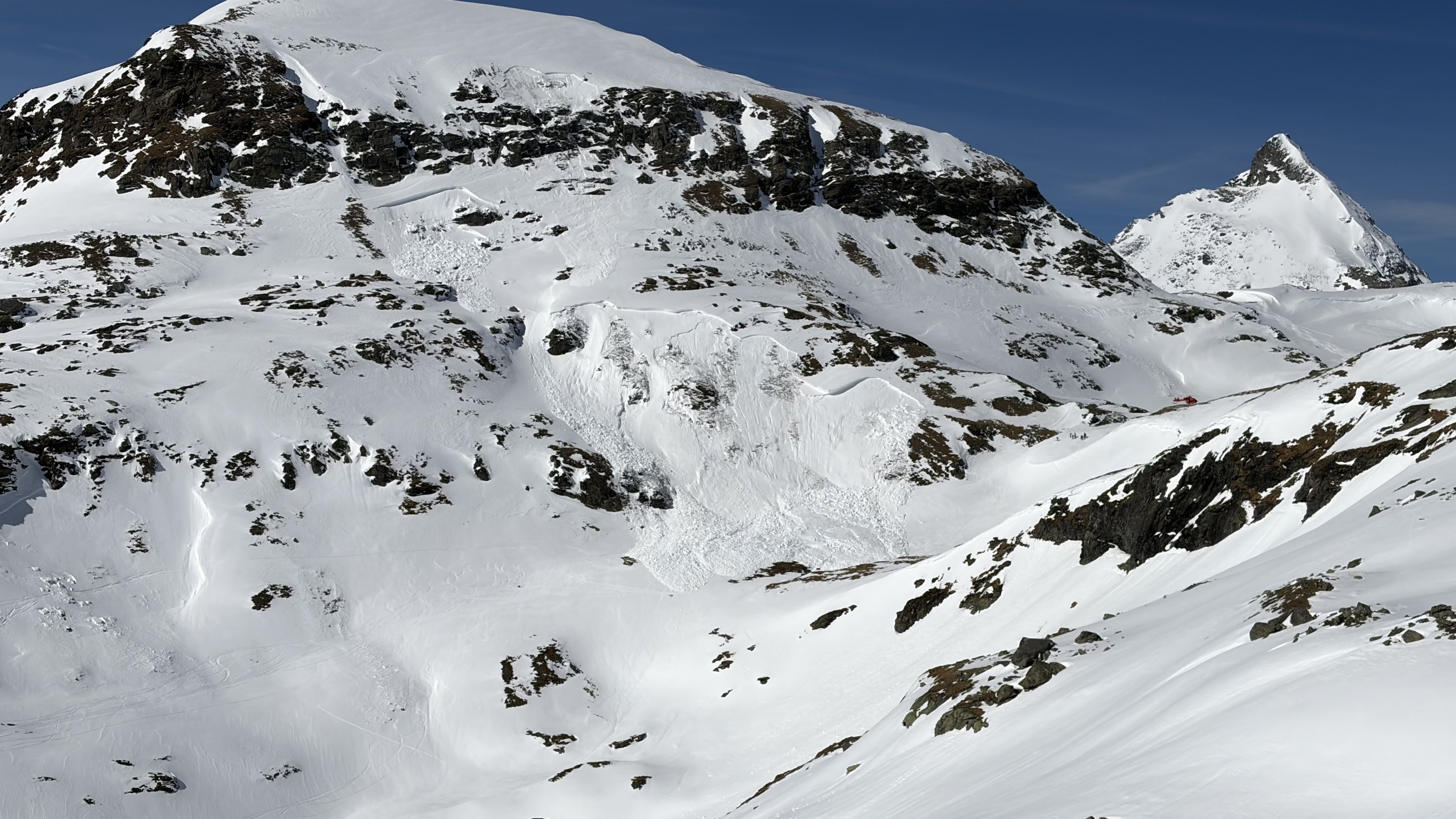 Der Zustieg zum Hochgasser quert auf der Ostseite des Messelingkogels an Schwarz- und Grausee vorbei hinauf. Heute ging vom Messeling eine beachtliche Lawine über die Querung hinab (= Stufe 3 + Ost + sehr steil + ungünstige Schneedecke + spät). Ein Heli checkte den Bereich, zum Glück ging es wohl gut aus.