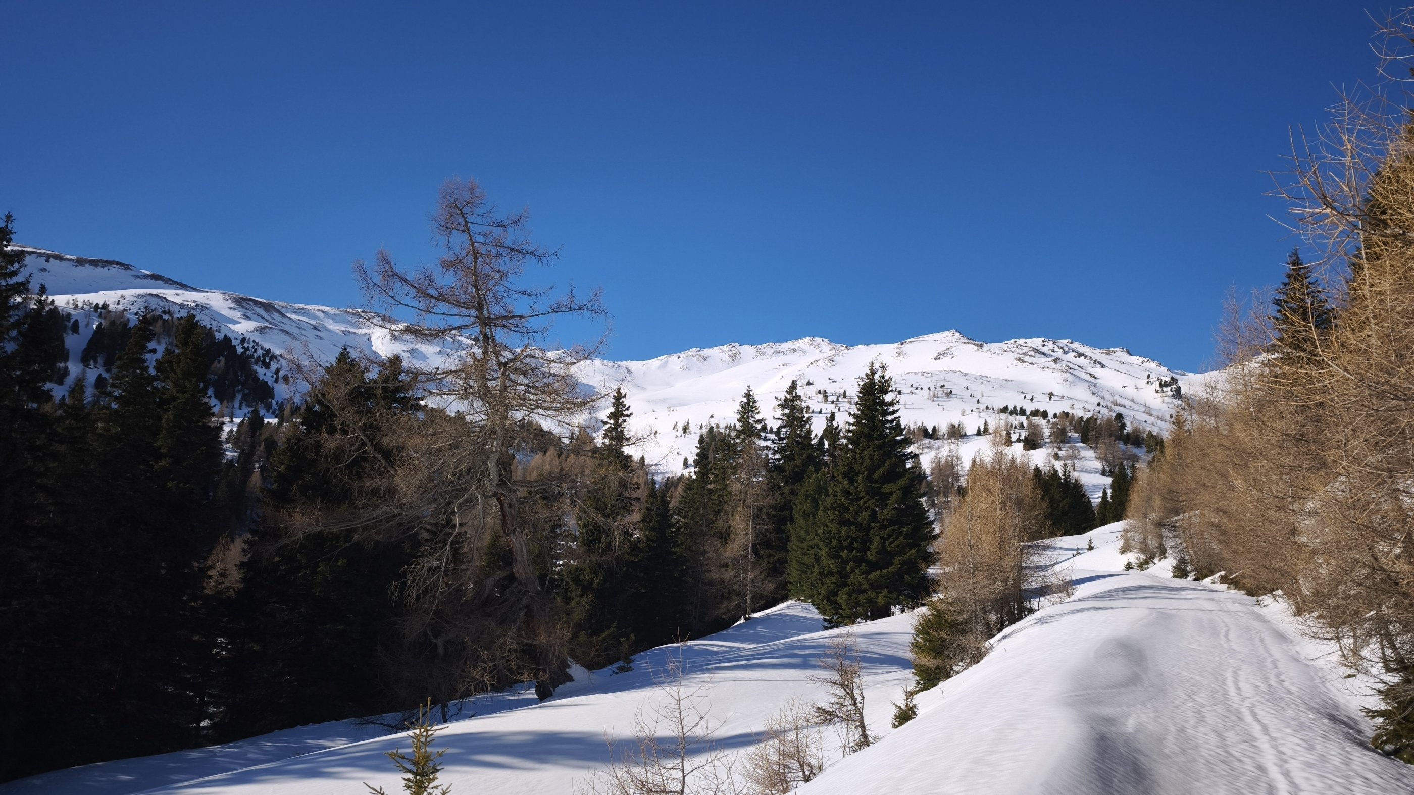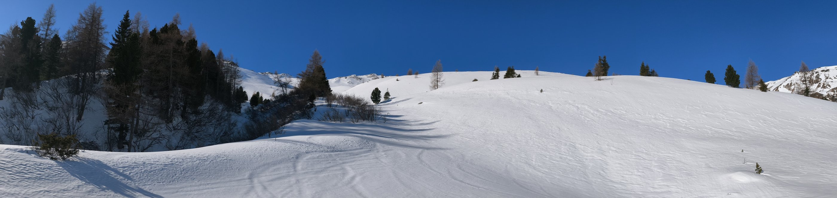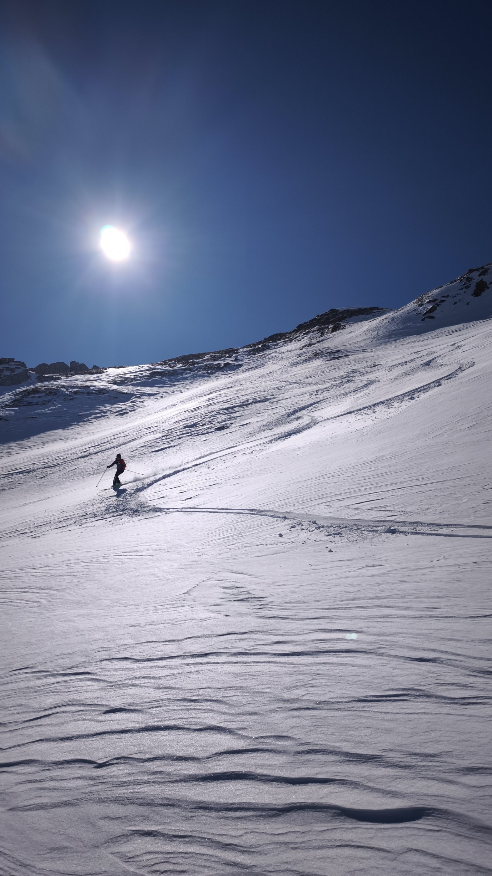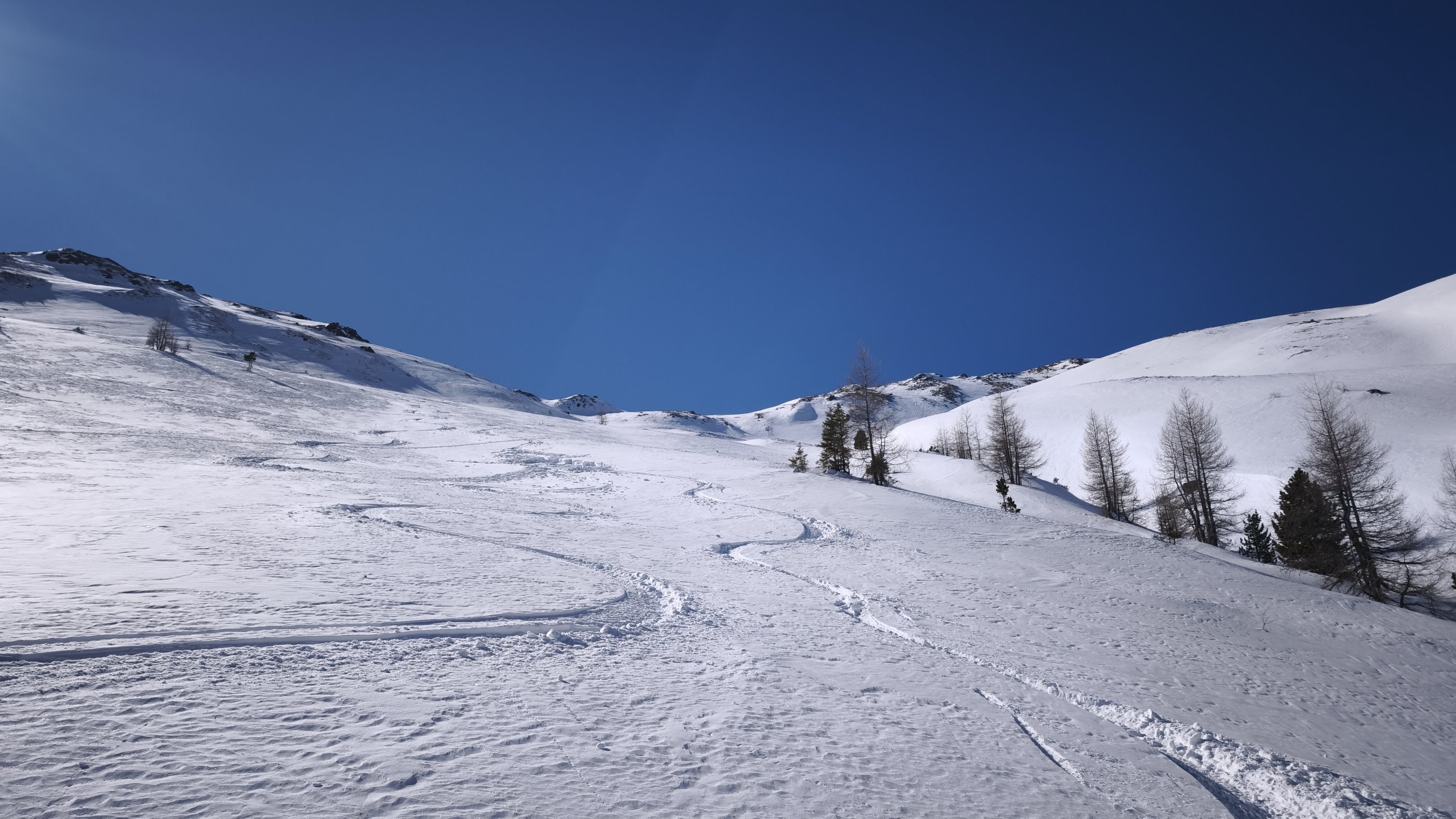 Der letzte Schneefall hat nochmals ca 10-20 cm gebracht. Somit gibt es in der Mächtigkeit wirklich eine sehr gute Schneelage in diesem Gebiet. In der Früh beim Aufstieg wechselnde Verhältnisse zwischen Pulverschnee, Triebschnee und Oberfläche mit einer zarten Harschkruste. Durch die Tageserwärmung setzte die Durchfeuchtung der Schneedecke rasch ein. In der Folge war die Abfahrt tw ziemlich kräfteraubend. Ein früher Aufbruch und somit eine zeitige Abfahrt ist hier obligat. Mit Ausnahme einer kurzen Unterbrecherstelle im Bereich des Kraftwerkes, kurz nach dem PP Goldwaschanlage, konnten wir durchgehend aufsteigen und auch abfahren.