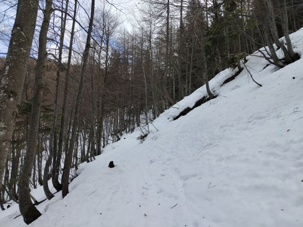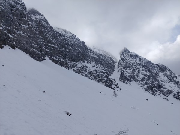 Auf der Mautstraße bis auf das untere Drittel (Strecke ca.500m Skitragen, ganz unten den schneebedeckten Ziehweg östlich der Mautstraße nehmen) noch durchgehende gute Schneedecke, ab Koschuta Haus 1.280m merklich mehr Schnee (gut 1,5m), ausreichend Schnee im oberen lichten Buchenwald und auch in der Latschen/Geröll Zone darüber. Ein entgegenkommender Grazer Kollege und weitere zwei Alpinisten die in der Lärchenschlucht (NO- Exposition) waren haben mich motiviert zumindest einen Blick dort hinein zu werfen. War angeblich pickelhart. Im breiten Nordkar war auf ca.1.600m zu meiner Abfahrtszeit (13:25) mit diffusem Licht, eine angenehm aufgefirnte Oberfläche zum Abfahren, es dürfte hier an den Vortagen kleinere Entladungen/Rutsche gegeben haben. Mit ausreichendem Abstand zu den großen Wandfüßen recht sichere Verhältnisse an diesem Tag, die Lärchenschlucht selbst kann ich nicht beurteilen. (Altschneeproblem ??)