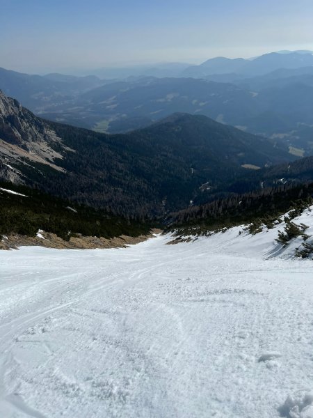Zeitiger Start um 0730 vom Preiner Gscheid. (Parkgebühr 5€) 300Hm Ski tragen bis zum Siebenbrunnenkessel. Danach mit Ski über den Schlangenweg ohne nennenswerte Unterbrecherstellen auf's Platteau und weiter zur Heukuppe. Abfahrt über Hauswechte und Blutrinne zur Eckbauerhütte. Wiederaufstieg links vom Handtuch auf den Predigtstuhl. Abfahrt um 1030 bei Butter Firn über die Lange Mann Rinne zum querenden Göbl-Kühn-Steig. Das erste Stück noch mit Ski dann zu Fuß zurück zum Waxriegelhaus und weiter zum Parkplatz.