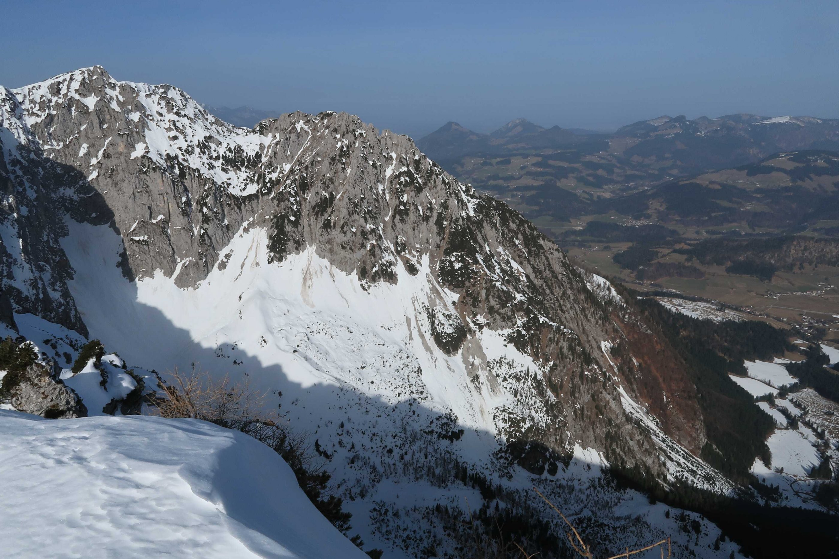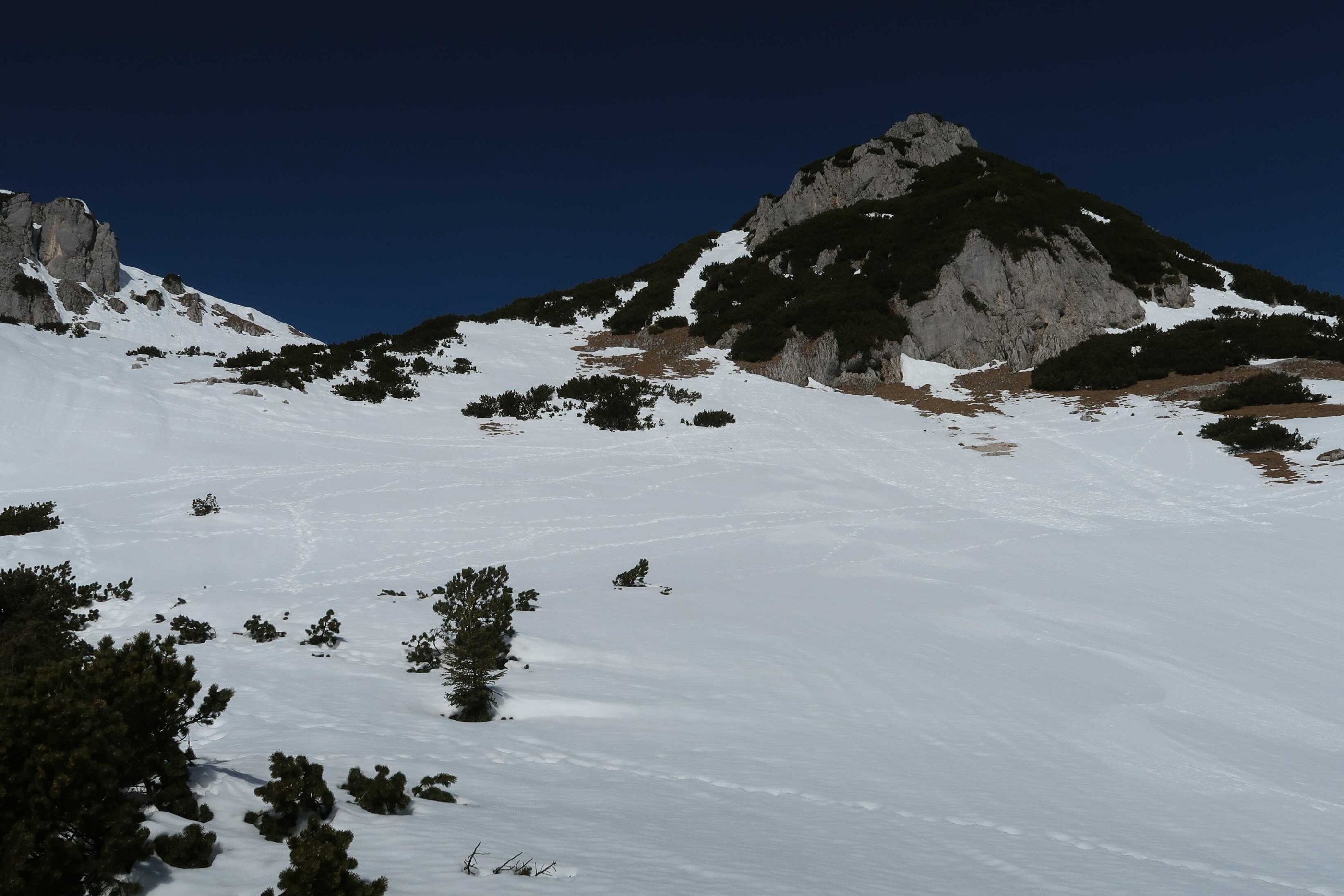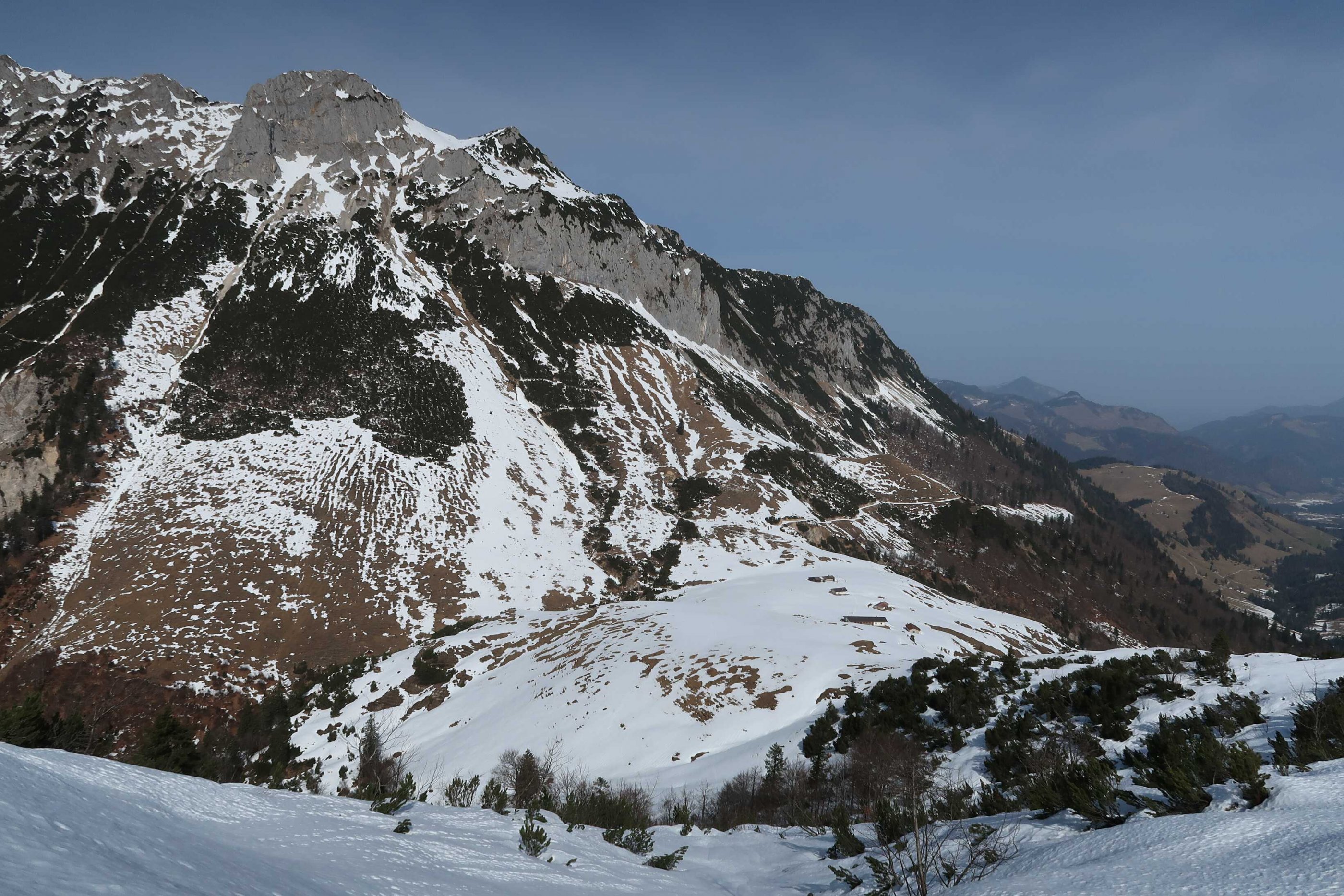 Mit dem EBikevom PP nahe dem Walchsee ins Weißenbachtal geradelt. Der Fahrweg entlang des Baches war streckenweise Blankeis, mit Spikes aber kein Problem. Bikedepot nach der Habersaualm (ca. 1000m, ab hier nahezu durchgehend Schnee auf der Fahrbahn). Zuerst mit Ski, dann zu Fuß über z.T. apere Hänge, dem Sommerweg folgend zur gut eingeschneiten Hochfläche der Kleinmoosenalm. Mit Ski zum Sattel oberhalb der Alm empor, dort endeten abrupt die Winterimpressionen. Die Südflanke hinauf zum Rosskaiser hatte, vor allem im oberen Teil, nur wenig Schnee. Da der Schnee noch gut gefroren war, entschloss ich mich trotzdem auf den Schneeresten/-streifen Richtung Rosskaiser aufzusteigen. Zwischendurch die Ski mal tragend, erreichte ich die Höhe, wo nach rechts der Sommerweg abzweigt. Kurz entschlossen schnallte ich die Ski auf den Rucksack und stapfte durch Latschen auf dem noch meist schneebedecktem Steig, zuletzt durch eine steile Rinne, hinauf zum Gipfelhang des Rosskaisers. Dort herrsche wieder Winter, so dass ich mit Ski bis wenige Meter vor dem Gipfel (1923) aufsteigen konnte. Abfahrt Gipfelhang um ca. 10:30 im Butterfirn, dann wieder über Sommersteig zum Aufstiegshang zurückgequert. Über schmale Schneestreifen mit einer kurzen Tragepassage vorsichtig abgefahren, wobei die Schneefläche nach unten hin immer breiter wurde, sodass doch noch entspanntes Schwingen bis zum Bärentalgraben möglich war. Wiederauffellen und Anstieg über die flachen, noch harschigen Hänge, an der Hochalm vorbei, auf den Ropanzen (1572). Da der Schnee süd/ostseitig immer noch gut tragfähig war, Abfahrt über die relativ steilen O-Hänge zur Feldalm und auf dem Fahrweg zurück zum Bike.