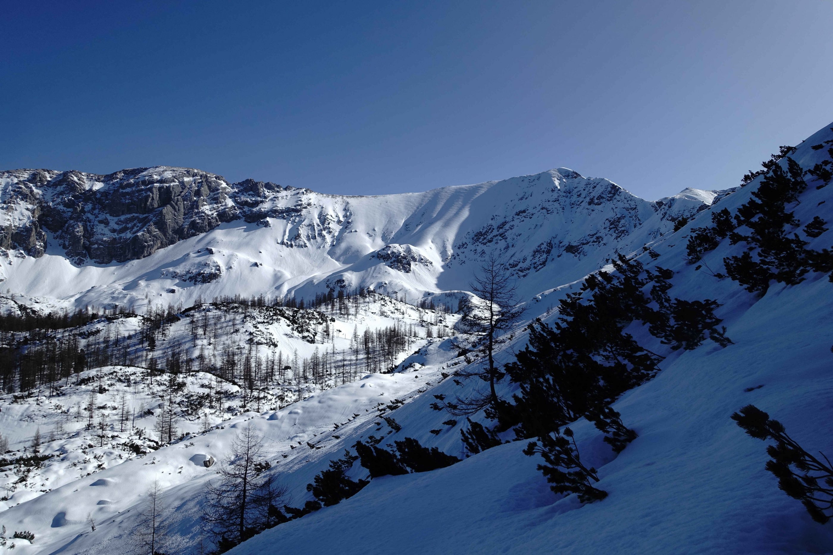 Über Höss-Mautstraße zur Edtbauernalm, rauf zum Hösskogel und über Schafkogel und den ab 2.100m unverspurten N-Grat zum Schrocken, Abfahrt über die SO-Flanke runter zum Schrockenloch;