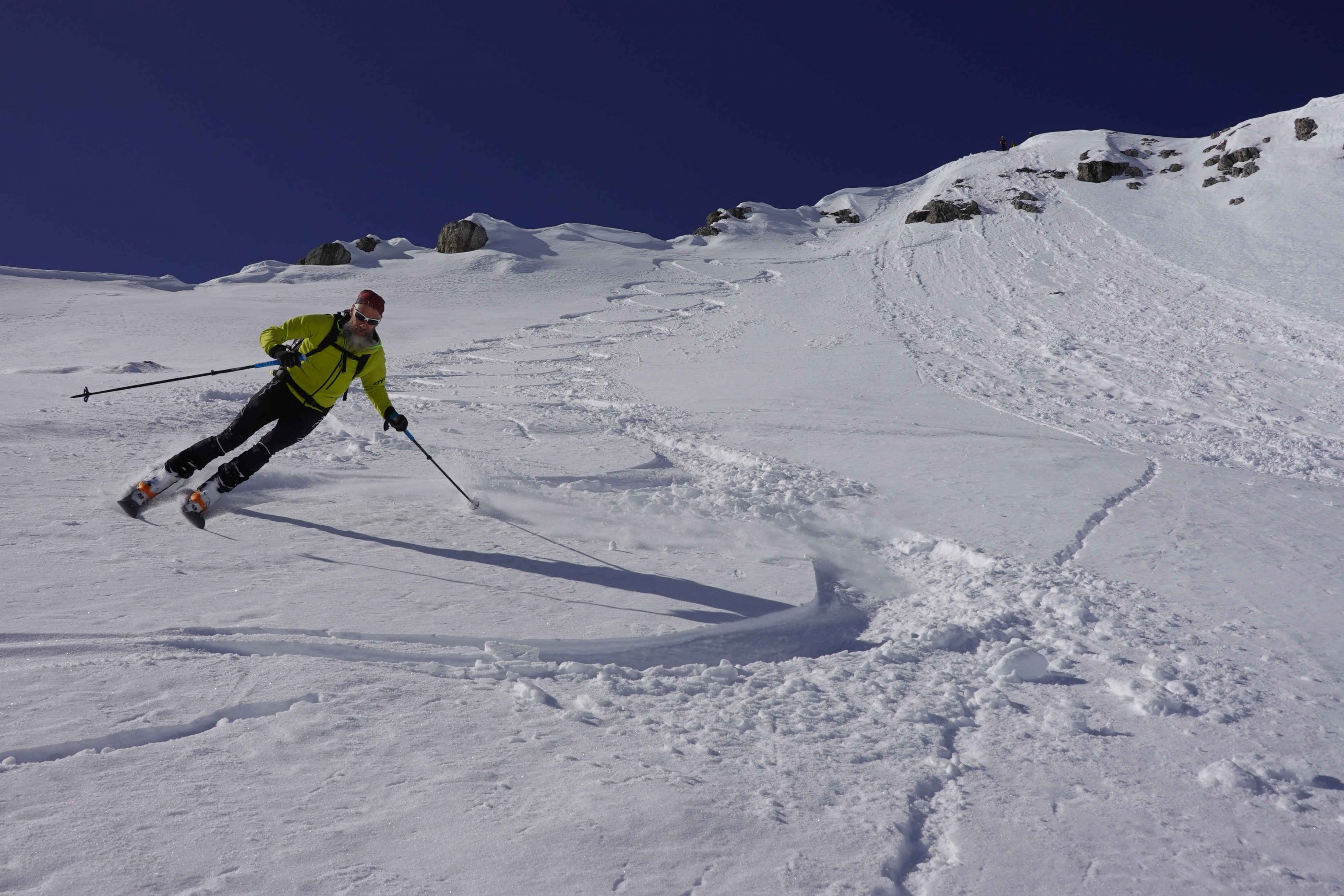 Wiederaufstieg zur Scharte südlich vom Schrocken und rauf zur Kaminspitze, Abfahrt 11:00 direkt vom Gipfel sehr steil in die O-Flanke und weiter in das obere Totental;