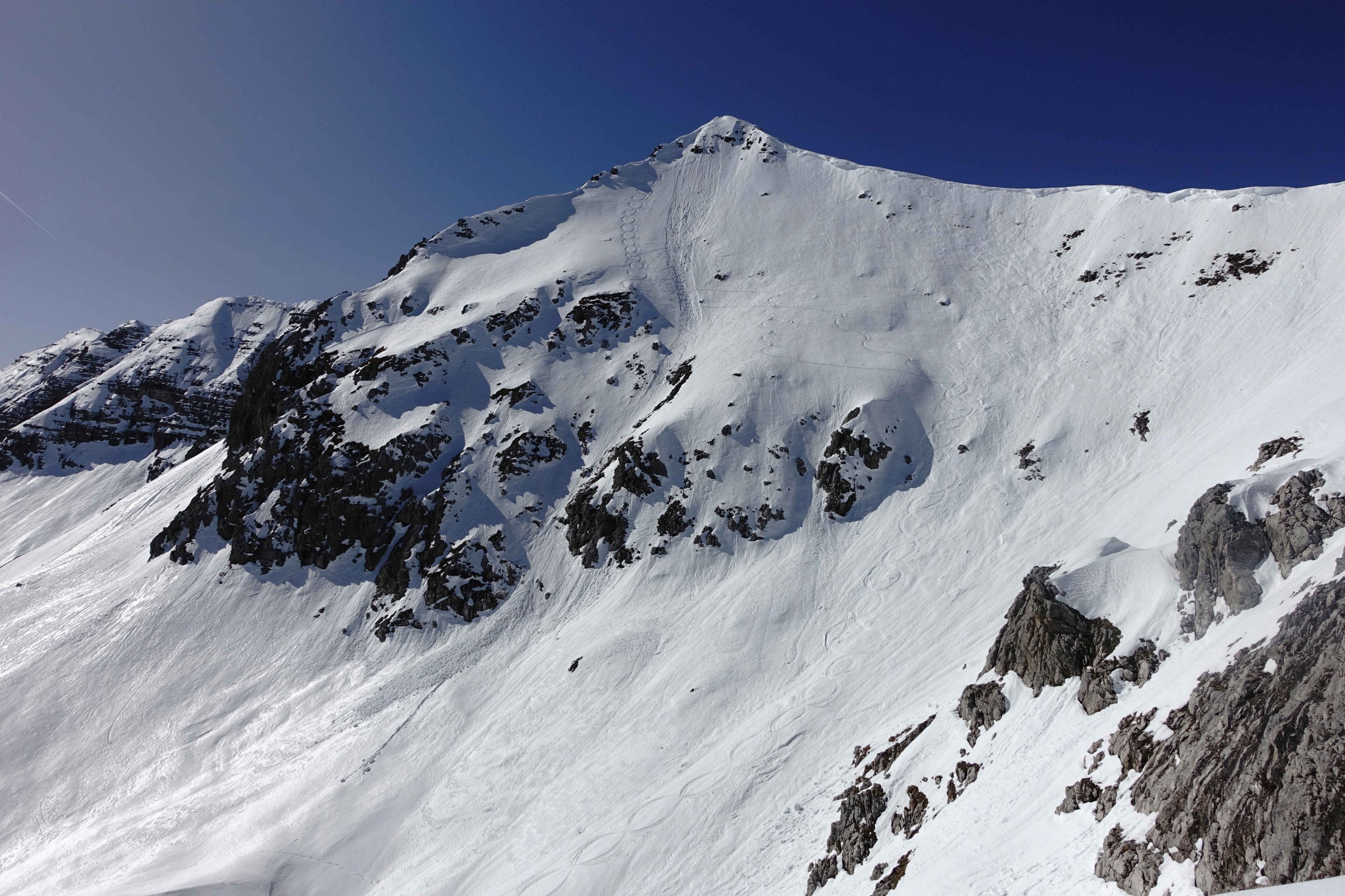 Kaminspitze O-Flanke mit Feuchtschneerutsch und Abfahrtszopf