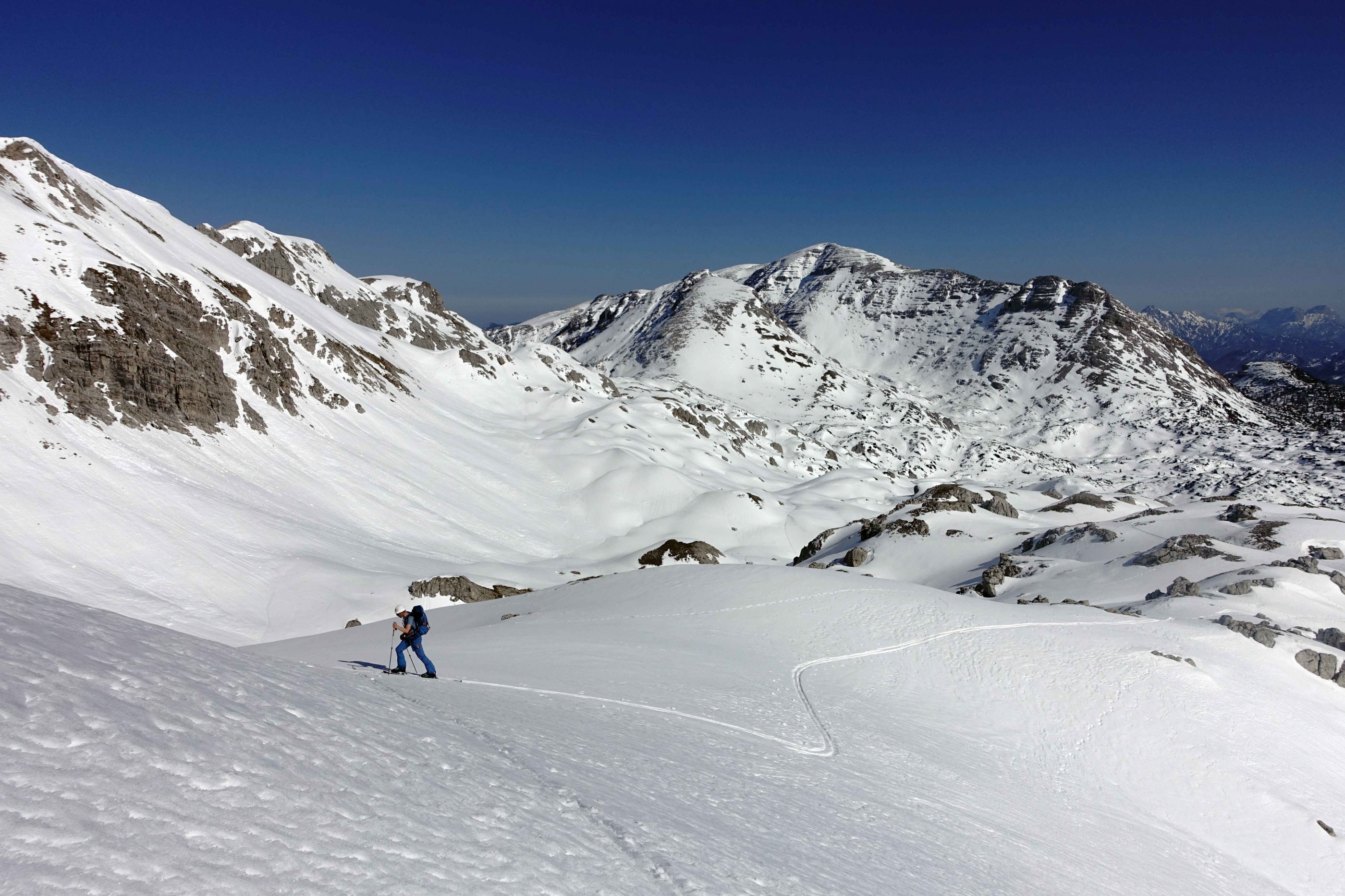 Wiederaufstieg übers Schrockenloch zum Schrocken, trotz positivem ECT keine Abfahrt über die Elmplan weil 1. eine Spur anlockt und Sicherheit vermittelt, 2. heuer ein sehr ungünstiger Schneedeckenaufbau vorliegt und 3. die Elmplan an sich ein kritischer Hang ist.