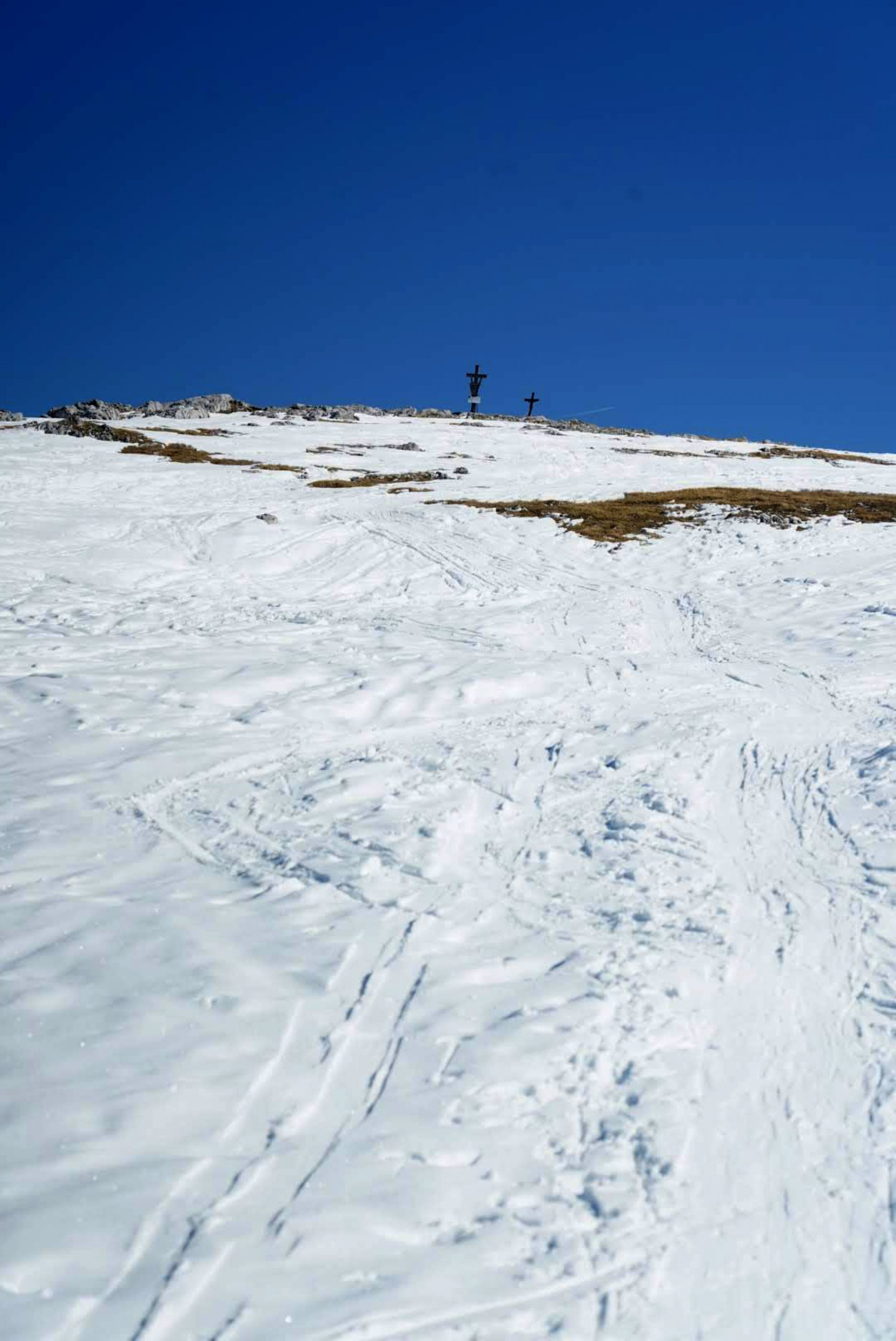 Da es heute nicht zu warm werden sollte gingen wir entspannt gegen kurz vor neun in Hinterbrand los. Erst mit Ski am Rücken und ab dem Skipisten unter den Füßen. Unterwegs waren die Harscheisen teils angenehm aber es wäre sicher auch ohne gegangen. An der Querung rüber zum Stahlhaus gibt es wenige Stellen ohne Schnee und am Stahlhaus auch, sonst kann man gut durch gehen. Am Anstieg zum schneibstein sind im Steilhang die Latschen nur bedingt eingescheint. Der Aufstieg geht gut, die Abfahrt geht aber ist fordernd, einige tragen hier runter.