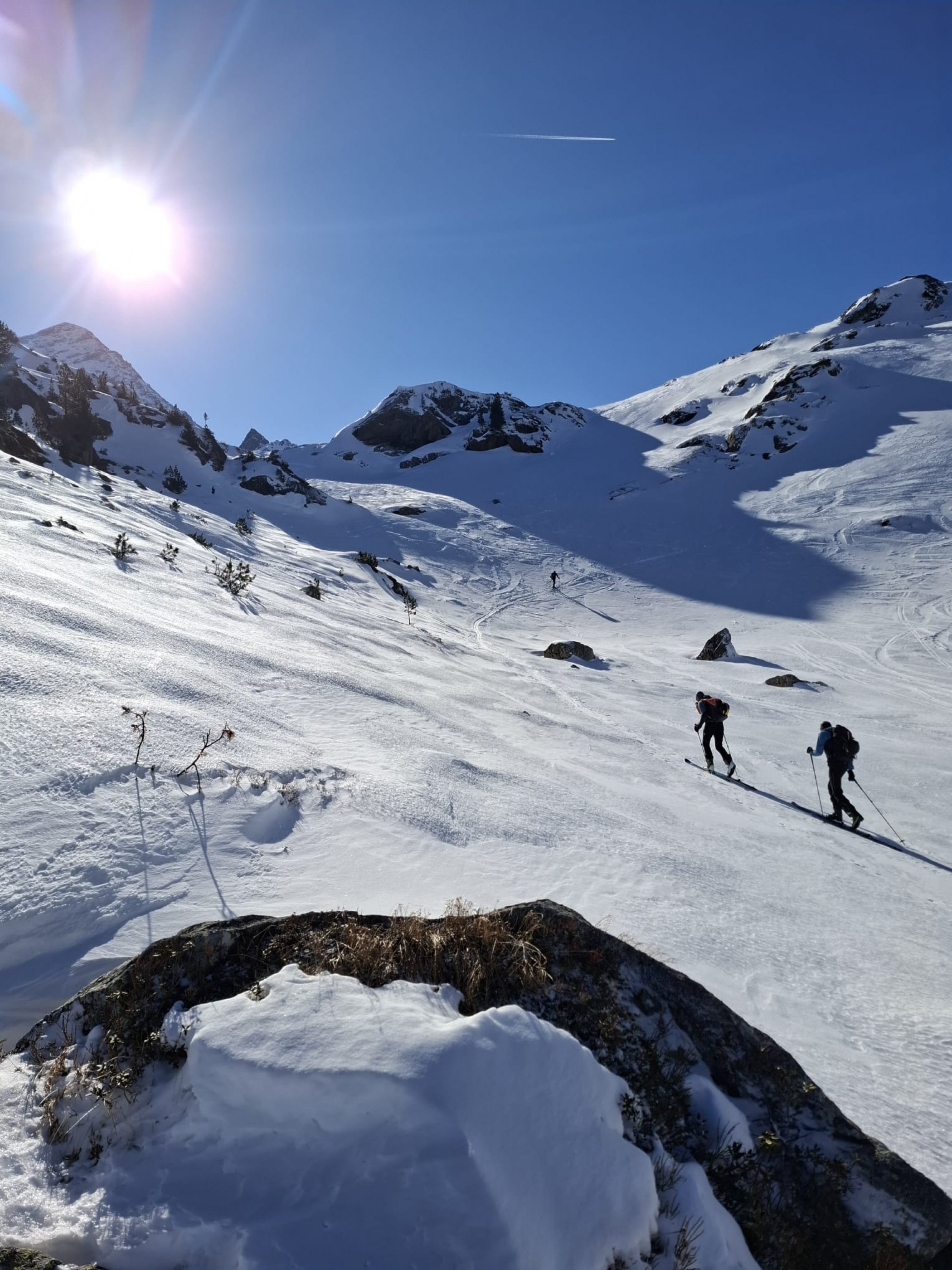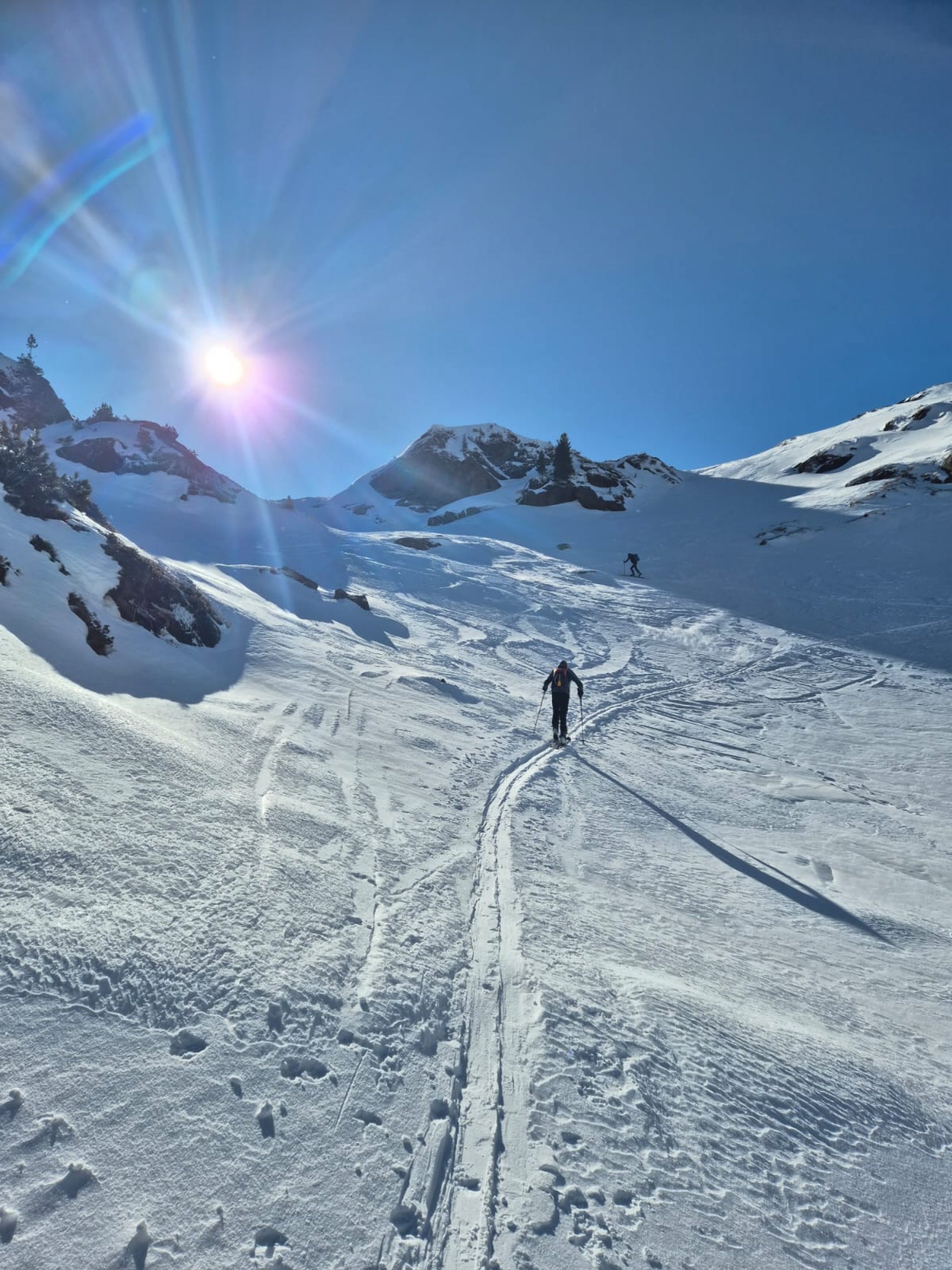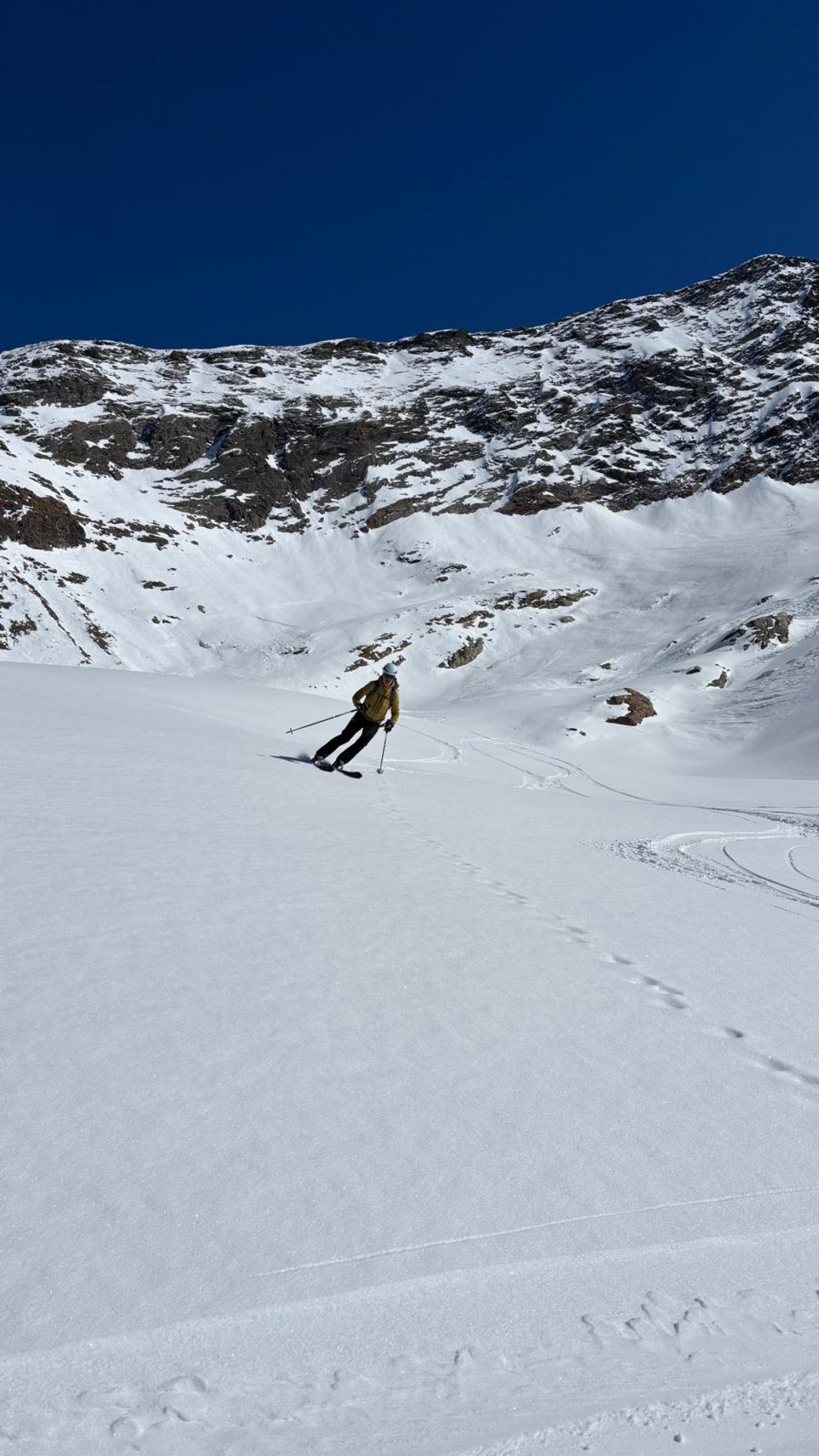 Abfahrt: bis zum Eiskarl teilweise noch Pulver, ab der Versorgungsstrasse leicht angefirnt.