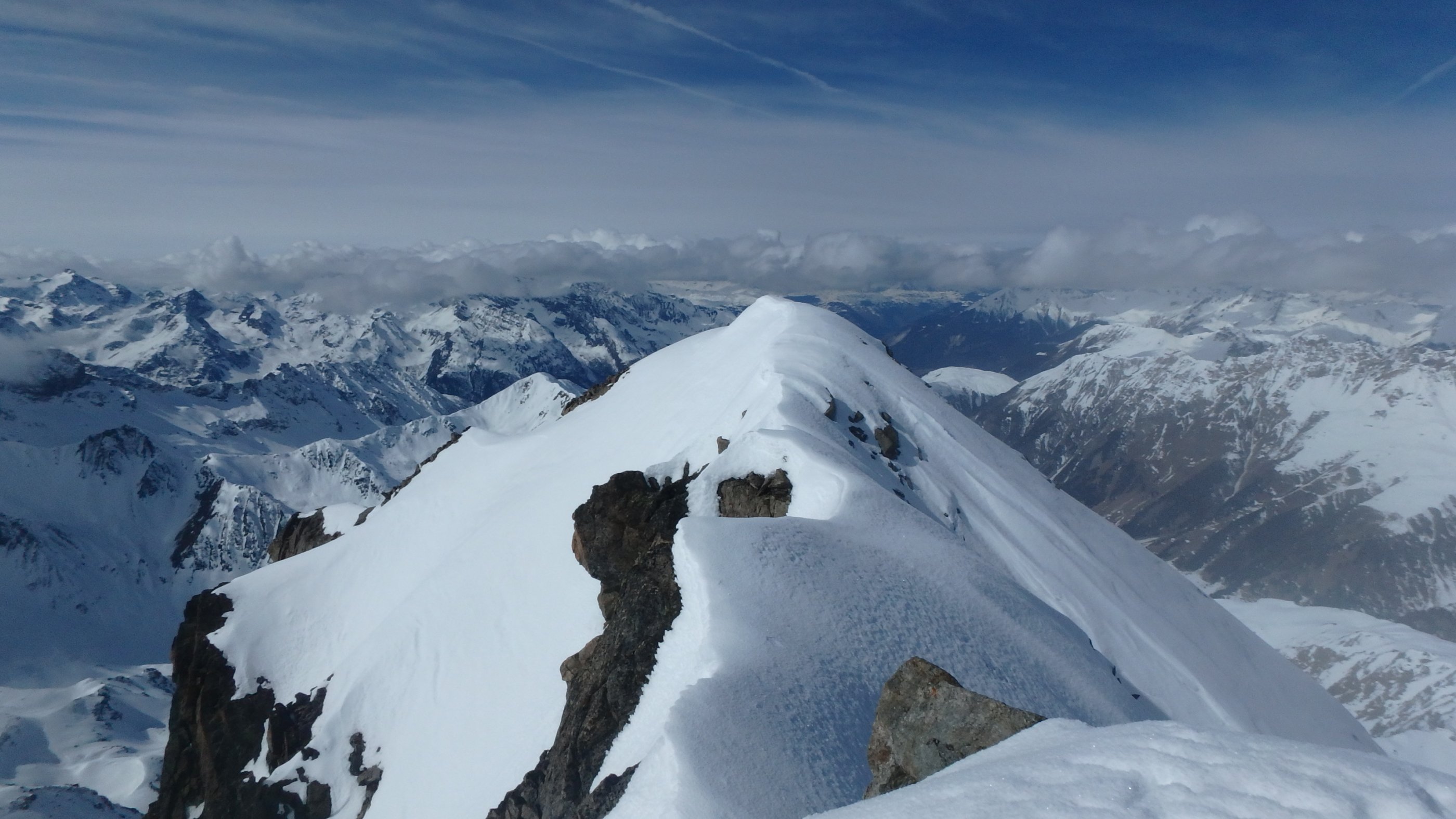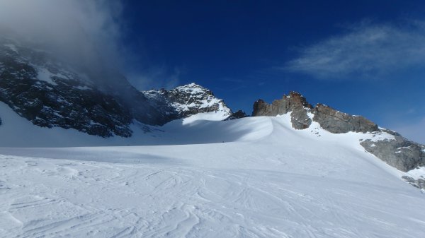 11.3. Am folgenden Tag strebt die Schitourengemeinde zur Porta d`Es-cha, und nicht verwunderlich, der Großteil davon steigt ab dem Schidepot zum Gipfel des Piz Kesch (3418m). Eine kurze Passage am Nordostgrat sichern wir. (Davon abgesehen sind in der Regel Steigeisen und Pickel für die Gipfelbesteigungen völlig ausreichend). Abfahrt zur Kesch-Hütte.
