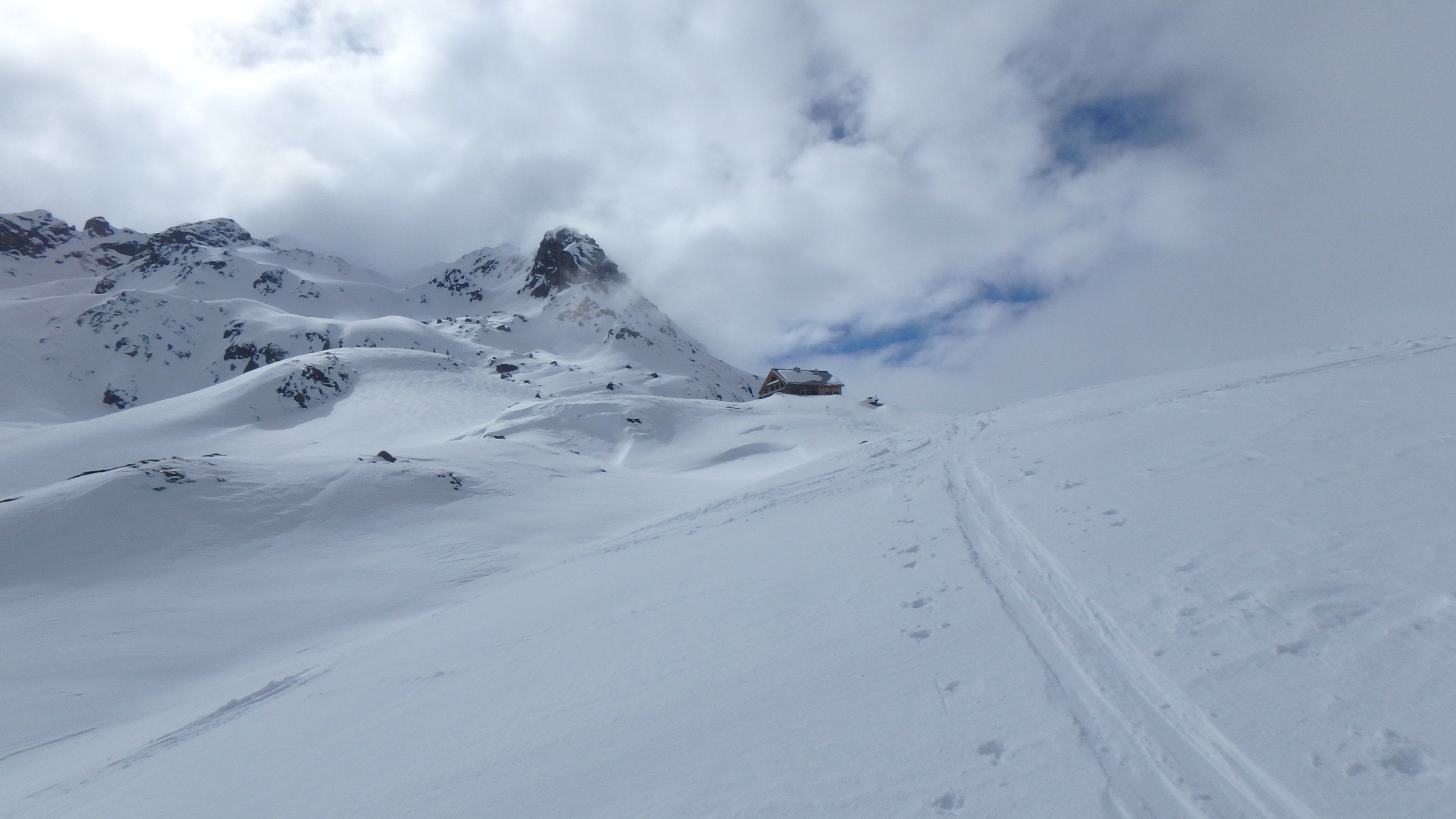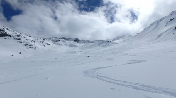 12.3. Beim Wechsel zur finalen Chamanna da Grialetsch hat die Abfahrt zur Alp Funtauna noch ganz gute Sicht. Im zunehmenden Nebel zum Scalettapass, dann weiter zum Scalettahorn (3068m). Merci an unsere Schweizer Tourenkollegen, die mit ebendieser Präzision zum Gipfel spuren. Wir hätten den Piz Grialetsch gerne noch mitgenommen, doch es kommt anders, wir treffen auf die die ungleichen Brüder Glück und Pech, die gerne gemeinsam auftreten. Vom Felsgrat über uns, wir gerade darunter – Steinschlag. Ein ordentlicher Brocken trifft meine Frau an der Wade, zum Glück keine schwerere Verletzung, der selbe Stein trifft mich auch, glücklicherweise nur am Schuhrand. Meine Partnerin fährt dann recht souverän zur Hütte ab, wir sind wieder einigermaßen entspannt.