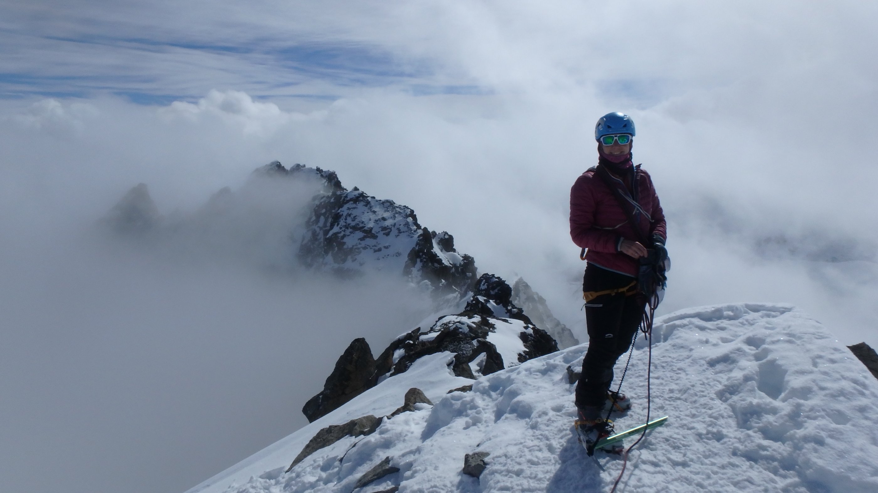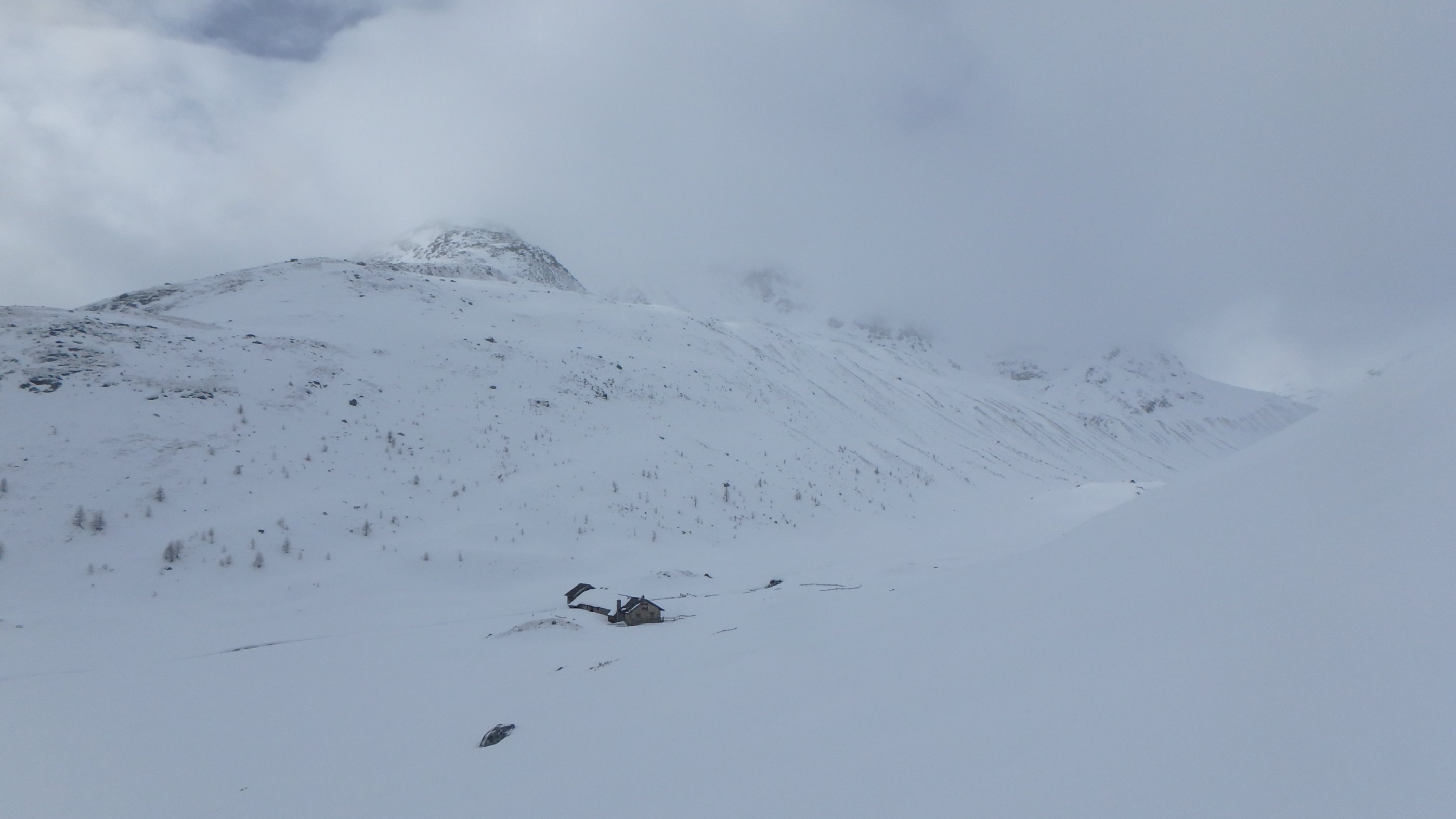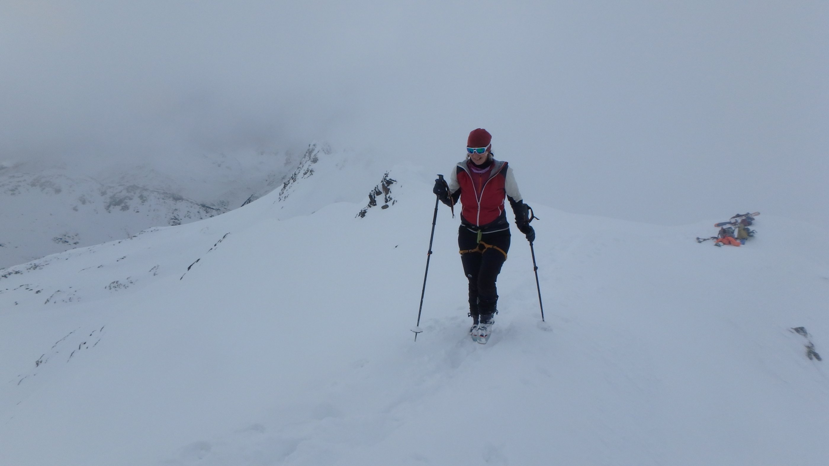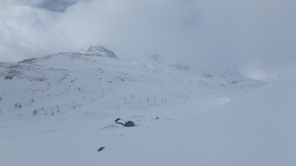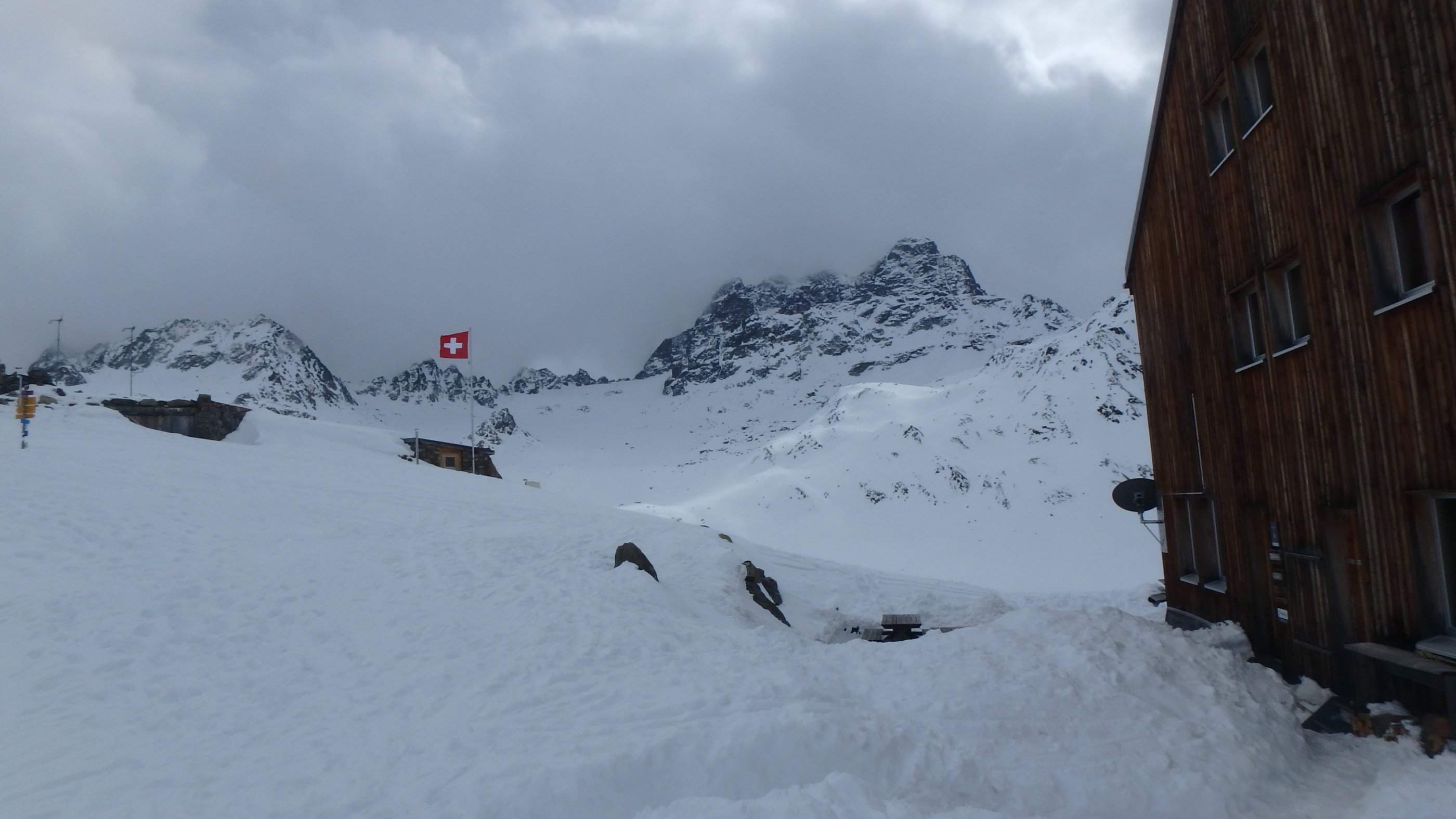 12.3. Beim Wechsel zur finalen Chamanna da Grialetsch hat die Abfahrt zur Alp Funtauna noch ganz gute Sicht. Im zunehmenden Nebel zum Scalettapass, dann weiter zum Scalettahorn (3068m). Merci an unsere Schweizer Tourenkollegen, die mit ebendieser Präzision zum Gipfel spuren. Wir hätten den Piz Grialetsch gerne noch mitgenommen, doch es kommt anders, wir treffen auf die die ungleichen Brüder Glück und Pech, die gerne gemeinsam auftreten. Vom Felsgrat über uns, wir gerade darunter – Steinschlag. Ein ordentlicher Brocken trifft meine Frau an der Wade, zum Glück keine schwerere Verletzung, der selbe Stein trifft mich auch, glücklicherweise nur am Schuhrand. Meine Partnerin fährt dann recht souverän zur Hütte ab, wir sind wieder einigermaßen entspannt.