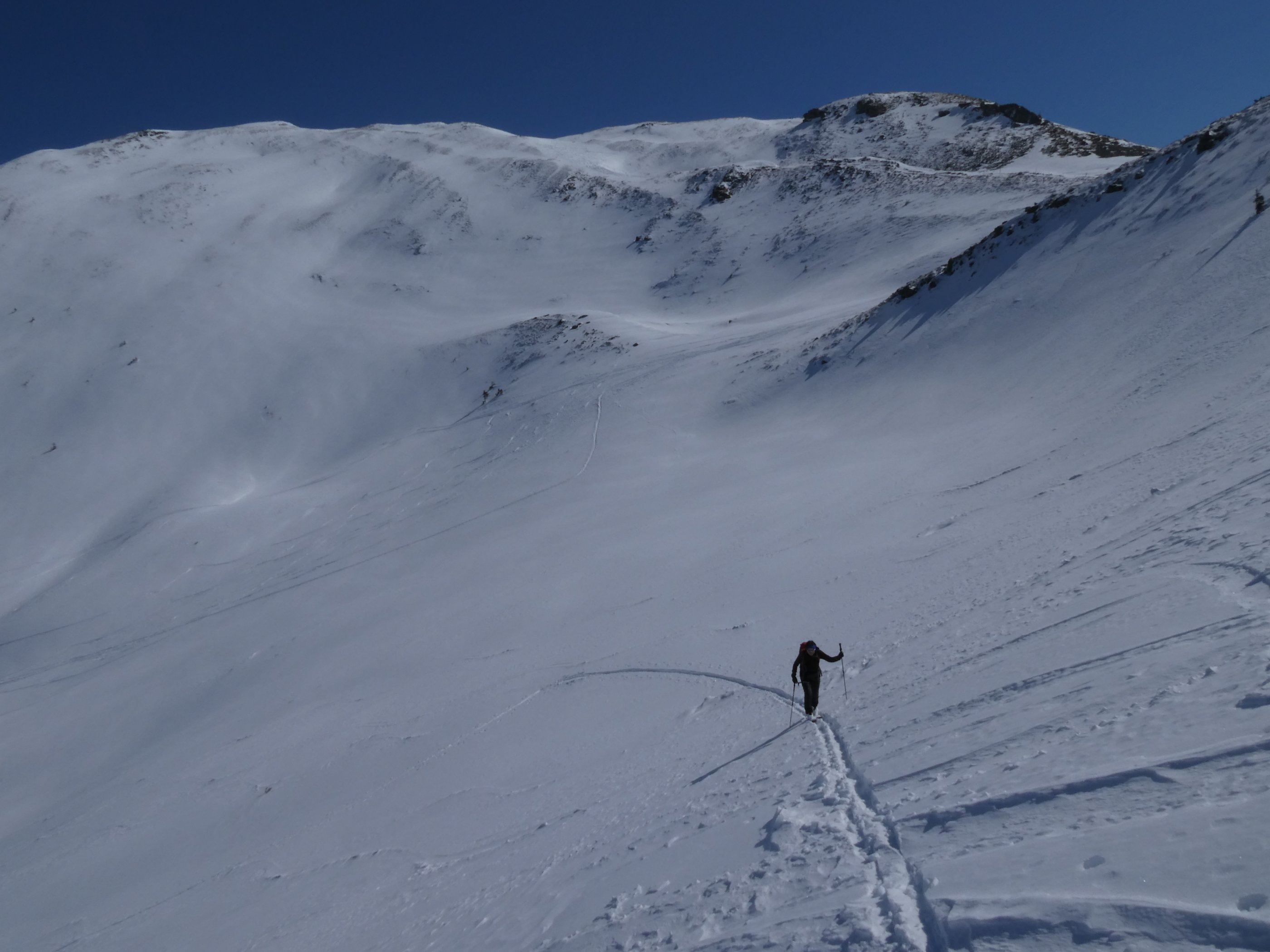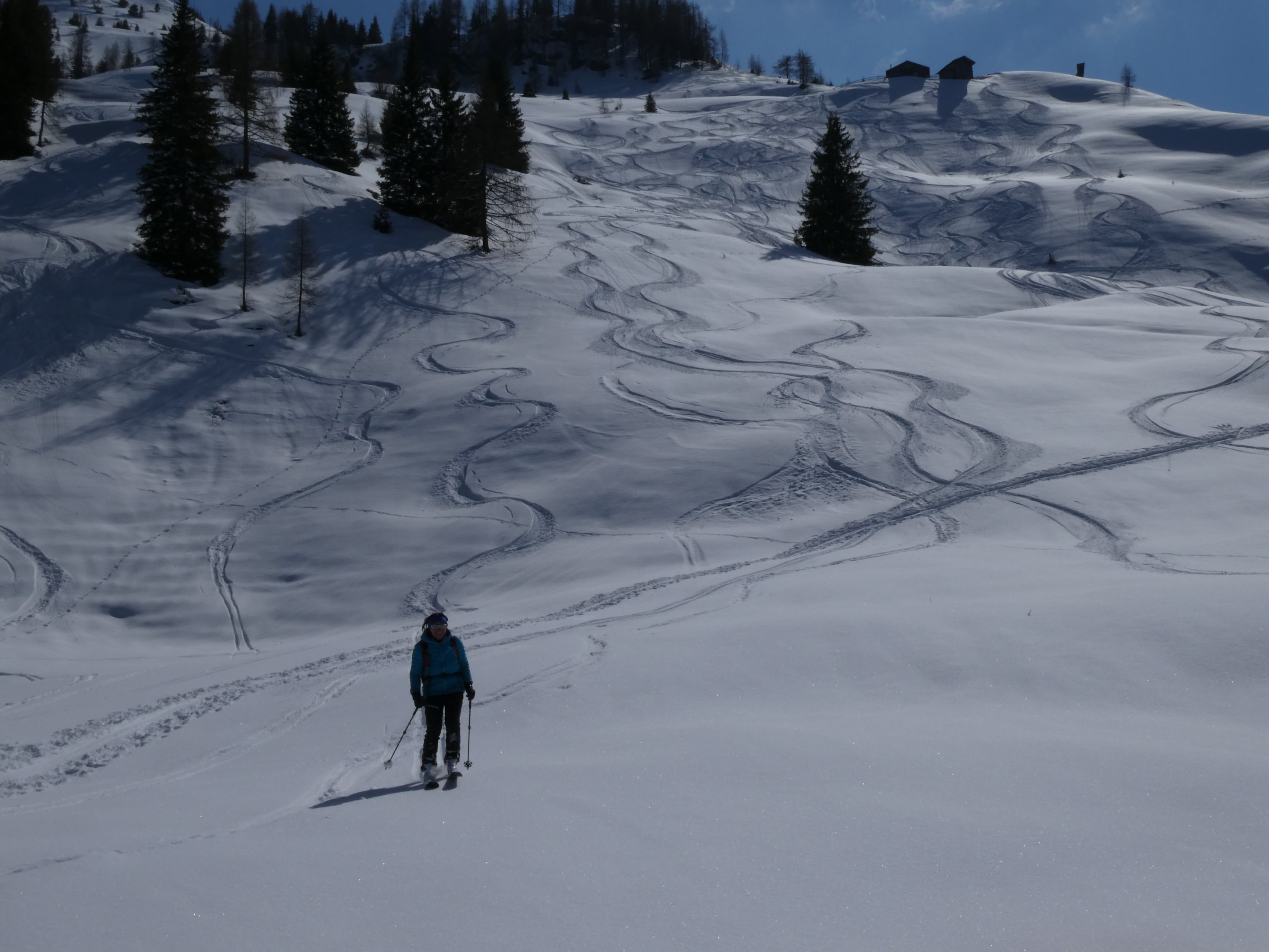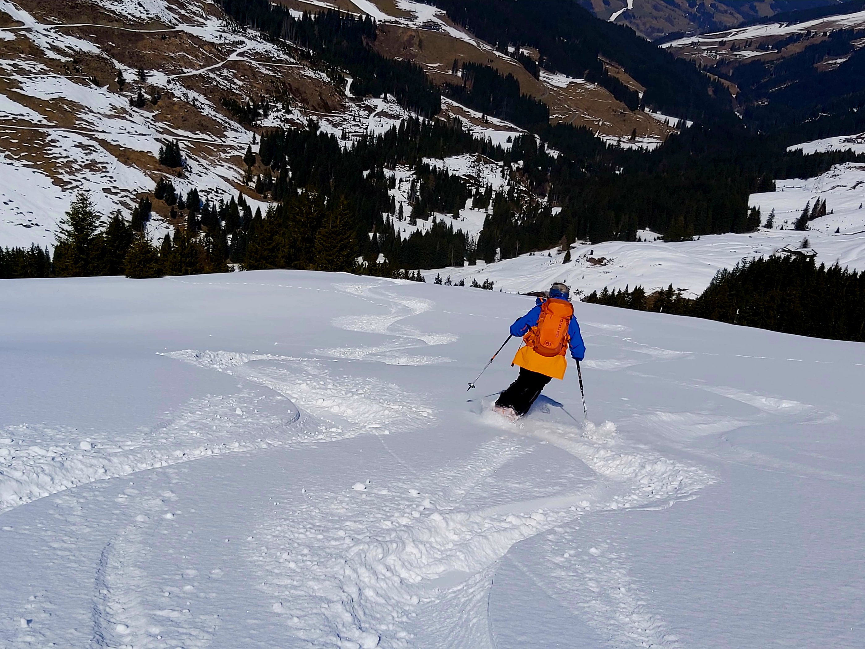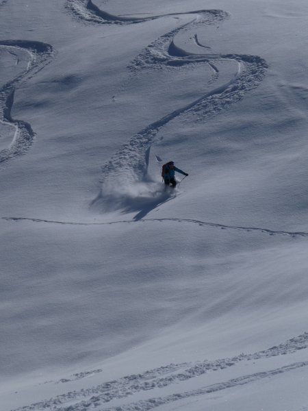 Aus dem Schwarzachengraben (Hinterglemm), vom "oberen" Parkplatz (Anrainer frei) durchgehend ohne Unterbrechung mit Ski. Andrang sehr mäßig, zwei vor uns, zwei hinter uns. Verkehrte Saison! Erst vorige Woche Firn, heute Pulver. West(Gipfel-)hang vom Bärensteigkogel (noch unbefahren) sieht windharschig und vor allem shark-verdächtig aus, so haben wir's beim Lamperbichl belassen und den Bär nicht mehr mitgenommen.