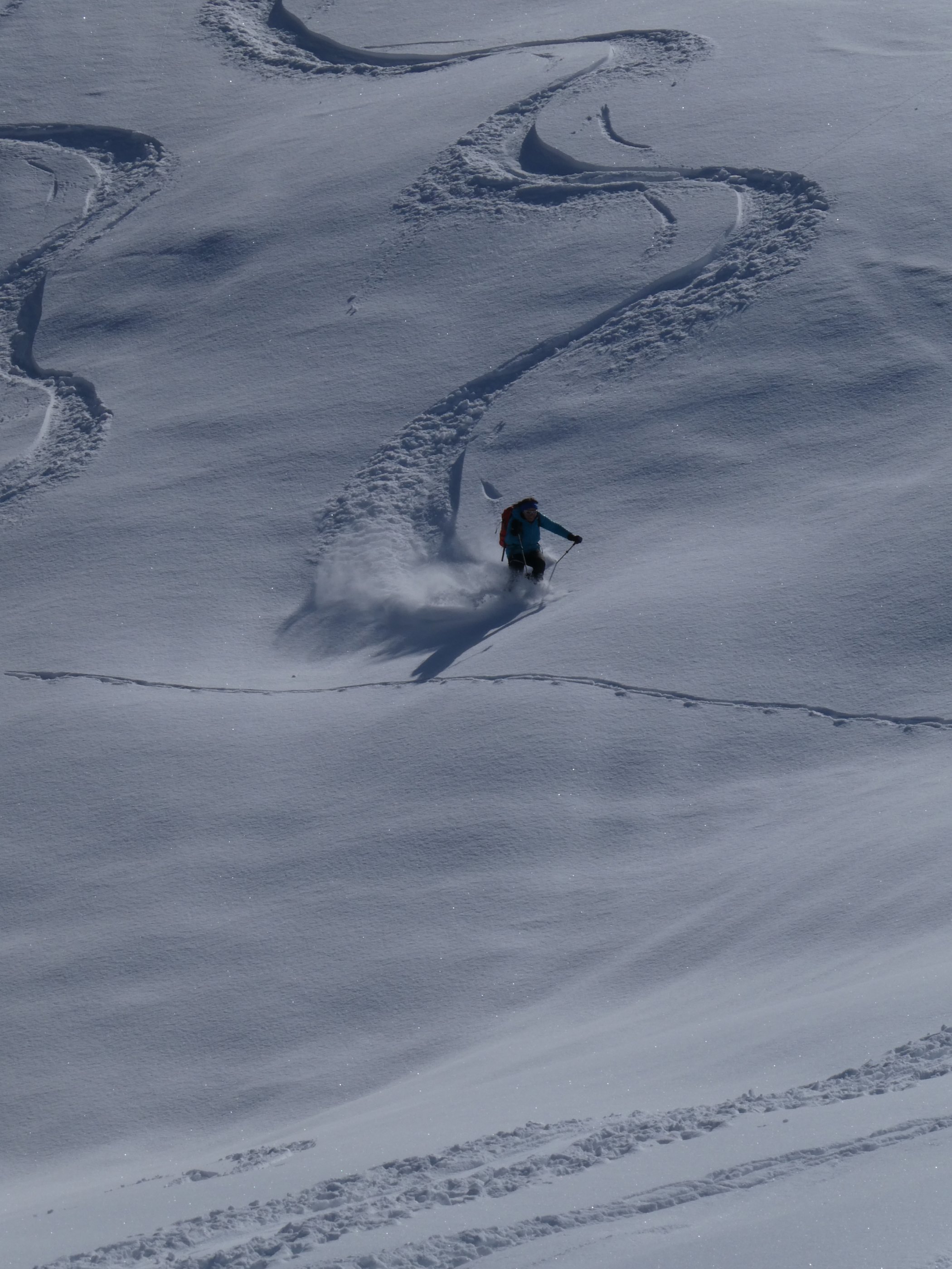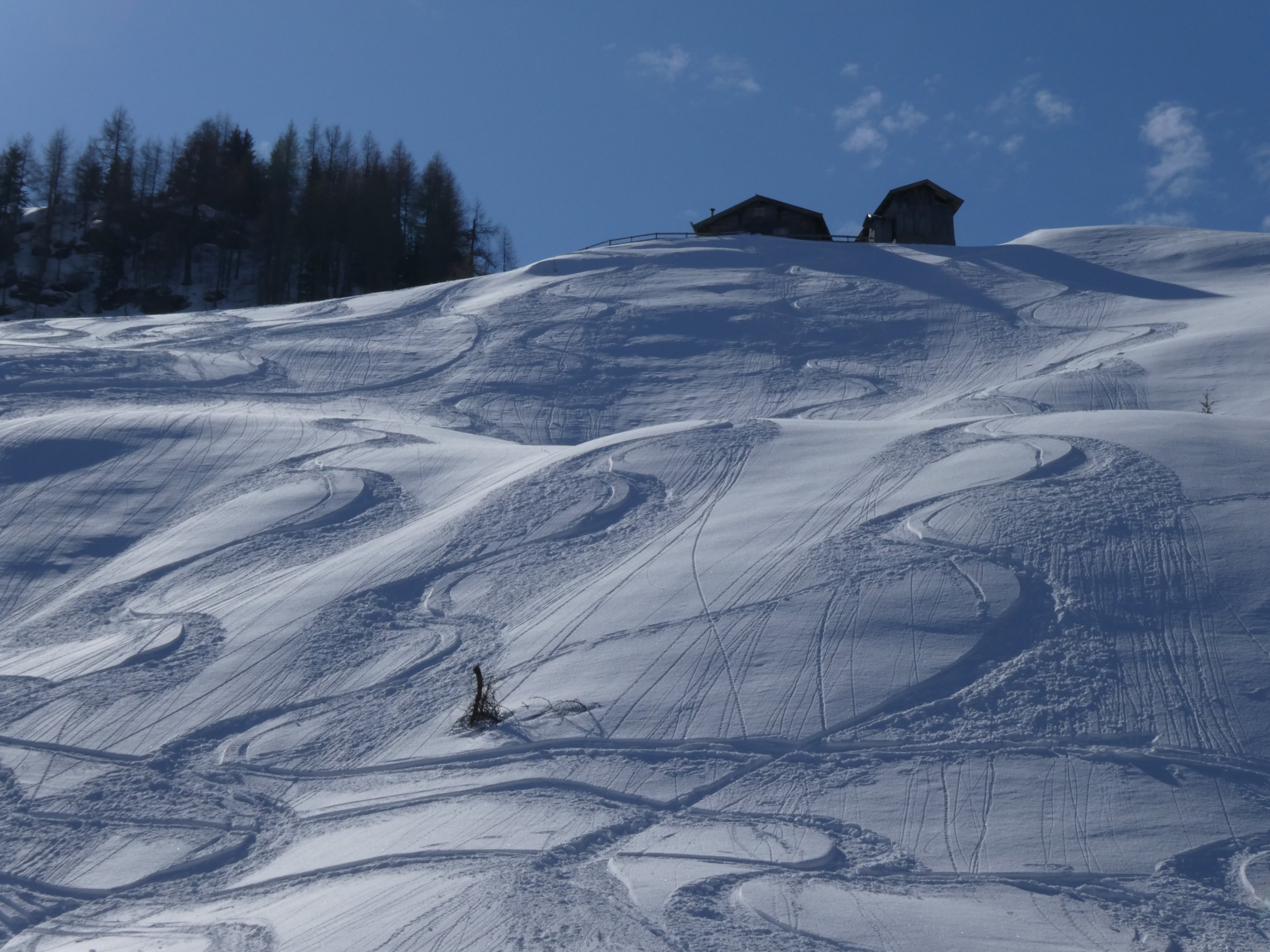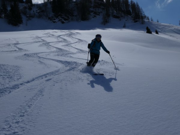 10-30cm trockener, kalter Pulver auf hartem, tragendem Harsch-Untergrund, weitestgehend schön ungebunden, im Gipfelhang leicht windverdichtet, aber alles von oben bis unten wunderschön zu fahren.A Traumtagerl!