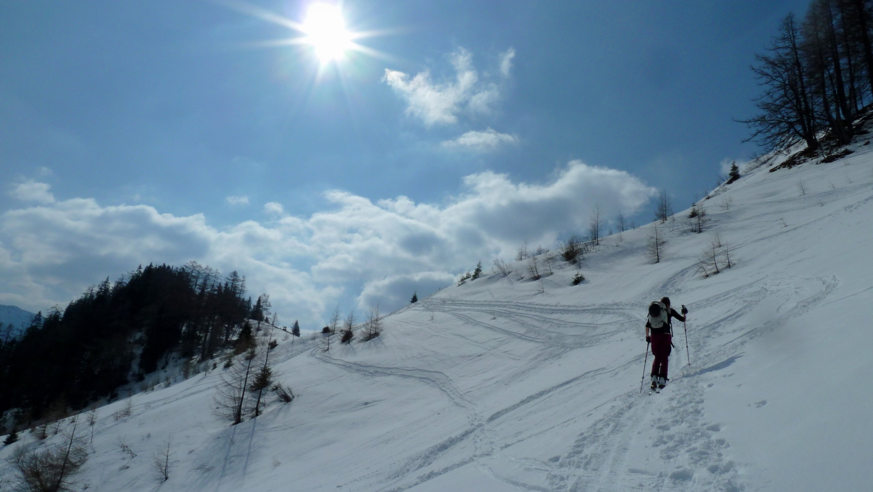 Der Neuschnee vom Wochenanfang ist vor allem sonnseitig schwer geworden, der Harschdeckel darunter trägt gut.