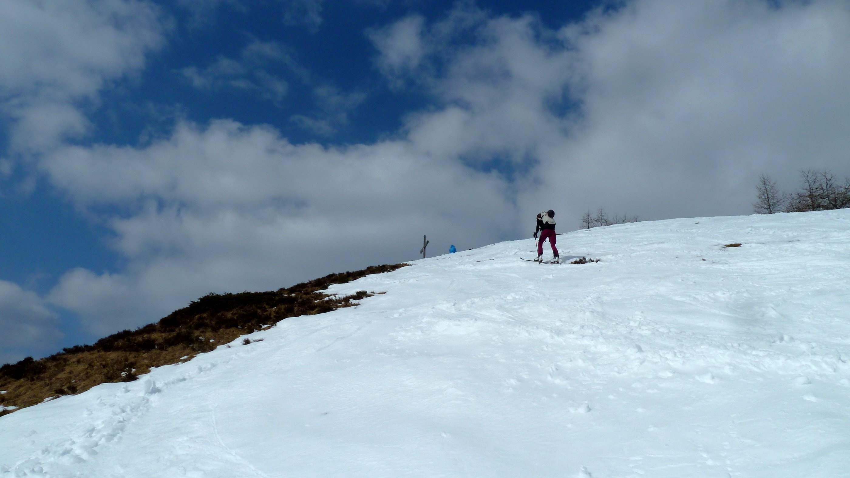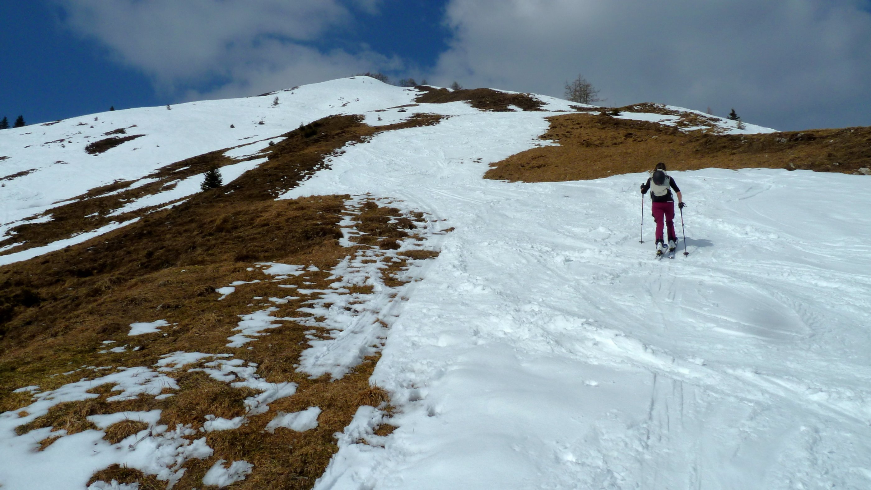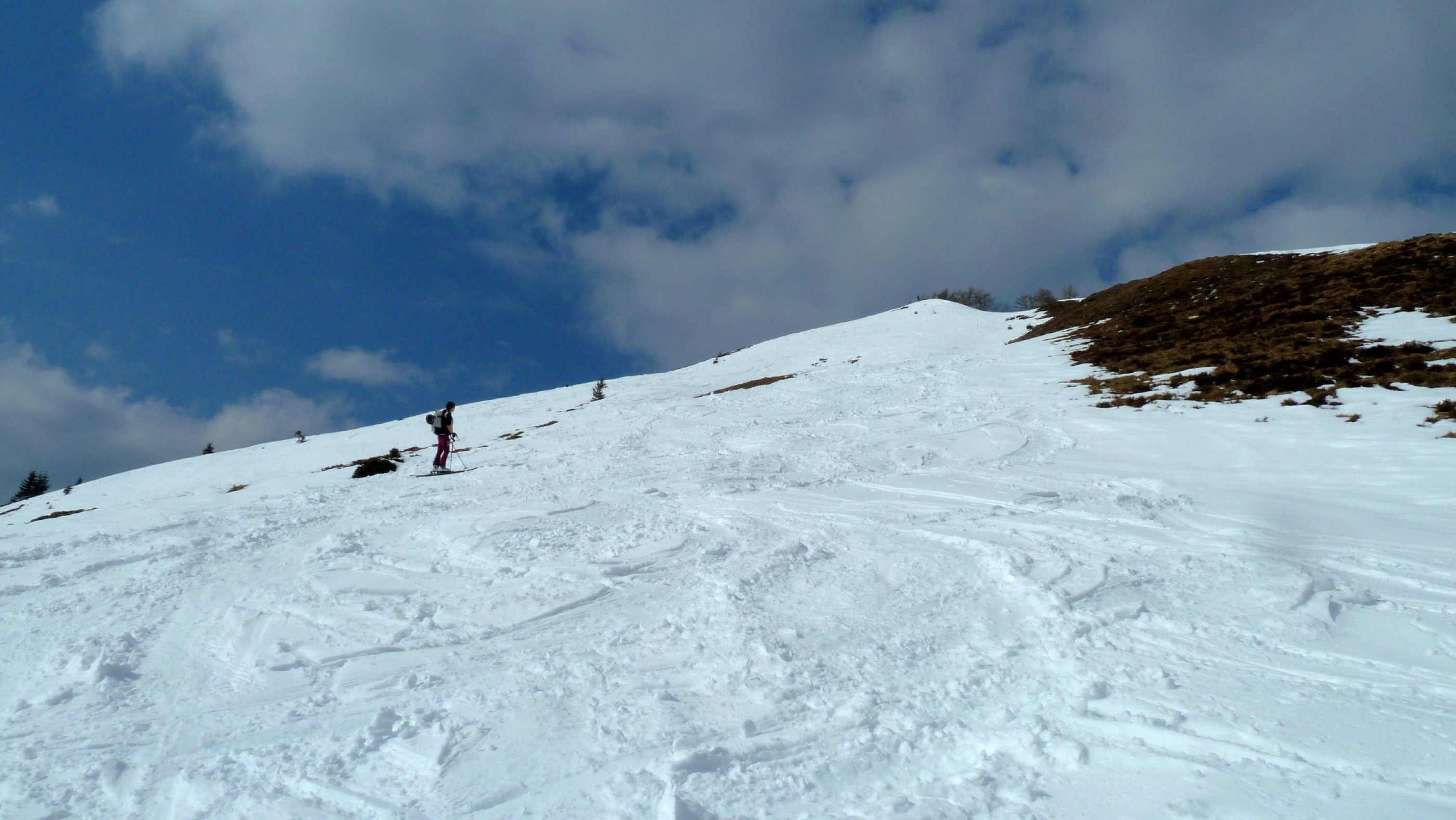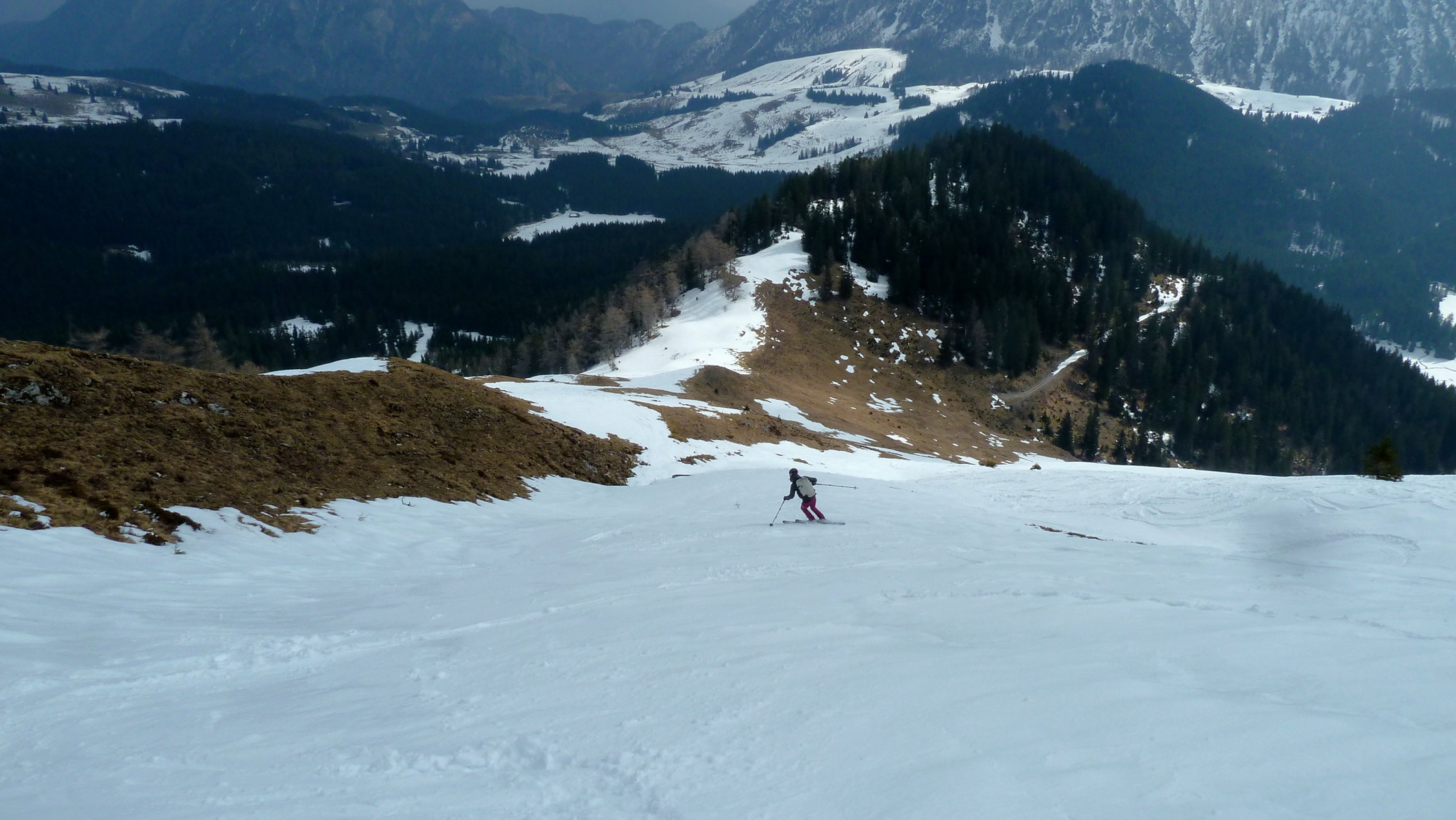 Auf der Postalm ist der Liftbetrieb eingestellt, die Loipen werden nicht mehr gespurt, die Gastronomie macht Saisonpause, aber eine Versuchs-Frühlings-Schitour ist noch möglich. In den Waldstücken müssen im Aufstieg nur einige wenige apere Stellen gequert werden, danach herrschen schattseitig schöne Winterbedingungen, im Gipfelhang ist zwischen den aperen Flächen ein durchgängiger Aufstieg in Weiß möglich. Die Gipfelrast fällt im stürmischen Wind heute kurz aus, die Abfahrt bietet sehr unterschiedliche Bedingungen.