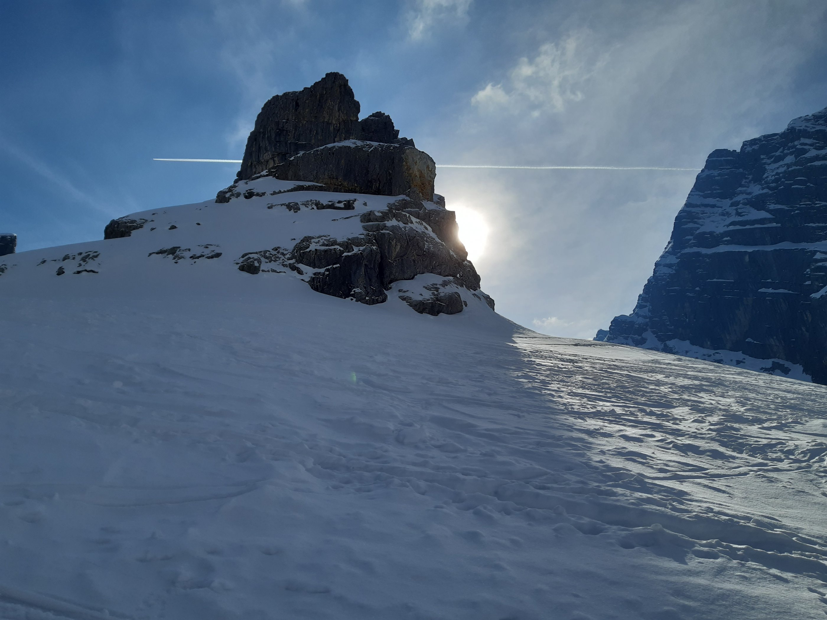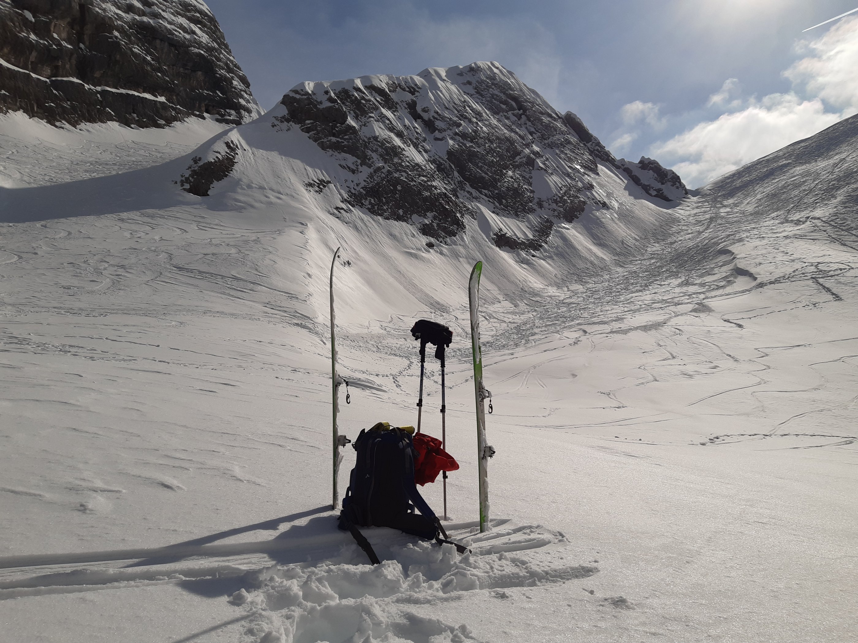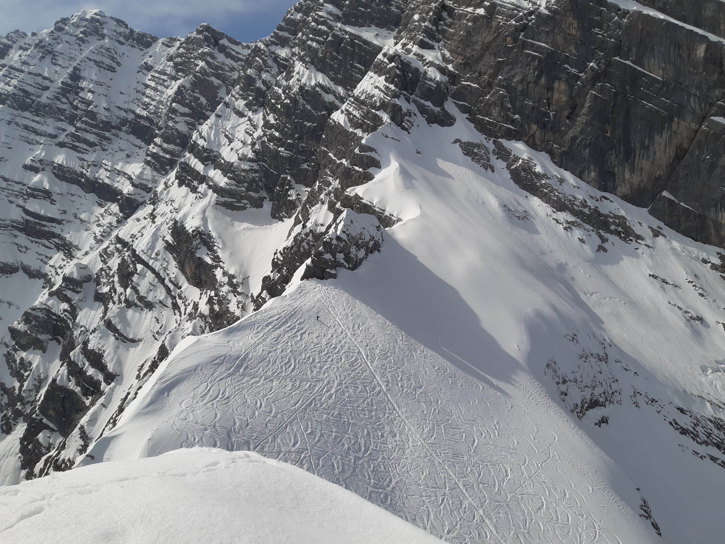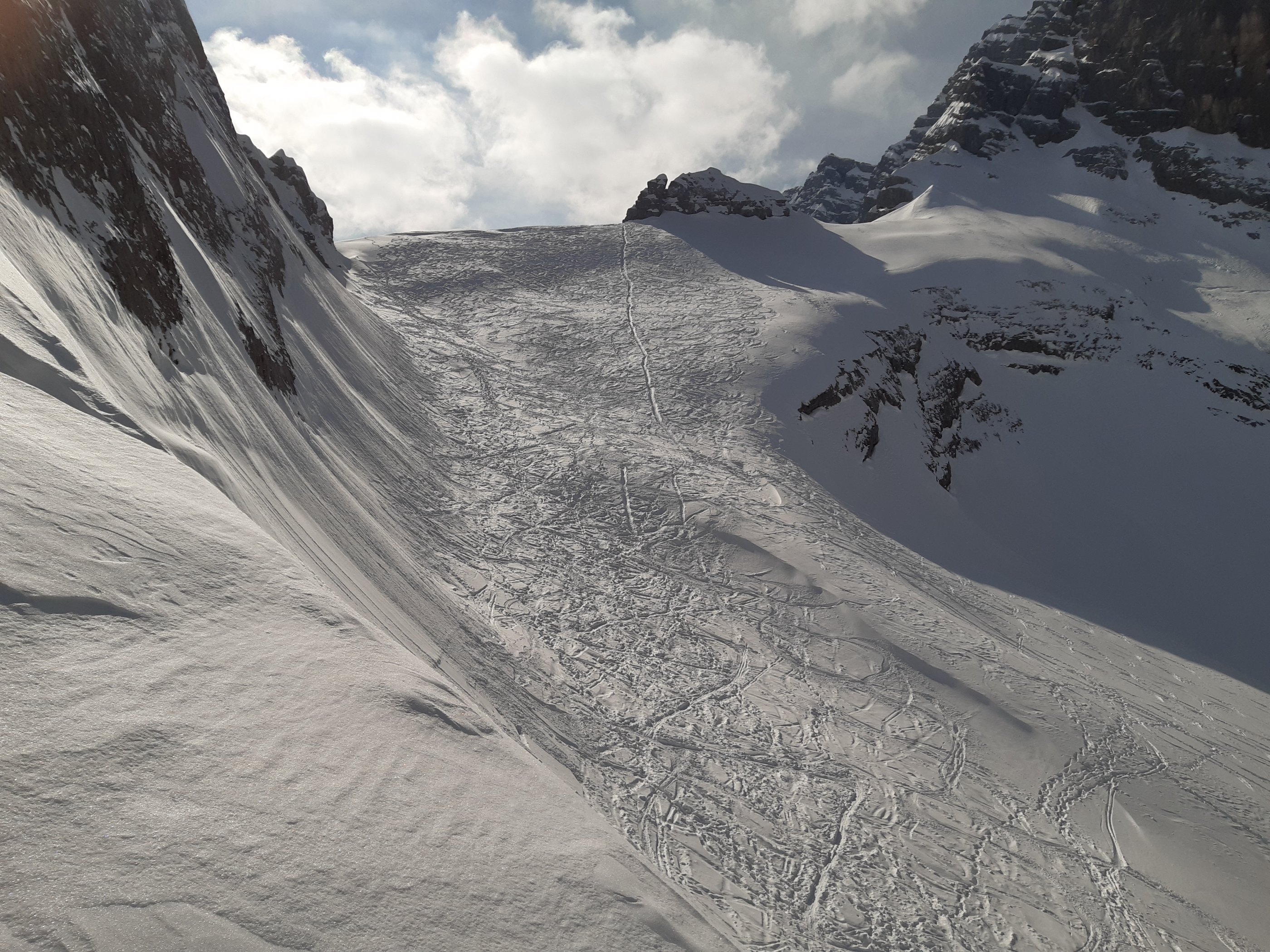 Diesmal gab's auch keinen kalten Wind, die Wetterbedingungen waren perfekt. Der Schnee schon ziemlich zerfahren, aber auch immer noch unzerstörte Bereiche mit Pulver zu finden. Ein Genuss.