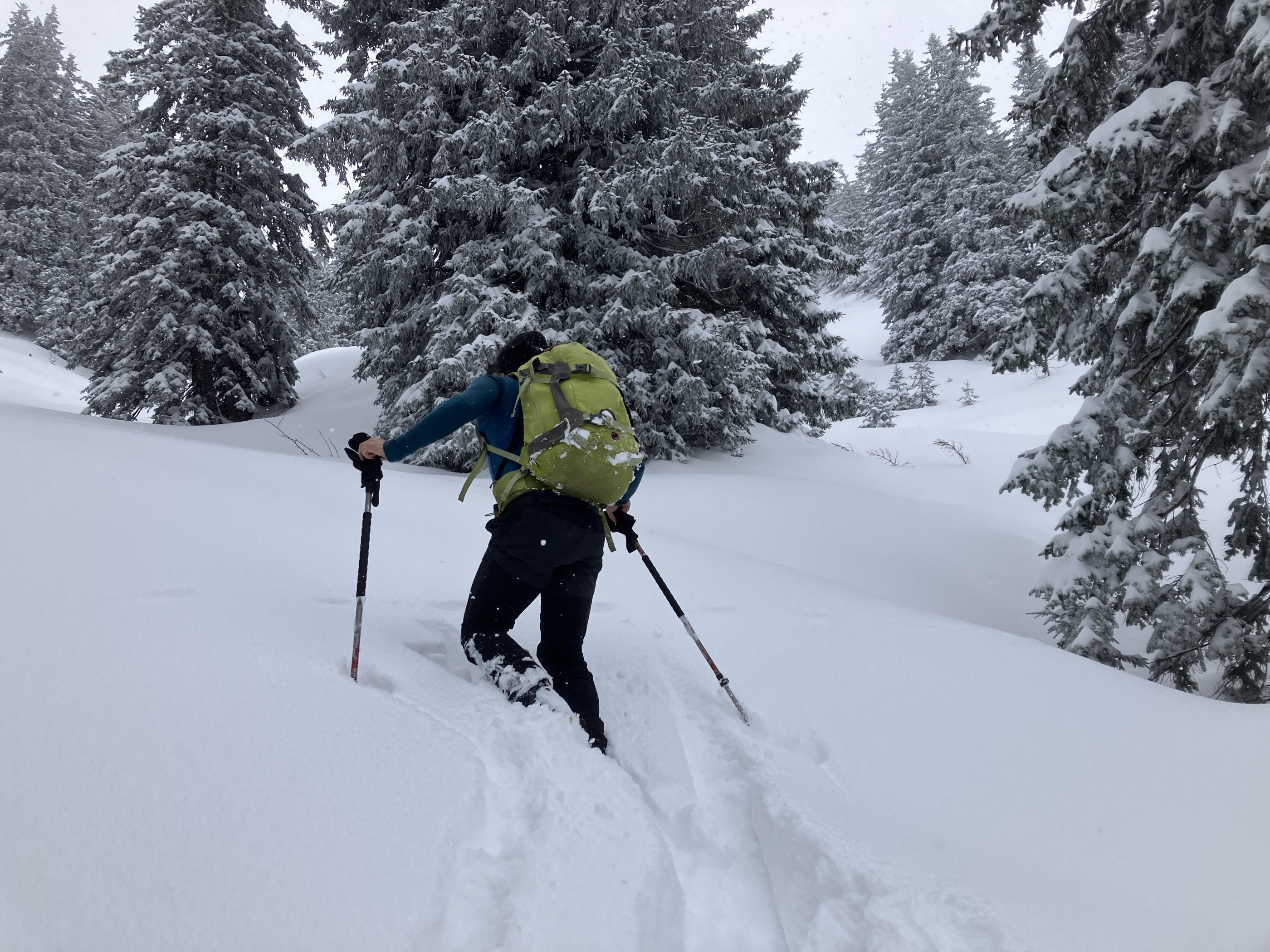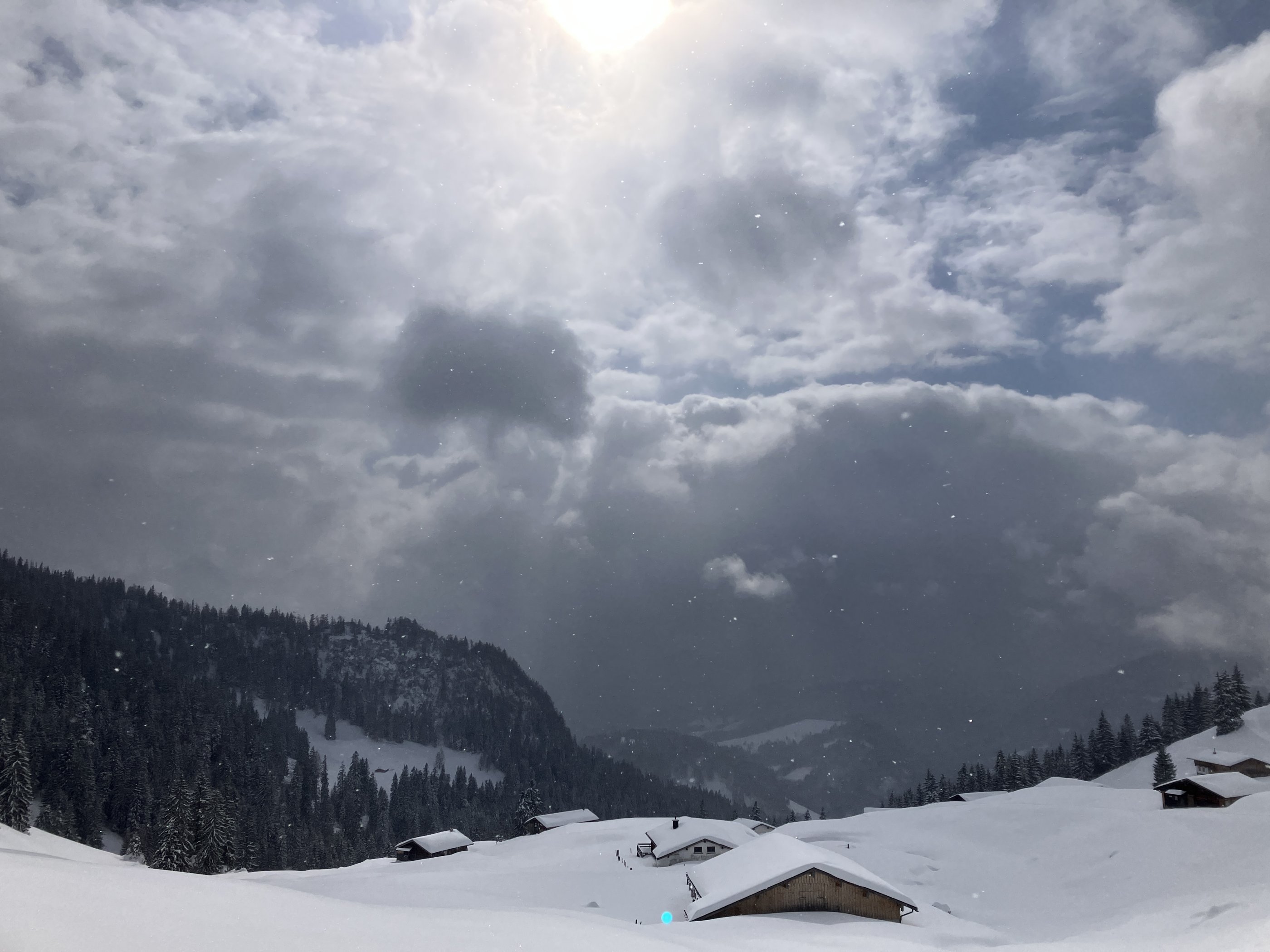 Umso größer war heute die Überraschung im Heutal: Schon ab dem Parkplatz Heutalbauern lagen gut 30 cm kompakter Pulverschnee – von unten weg schon anstrengend zum Spuren. Ab den Almen wurden es eher 40 bis 50 cm. Eine wirklich zähe Partie. Zum Glück bekamen wir im unteren Drittel des Sonntagshorn-Hangs noch Unterstützung von einer dritten Person.