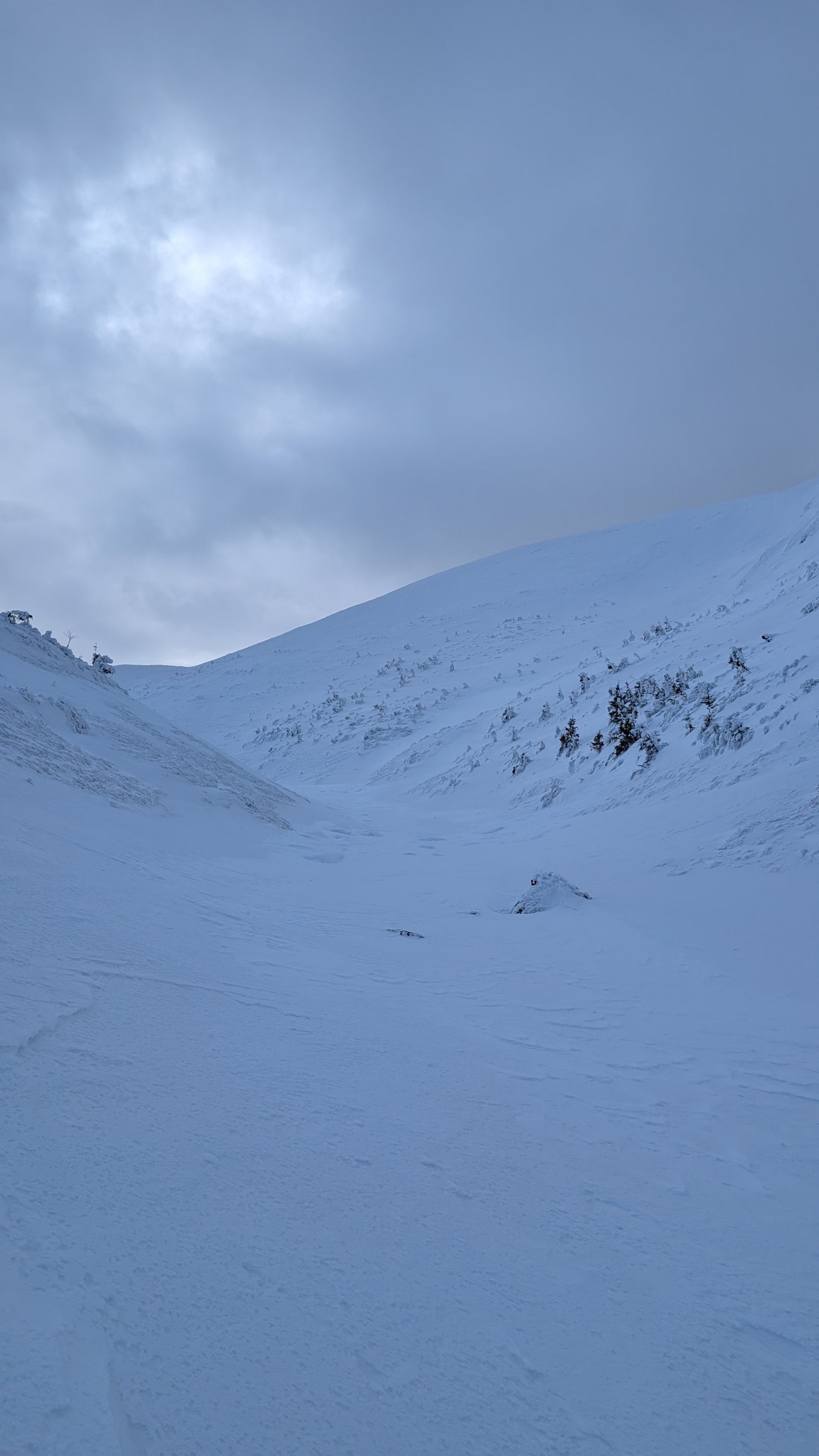 Schnee durchgehend, aber bis 1500 m sehr patzig und schwer, danach besser. Latschen nicht zufriedenstellend mit Schnee bedeckt.