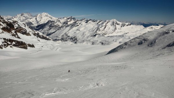 4 traumhafte Skihochtourentage Anfang April im Wallis. Zwischen Zermatt und Saas Fee, mit Stützpunkten Monte Rosa Hütte und Britanniahütte. Große Gletscher, hohe Viertausender, lange Abfahrten, gewaltiges Panorama, herrliches Wetter - was will man mehr!