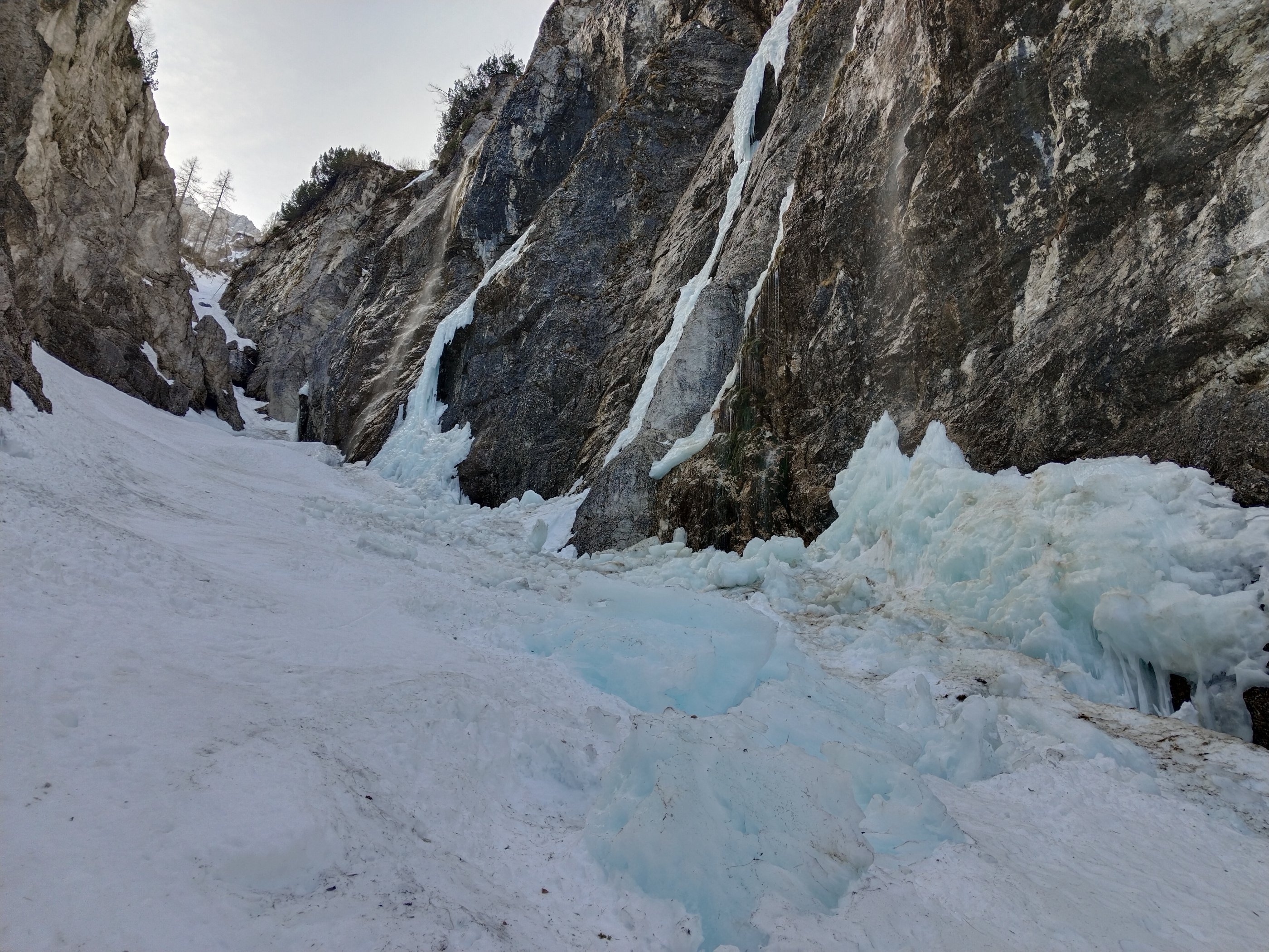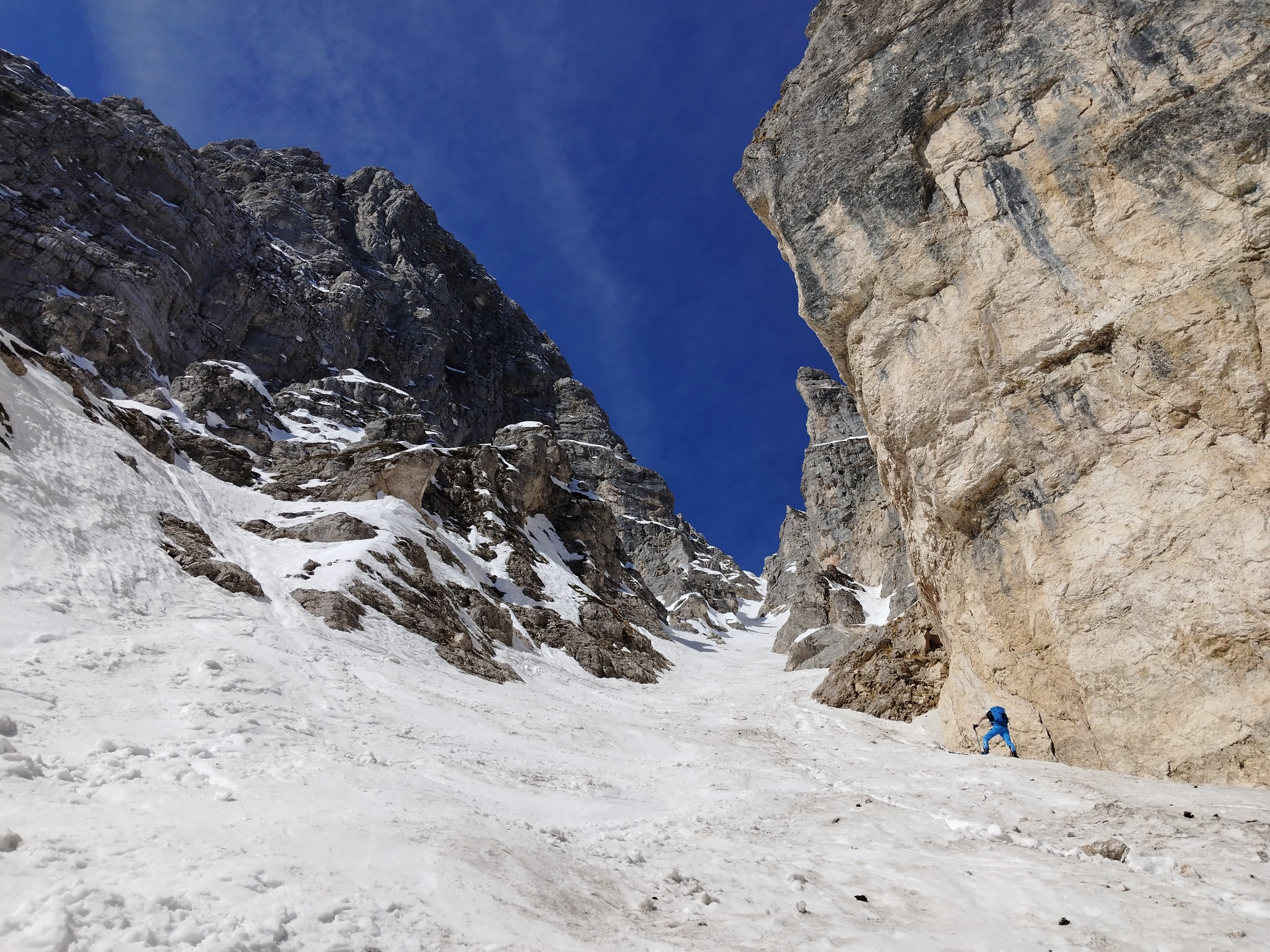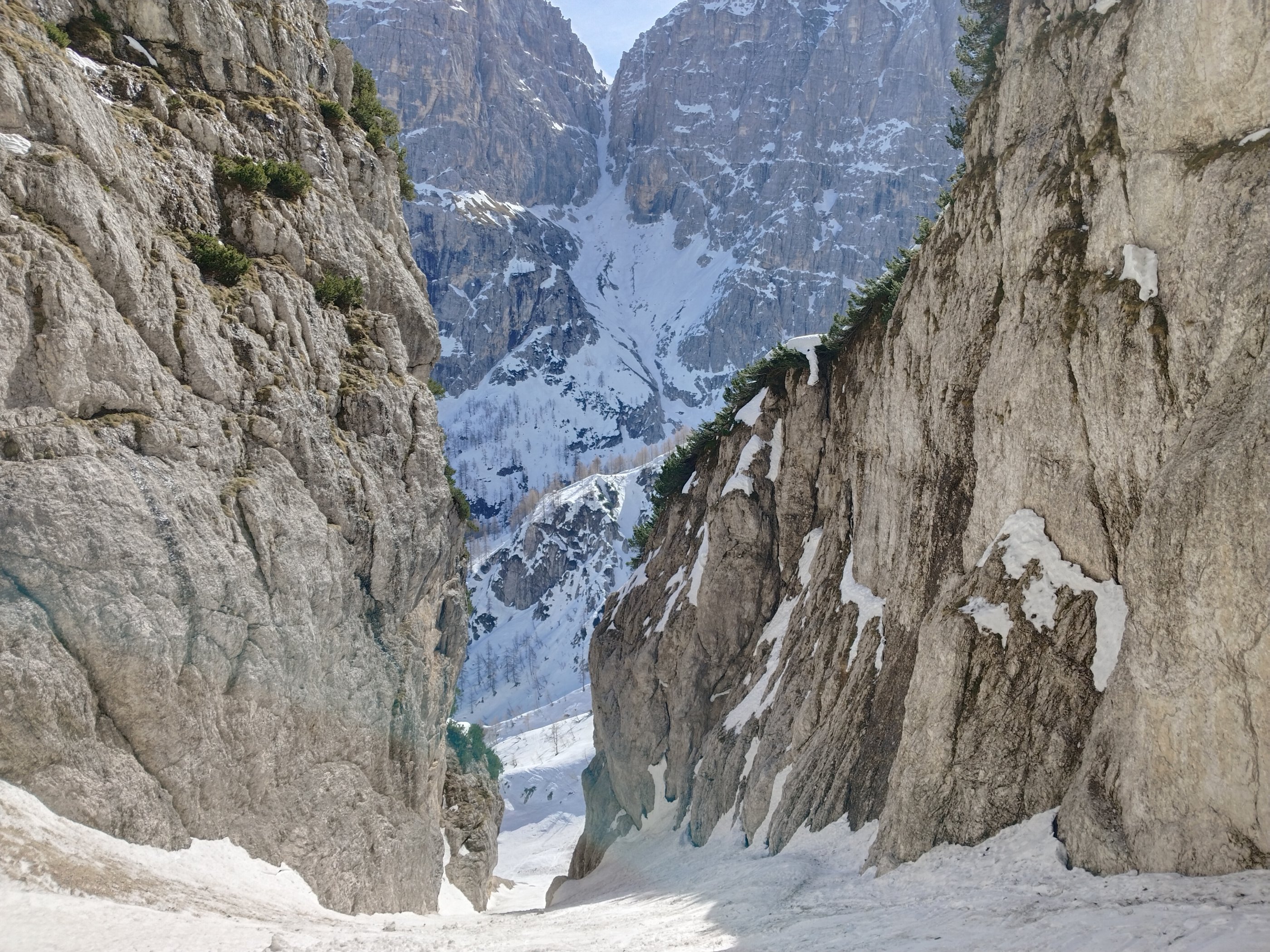 Ausreichend Schnee im Talboden der Seisera, nach dem Talschluss im Waldstück ca 15-20 Minuten Ski tragen, danach soweit ausreichend Schnee, außer die Zustiegsschlucht (wie von Franz S. prophezeit !) war für mich die Schlüsselstelle (!) vor allem in der Abfahrt/Abstieg, da wenig Schnee und großteils vereist. Die Huda Paliza selbst gerade ausreichend Schnee, allerdings etwas Steine durchsät, alte kleinere Schnee Entladungen haben einen sicheren Eindruck vermittelt. Die April Sonne scheint z.t.schon vormittags (NO-O) rein und dadurch wird die Schneedecke schnell tief, aber heute insgesamt noch sehr kompakt und angenehm und relativ sicher für Aufstieg und Abfahrt. Auch der Rinne Ausstieg ging besser als erwartet. In Summe haben nicht so große Schneemengen den Vorteil dass es keine großen lästigen Lawinenknollen auf der Route gab.